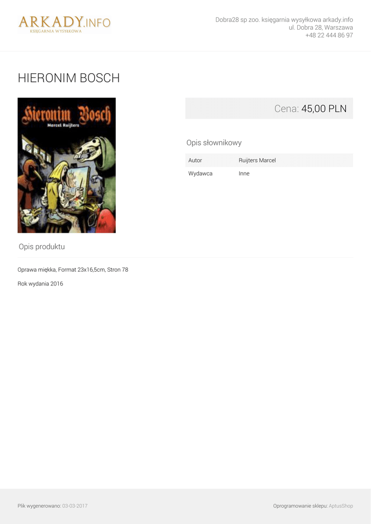Dobra28 sp zoo. księgarnia wysyłkowa arkady.info ul. Dobra 28, Warszawa +48 22 444 86 97 HIERONIM BOSCH Cena: 45,00 PLN Opis słownikowy Autor Ruijters Marcel Wydawca Inne Opis produktu Oprawa miękka, Format 23x16,5cm, Stron 78 Rok wydania 2016 Plik wygenerowano: 03-03-2017 Powered by TCPDF (www.tcpdf.org) Oprogramowanie sklepu: AptusShop