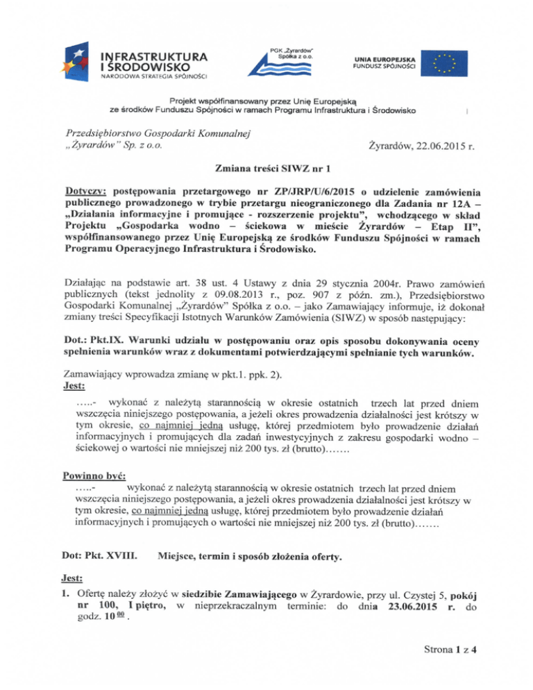 Zmiana treści SIWZ nr 1 - BIP Przedsiębiorstwa Gospodarki