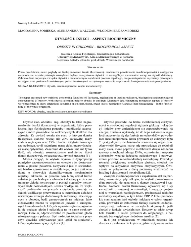 Nowiny Lekarskie 2012, 81, 4, 376–380 MAGDALENA SOBIESKA, ALEKSANDRA WALCZAK, WŁODZIMIERZ SAMBORSKI OTYŁOŚĆ U DZIECI – ASPEKT BIOCHEMICZNY OBESITY IN CHILDREN – BIOCHEMICAL ASPECT Katedra i Klinika Fizjoterapii, Reumatologii i Rehabilitacji Uniwersytet Medyczny im. Karola Marcinkowskiego w Poznaniu Kierownik Katedry i Kliniki: prof. dr hab. Włodzimierz Samborski Streszczenie Praca przedstawia nowe poglądy na funkcjonowanie tkanki tłuszczowej, mechanizm powstawania insulinooporności i następstwa metaboliczne, a także patologie narządowe będące następstwem otyłości, ze szczególnym zwróceniem uwagi na otyłość dziecięcą. Zebrano dane dotyczące związku otyłości z molekularnymi aspektami procesu zapalnego, czego następstwem są zmiany patologiczne najpierw na poziomie komórkowym, potem tkankowym i narządowym, wreszcie na poziomie funkcjonowania całego organizmu. SŁOWA KLUCZOWE: otyłość, insulinooporność, zespół metaboliczny. Summary The paper presented new opinions concerning functions of fat tissue, mechanism of insulin resistance, biochemical and pathological consequences of obesity, with special attention paid to obesity in children. Literature data concerning molecular aspects of obesity were presented, to show alterations occurring on cellular, tissue, organ levels, respectively, and as final consequence – in the functioning of the whole organism. KEY WORDS: obesity, insulin-resistance, metabolic syndrome Otyłość (łac. obesitas, ang. obesity) to takie nagromadzenie tkanki tłuszczowej w organizmie, które przekracza jego fizjologiczne potrzeby i możliwości adaptacyjne i może prowadzić do niekorzystnych skutków dla zdrowia. Za otyłość uważa się stan, w którym tkanka tłuszczowa stanowi więcej niż 20% całkowitej masy ciała u mężczyzn oraz 25% u kobiet. Otyłości towarzyszy nadwaga, czyli nadmierna masa ciała, przewyższająca masę optymalną. Znaczenie dla otyłości ma nie tylko ilość, ale również rozmieszczenie nadmiernej ilości tkanki tłuszczowej, zwłaszcza tzw. otyłość brzuszna [1]. Można przyjąć, że otyłość wynika z dysproporcji pomiędzy zapotrzebowaniem na energię a jej dostarczaniem w postaci pokarmu. Oczywiście jest to stwierdzenie bardzo uproszczone w świetle tego, co już dziś wiadomo o niezwykle skomplikowanym mechanizmie regulacji łaknienia. W procesie tym biorą udział liczne substancje, pochodzące z obwodu i docierające do centralnego układu nerwowego w postaci sygnałów nerwowych bądź hormonalnych. Jednak wydaje się, że większość problemów związanych z otyłością powstaje na skutek wadliwego przetwarzania w centralnym układzie nerwowym szeregu dodatkowych informacji docierających z obwodu, bądź generowanych na miejscu. Jako ciekawostkę można tu wspomnieć jedynie o endogennych kannabinoidach, których wysokie stężenia pojawiają się podczas głodu i oddziałują na te same struktury mózgu, które są odpowiedzialne za powstawanie głodu nikotynowego u palaczy. Być może jest to jedna z przyczyn zjawiska opisywanego jako „głód na słodycze”, które często towarzyszy otyłości [1]. PRACE POGLĄDOWE Otyłość prowadzi do braku metabolicznej elastyczności w swobodnej regulacji stężenia glukozy i oksydacji lipidów przy zmieniającym się zapotrzebowaniu na energię. Badania wykazały, że do tego zakłócenia regulacji przyczynia się dysfunkcja mitochondriów, powodująca insulinooporność, która prowadzi do cukrzycy typu 2 i jest jednym z mechanizmów starzenia się organizmu. Aktywność fizyczna, nawet nie prowadząca do redukcji masy ciała, może poprawić metabolizm dzięki nasileniu syntezy mitochondrialnego DNA, wzmożeniu transportu elektronów wzdłuż łańcucha oddechowego i podwyższeniu poziomu mitochondrialnej kardiolipiny. Powoduje również zwiększony metabolizm glukozy, chociaż nie wpływa na aktywność enzymów oksydacyjnych. Ćwiczenia w połączeniu z dietą podnoszą wrażliwość na insulinę i elastyczność metabolizmu [2]. Związek insulinooporności z zapaleniem stał się bardziej zrozumiały, gdy odkryto, że otyłość powodowana dietą prowadzi do zapalenia w tkance tłuszczowej i wątrobie. Komórki tkanki tłuszczowej wywodzą się z tej samej linii rozwojowej co makrofagi, i mogą, przynajmniej w warunkach patologicznych, produkować niektóre mediatory zapalenia, w tym także CRP. Z kolei przewlekły stan zapalny, jaki otyłość indukuje w całym organizmie, prowadzi do zaburzenia funkcji siateczki endoplazmatycznej, zwłaszcza w narządach aktywnych, jeśli chodzi o funkcje wydzielnicze. Dotyczy to także wysp beta trzustki, a zatem prowadzi do względnego, a następnie bezwzględnego niedoboru insuliny [3]. IL-6 jest produkowana w mięśniach podczas ich skurczu i uwalniana do krążenia, gdzie wpływa na meta- Otyłość u dzieci – aspekt biochemiczny bolizm, aktywując lub hamując liczne geny, prowadząc do lipolizy i spalania tłuszczów, zwiększonej wrażliwości na insulinę i supresji TNFalfa. Tkanka tłuszczowa składa się z różnych komórek, w tym osiadłych makrofagów, które mogą znacząco się przyczyniać do podtrzymywania stanu zapalnego. Ze względu na pochodzenie adipocytów z linii monocytarnej można się też na nich spodziewać występowania różnych cząsteczek zaangażowanych w procesy odporności wrodzonej, Wykryto na nich na przykład obecność receptora Toll-podobnego (Toll-like receptor, TLR)-4. Receptor ten służy rozpoznawaniu elementów ściany bakteryjnej, między innymi mogą go aktywować lipidy. Wydaje się, że nadmiar endogennych lipidów odłożonych w tkance tłuszczowej może powodować aktywację adipocytów przez TLR4 i prowadzić do odpowiedzi zapalnej. Kolejnym ogniwem łączącym hiperglikemię i zapalenie jest zjawisko powstawania produktów glikacji (nieenzymatycznego przyłączania glukozy do różnych białek osocza i tkanek). Receptory dla końcowy
