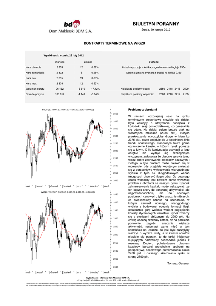 BIULETYN PORANNY środa, 29 lutego 2012 KONTRAKTY TERMINOWE NA WIG20 Wyniki sesji: wtorek, 28 luty 2012 Wartość zmiana System: Kurs otwarcia 2 333 12 0.52% Aktualna pozycja – krótka, sygnał otwarcia długiej– 2354 Kurs zamknięcia 2 332 6 0.26% Ostatnia zmiana sygnału z długiej na krótką 2369 Kurs min. 2 315 19 0.83% Kurs max. 2 338 12 0.52% Wolumen obrotu 26 162 -5 519 -17.42% Najbliższe poziomy oporu: 2350 2418 2448 2500 Otwarte pozycje 133 917 -1 141 -0.84% Najbliższe poziomy wsparcia: 2300 2240 2212 2135 Problemy z obrotami FW20 (2,333.00, 2,338.00, 2,315.00, 2,332.00, +6.00000) 2450 2400 2350 2300 2250 2200 2150 2100 2050 2000 ember October November December 2012 February March WIG20 (2,322.87, 2,328.62, 2,308.22, 2,319.30, +6.02002) 2450 2400 2350 2300 2250 2200 2150 2100 2050 W ramach wczorajszej sesji na rynku terminowym stosunkowo niewiele się działo. Byki walczyły o utrzymanie podejścia z końcówki sesji poniedziałkowej, co generalnie się udało. Na dzisiaj celem będzie atak na wczorajsze maksima (2338 pkt.), których przekroczenie otworzyłoby drogę w kierunku 2375 pkt., gdzie znajduje się 3-tygodniowa linia trendu spadkowego, stanowiąca także górne ograniczenie kanału, w którym rynek porusza się w lutym. O ile kontynuacja oscylacji w jego obrębie nie wydaje się szczególnym wyczynem, zwłaszcza że obecnie sprzyja temu wciąż dobre zachowanie indeksów bazowych i złotego, o tyle problem może pojawić się w momencie, gdy przyjdzie kupującym zmierzyć się z perspektywą wykreowania wiarygodnego wybicia z tych ok. 3-tygodniowych wahań (mogących utworzyć flagę) górą. Od pewnego czasu widoczny jest bowiem coraz wyraźniej problem z obrotami na naszym rynku. Spadek zainteresowania kapitału może wskazywać, że ten będzie skory do ponownej aktywności, ale najprawdopodobniej nie na obecnych poziomach cenowych, tylko znacznie niższych, co zwiększałoby szanse na scenariusz, w którym zamiast udanego, wiarygodnego wybicia z budowanej obecnie formacji flagi, ostatecznie górę weźmie wariant pogłębienia korekty styczniowych wzrostów i rynek zmierzy się z okolicami zbliżonymi do 2200 pkt. Na chwilę obecną czekamy zatem, aż na parkiecie ponownie zagości znacznie większa aktywność, natomiast warto mieć w tym kontekście na uwadze, że jeśli byki zaczęłyby walczyć o wyższe limity, a w kwestii obrotów niewiele się poprawi, to do takiej inicjatywy kupujących należałoby podchodzić jednak z rezerwą. Dopiero potwierdzenie obrotem kazałoby bardziej przychylnie spojrzeć na perspektywę docelowego przekroczenia okolic 2450 pkt. i dalszego skierowania rynku w stronę 2600 pkt. Tomasz Gessner 2000 ember October November December 2012 February March Wydział Analiz i Informacji Dom Maklerski BDM S.A. ul. 3‐go Maja 23, 40‐096 Katowice, Tel.: 032 208 14 12, [email protected] Opracowanie ma charakter czysto informacyjny i zostało opracowany na podstawie informacji uznanych przez autorów za wiarygodne . Zawarte w nim komentarze są subiektywnymi poglądami autorów. Opracowanie i zawarte w nim komentarze nie są podstawą żadnej rekomendacji kupna bądź sprzedaży w rozumieniu obowiązującego prawa i nie powinny być tak interpretowane. Publikowanie w prasie lub w Internecie całości lub części opracowania wymaga zgody sporządzających raport. BIULETYN PORANNY środa, 29 lutego 2012 RYNEK AKCJI Wyniki sesji: wtorek, 28 luty 2012 Kurs max. Zakres wahań Wartość obrotów [mln PLN] 483,4 52 tygodnie Indeks Kurs otwarcia Kurs zamknięcia Zmiana [%] Kurs min. Kurs max. Kurs min. WIG20 2 942.4 2 019.0 2 322.87 2 319.30 0.26% 2 308.22 2 328.62 20.4 sWIG80 12 932.0 8 190.8 10 358.62 10 418.78 0.43% 10 356.24 10 430.65 74.4 31,5 mWIG40 2 993.2 2 054.5 2 481.24 2 475.36 0.77% 2 470.50 2 486.37 15.9 129,2 WIG PL 49 765.2 35 670.7 41 223.93 41 189.72 0.34% 41 152.02 41 223.93 71.9 - WIG 50 501.8 35 349.0 41 617.40 41 605.56 0.34% 41 459.87 41 730.07 270.2 704,1 Spółka Cena [PLN] ASSECOPOL zmiana % Mkt Cap [mln PLN] zmiana % względem WIG20 dzienna 1M 3M 6M dzienna 1M 3M 6M 9.8% 27.9% -0.6% 16.7% 8.4% 33.3% 54.35 4 216 -0.4% 16.1% BANK HANDLOWY 76.40 9 982 0.3% 2.1% 6.7% 17.5% 0.0% 2.7% 5.3% 22.9% BOGDANKA 129.50 4 405 0.5% 4.6% 15.7% 23.0% 0.3% 5.2% 14.4% 28.4% BRE 300.00 12 631 0.0% 1.7% 11.1% 9.1% -0.3% 2.2% 9.7% 14.5% 2.35 1 720 0.9% -3.7% 5.1% -28.1% 0.6% -3.1% 3.7% -22.7% -21.7% GETIN GTC 8.83 1 937 0.8% -16.5% -9.6% -27.0% 0.5% -16.0% -11.0% JSW 104.30 12 433 1.3% -1.6% 14.6% -3.4% 1.0% -1.1% 13.2% 1.9% KERNEL 71.45 5 693 2.1% 4.3% 1.5% 9.1% 1.8% 4.9% 0.1% 14.5% KGHM 146.40 29 280 2.4% 4.9% 10.5% -16.2% 2.1% 5.4% 9.1% -10.9% LOTOS 27.79 3 609 1.0% 6.5% 11.2% -9.9% 0.7% 7.0% 9.8% -4.5% PBG 65.50 936 0.6% -20.1% -11.0% -31.1% 0.4% -19.6% -12.4% -25.7% PEKAO 155.00 40 669 0.1% -1.6% 5.9% 4.8% -0.1% -1.1% 4.6% 10.2% PGE 20.00 37 396 1.8% -2.4% -6.5% -3.1% 1.5% -1.8% -7.9% 2.3% PGNIG 3.65 21 535 0.8% -6.2% -11.4% -10.3% 0.6% -5.6% -12.8% -4.9% PKNORLEN 35.85 15 333 1.0% -2.4% -10.8% -9.4% 0.7% -1.8% -12.2% -4.1% PKOBP 34.00 42 500 -1.0% -2.4% 1.7% -6.2% -1.3% -1.9% 0.4% -0.8% PZU 334.00 28 842 -1.5% 0.0% 4.6% -5.9% -1.7% 0.5% 3.2% -0.5% TAURON 5.16 9 043 -0.6% -4.4% -4.8% -3.4% -0.8% -3.9% -6.2% 2.0% TPSA 16.90 22 572 -0.9% -2.3% -8.6% -2.3% -1.2% -1.8% -10.0% 3.1% TVN 11.15 3 834 -0.4% -0.9% 13.7% -23.5% -0.7% -0.3% 12.3% -18.2% Komentarz po sesji Komentarz przed sesją: WIG20 nie chce rosnąć Średnioterminowy trend niezagrożony Wczorajsza sesja potwierdziła poniedziałkowy „młotek”, choć wciąż inwestorzy zachowują ostrożność biorąc pod uwagę odnotowane obroty czy kształt świeczki. Niewątpliwie rynek czeka na komunikat ECB o wartości LTRO2 (dziś 11:15) czy decyzję ISDA odnośnie wykonania CDS’ów na Grecję (czwartek). W mojej opinii wydarzenia te nie wpłyną istotnie na przebieg sesji. Spodziewana kwota LTRO ma być podobna do tej z grudnia (ok. 500 mld EUR), a ISDA musi stwierdzić „wystrzel