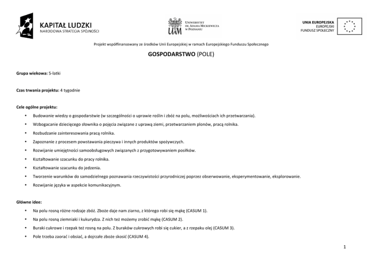 Projekt współfinansowany ze środków Unii Europejskiej w ramach Europejskiego Funduszu Społecznego GOSPODARSTWO (POLE) Grupa wiekowa: 5-‐latki Czas trwania projektu: 4 tygodnie Cele ogólne projektu: • Budowanie wiedzy o gospodarstwie (w szczególności o uprawie roślin i zbóż na polu, możliwościach ich przetwarzania). • Wzbogacanie dziecięcego słownika o pojęcia związane z uprawą ziemi, przetwarzaniem plonów, pracą rolnika. • Rozbudzanie zainteresowania pracą rolnika. • Zapoznanie z procesem powstawania pieczywa i innych produktów spożywczych. • Rozwijanie umiejętności samoobsługowych związanych z przygotowywaniem posiłków. • Kształtowanie szacunku do pracy rolnika. • Kształtowanie szacunku do jedzenia. • Tworzenie warunków do samodzielnego poznawania rzeczywistości przyrodniczej poprzez obserwowanie, eksperymentowanie, eksplorowanie. • Rozwijanie języka w aspekcie komunikacyjnym. Główne idee: • Na polu rosną różne rodzaje zbóż. Zboże daje nam ziarno, z którego robi się mąkę (CASUM 1). • Na polu rosną ziemniaki i kukurydza. Z nich też możemy zrobić mąkę (CASUM 2). • Buraki cukrowe i rzepak też rosną na polu. Z buraków cukrowych robi się cukier, a z rzepaku olej (CASUM 3). • Pole trzeba zaorać i obsiać, a dojrzałe zboże skosić (CASUM 4). 1 Projekt współfinansowany ze środków Unii Europejskiej w ramach Europejskiego Funduszu Społecznego • Z różnych rodzajów mąki piecze się różne rodzaje pieczywa (CASUM 5). Fakty – ciekawostki – opinie, czyli co nauczyciel powinien wiedzieć o temacie: • Kwiatostany zbóż występują pod postacią kłosów lub wiech. Kłosy mają pszenica, żyto i jęczmień. Owies ma wiechę. Kwiatostan męski kukurydzy ma postać wiechy, kwiatostan żeński kukurydzy czyli kolba to przekształcony kłos. • Z ziaren zbóż oprócz mąki produkuje się płatki zbożowe, kasze, otręby, pasze dla zwierząt, a nawet syropy i oleje. Są podstawą także piwowarstwa, gorzelnictwa i farmaceutyki. • Pszenica pochodzi z południowo-‐zachodniej i środkowej Azji. Po kukurydzy i ryżu pszenica zajmuje trzecie miejsce w światowej produkcji zbóż. • Nazwa „chleb razowy” pochodzi od rodzaju mąki, z której chleb jest wytwarzany. Mąka ta jest mielona raz, w dodatku grubo, dlatego zawiera otręby, które wpływają na jej ciemniejszy kolor. Mąka razowa może być zarówno pszenna, jak i żytnia. Mąka biała to mąka przesiewana, pozbawiona otrębów. Chleb razowy zawiera większą ilość błonnika oraz składników mineralnych przez zawartość łupin z ziarna, w których te składniki się znajdują. • Ziemniak pochodzi z Ameryki Południowej. Do Europy przywieźli go Hiszpanie dopiero w XVI wieku. Legenda głosi, że kucharze przygotowujący po raz pierwszy danie z ziemniaka na stół podali jego owoce, a korzenie z bulwami wyrzucili. Po podpaleniu śmieci znaleziono upieczone bulwy ziemniaków, które ktoś zdecydował się spróbować. Tak powstało danie z pieczonego ziemniaka. • Wszystkie części nadziemne ziemniaka są trujące, zawierają substancję zwaną solaniną, która powoduje zatrucia pokarmowe, ma także działanie rakotwórcze. Bulwy po obróbce cieplnej nie zawierają solaniny. Są bardzo pożywne i zawierają sporo witamin, szczególnie witaminy C. • W Poznaniu w pierwszy weekend września obchodzi się Dni Pyrlandii. Świętu temu towarzyszą liczne gry i zabawy z wykorzystaniem ziemniaka. Jest ono okazją do przypomnienia poznańskiej gwary i tradycji. • „Pyra” to w poznańskiej gwarze ziemniak, w innych regionach Polski zwanego np. kartoflem, grulą, korpielem, bulbą, bulwą itd. Propozycje aranżacji przestrzeni: W sali znajdują się wazony z ułożonymi kompozycjami z kłosów różnych zbóż. W rogu sali może stać snop siana. W sali może stać worek ziemniaków, a w jednym z wazonów bukiet z kukurydzy. 2 Projekt współfinansowany ze środków Unii Europejskiej w ramach Europejskiego Funduszu Społecznego 1 CENTRUM BADAWCZE na starcie : • W Centrum Badawczym znajdują się różne pojemniki oraz mąka, cukier, sól, woda. Są tam lupy, za pomocą których dzieci mogą obserwować cząstki poszczególnych produktów. Dzieci mogą bawić się próbując rozpuszczać produkty, przygotowując samodzielnie masę solną i bawiąc się nią. Dzieci mogą tworzyć w mące obrazy. Mogą także bawić się przesypując i sensorycznie badając produkty. Propozycje wycieczek badawczych i wizyt ekspertów: • wycieczka do gospodarstwa lub do muzeum rolnictwa, • wycieczka do cukrowni (w miarę możliwości), • wycieczka do młyna (w miarę możliwości), • wycieczka do piekarni, • wycieczka do sklepu, • wizyta eksperta – rolnika lub piekarza. Do poczytania dzieciom: • Korczakowska Jadwiga, wiersz Dokąd jadą wozy. • Łochocka Hanna, wiersz Co można zrobić z ziemniaka? Inne materiały do wykorzystania podczas realizacji projektu: • nagranie z piosenką Mało nas do pieczenia chleba, 1 W 2. i 3. tygodniu w Centrum będą pojawiać się nowe przedmioty do przeprowadzania samodzielnych doświadczeń (np. po zajęciach, podczas których będą próbowały rozgnieść ziarna na mąkę, w Centrum mogą znaleźć się ziarna i przyrządy do robienia mąki. W późniejszych dniach mogą znaleźć się tam ziemniaki do robienia stempli lub ludków, waga kuchenna do odmierzania produktów itd.). 3 Projekt współfinansowany ze środków Unii Europejskiej w ramach Europejskiego Funduszu Społecznego • nagranie z piosenką ludową Zasiali górale, • nagranie z piosenką Czarny baranie, • film z cyklu Magiczny Autobus: W piekarni. TYDZIEŃ 1 W pierwszym tygodniu odbywają się zajęcia wprowadzające w tematykę projektu. Mają one na celu pobudzenie zainteresowania tematem oraz pokazanie nauczycielowi stanu wiedzy i doświadczeń oraz zasobu słownictwa dzieci. Podczas tego tygodnia dzieci pomagają nauczycielowi de