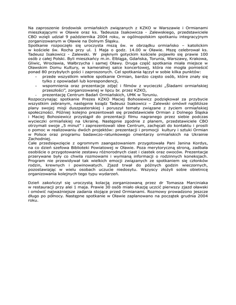 Na zaproszenie środowisk ormiańskich związanych z KZKO w Warszawie i Ormianami mieszkającymi w Oławie oraz ks. Tadeusza Isakowicza - Zalewskiego, przedstawiciele CBO wzięli udział 9 października 2004 roku, w ogólnopolskim spotkaniu integracyjnym zorganizowanym w Oławie na Dolnym Śląsku. Spotkanie rozpoczęło się uroczysta mszą św. w obrządku ormiańsko – katolickim w kościele św. Rocha przy ul. 1 Maja o godz. 14.00 w Oławie. Mszę celebrował ks. Tadeusz Isakowicz - Zalewski. W pięknym gotyckim kościele pojawiło się prawie 100 osób z całej Polski. Byli mieszkańcy m.in. Elbląga, Gdańska, Torunia, Warszawy, Krakowa, Gliwic, Wrocławia, Wałbrzycha i samej Oławy. Druga część spotkania miała miejsce w Oławskim Domu Kultury, w kameralnej salce koncertowej, która nie mogła pomieścić ponad 80 przybyłych gości i zaproszonych. Cel spotkania łączył w sobie kilka punktów: - przede wszystkim wielkie spotkanie Ormian, bardzo często osób, które znały się tylko z opowiadań lub korespondencji, - wspomnienia oraz prezentacje zdjęć i filmów z wycieczki „Śladami ormiańskiej przeszłości”, zorganizowanej w lipcu br. przez KZKO, - prezentację Centrum Badań Ormiańskich, UMK w Toruniu. Rozpoczynając spotkanie Prezes KZKO Maciej Bohosiewicz podziękował za przybycie wszystkim zebranym, następnie ksiądz Tadeusz Isakowicz – Zalewski omówił najbliższe plany swojej misji duszpasterskiej i poruszył tematy związane z życiem ormiańskiej społeczności. Później kolejno prezentowali się przedstawiciele Ormian z Dolnego Śląska i Maciej Bohosiewicz przystąpił do prezentacji filmu nagranego przez siebie podczas wycieczki ormiańskiej na Ukrainę. Następnie zgodnie z planem, przedstawiciele CBO otrzymali swoje „5 minut” i zaprezentowali idee Centrum, zachęcali do kontaktu i prosili o pomoc w realizowaniu dwóch projektów: prezentacji i promocji kultury i sztuki Ormian w Polsce oraz programu badawczo-ratunkowego cmentarzy ormiańskich na Ukrainie Zachodniej. Całe przedsięwzięcie z ogromnym zaangażowaniem przygotowała Pani Janina Kordys, na co dzień szefowa Biblioteki Powiatowej w Oławie. Poza merytoryczną stroną, zadbała osobiście o przygotowanie zestawu różnorodnych ciast i ciastek oraz owoców. Prezentacje przerywane były co chwila rozmowami i wymianą informacji o rodzinnych koneksjach. Program nie przewidywał tak wielkich emocji związanych ze spotkaniem się członków rodzin, krewnych i powinowatych. Zjazd trwał do późnych godzin wieczornych, pozostawiając w wielu osobach uczucie niedosytu. Wszyscy złożyli sobie obietnicę organizowania kolejnych tego typu wydarzeń. Dzień zakończył się uroczystą kolacją zorganizowaną przez dr Tomasza Marciniaka w restauracji przy alei 1 maja. Prawie 30 osób miało okazję uczcić pierwszy zjazd oławski i omówić najważniejsze zadania stojące przed Ormianami. Rozmowy prowadzono jeszcze długo po północy. Następne spotkanie w Oławie zaplanowano na początek grudnia 2004 roku.