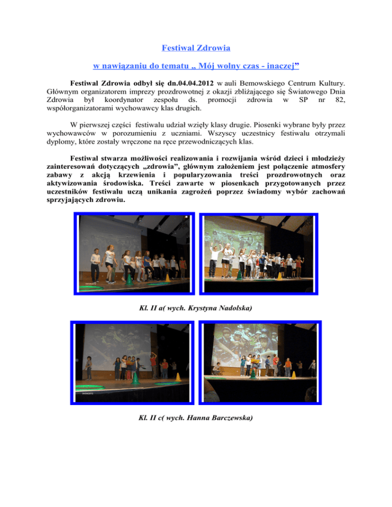 Festiwal Zdrowia w nawiązaniu do tematu „ Mój wolny czas - inaczej” Festiwal Zdrowia odbył się dn.04.04.2012 w auli Bemowskiego Centrum Kultury. Głównym organizatorem imprezy prozdrowotnej z okazji zbliżającego się Światowego Dnia Zdrowia był koordynator zespołu ds. promocji zdrowia w SP nr 82, współorganizatorami wychowawcy klas drugich. W pierwszej części festiwalu udział wzięły klasy drugie. Piosenki wybrane były przez wychowawców w porozumieniu z uczniami. Wszyscy uczestnicy festiwalu otrzymali dyplomy, które zostały wręczone na ręce przewodniczących klas. Festiwal stwarza możliwości realizowania i rozwijania wśród dzieci i młodzieży zainteresowań dotyczących „zdrowia”, głównym założeniem jest połączenie atmosfery zabawy z akcją krzewienia i popularyzowania treści prozdrowotnych oraz aktywizowania środowiska. Treści zawarte w piosenkach przygotowanych przez uczestników festiwalu uczą unikania zagrożeń poprzez świadomy wybór zachowań sprzyjających zdrowiu. Kl. II a( wych. Krystyna Nadolska) Kl. II c( wych. Hanna Barczewska) Kl. II e ( wych. Lilianna Hałka) Kl. II f ( wych. Jolanta Trych ) Światowy Dzień Zdrowia obchodzony jest od 52 lat, 7 kwietnia, w rocznicę powstania Światowej Organizacji Zdrowia (WHO). Hasło tegorocznej edycji to „Więcej zdrowia – więcej życia”. Tematem wielu utworów, których wysłuchaliśmy była myśl przewodnia tegorocznego hasła Światowego Dnia Zdrowia 2012 . Chodzi o to, by zachować dobry stan zdrowia w czasie trwania całego życia co pomoże starszym osobom cieszyć się pełnym i produktywnym życiem. Jednym z celów Narodowego Programu Zdrowia jest tworzenie warunków do zdrowia i aktywnego życia osób starszych. Obchody Światowego Dnia Zdrowia w Polsce wpisują się w działania Europejskiego Roku Aktywności Ludzi Starszych i Solidarności Międzypokoleniowej, który Unia Europejska ogłosiła tematem roku 2012. Druga część spotkania pt. „Śmiech to zdrowie” została przygotowana pod kierunkiem p. Joanny Cegielskiej . Imprezę prozdrowotną uświetnił znakomity występ grupy teatralnej z kl. „IIIa” w spektaklu „ To tylko kabaret”, które zostało wyróżnione podczas Warszawskiego Festiwalu Twórczości Artystycznej Dzieci i Młodzieży „ Asteriada 2012”. Gratulujemy! Występ grupy teatralnej z kl. „III a” w spektaklu „ To tylko kabaret” Kilka sekund śmiechu dziennie wystarczy by dotlenić organizm. „ Wyginam śmiało ciało” W uroczystości również wzięli udział Rodzice z kl. III a, którzy na ręce organizatora uroczystości przekazali wiele ciepłych słów za promocję zdrowia w SP nr 82 w Warszawie. Po podziękowaniach słownych czas przyszedł na podziękowania rzeczowe. Mali aktorzy i tancerze z kl. „III a” otrzymali niespodzianki (wewnątrz sporo ciekawych rzeczy ) , za trzyletnią ciężką pracę przy organizacji imprez rozwijających zainteresowania prozdrowotne. Miłym akcentem były również podziękowania ze strony p. Joanny Cegielskiej skierowane do Rodziców i wychowanków za wsparcie i współpracę podczas realizacji zadań projektu Szkoły Promującej Zdrowie. Wyróżnienie uczniowie z kl. „III a” Serdecznie dziękujemy wszystkim wykonawcom , którzy wzięli udział w Festiwalu Zdrowia.