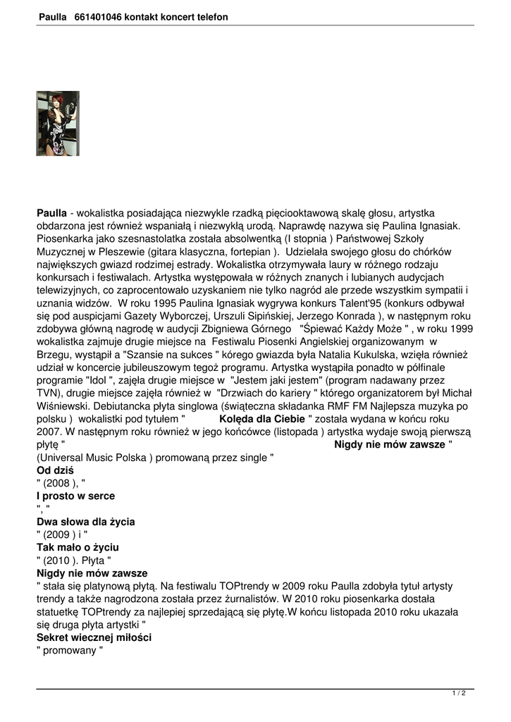 Paulla 661401046 kontakt koncert telefon Paulla - wokalistka posiadająca niezwykle rzadką pięciooktawową skalę głosu, artystka obdarzona jest również wspaniałą i niezwykłą urodą. Naprawdę nazywa się Paulina Ignasiak. Piosenkarka jako szesnastolatka została absolwentką (I stopnia ) Państwowej Szkoły Muzycznej w Pleszewie (gitara klasyczna, fortepian ). Udzielała swojego głosu do chórków największych gwiazd rodzimej estrady. Wokalistka otrzymywała laury w różnego rodzaju konkursach i festiwalach. Artystka występowała w różnych znanych i lubianych audycjach telewizyjnych, co zaprocentowało uzyskaniem nie tylko nagród ale przede wszystkim sympatii i uznania widzów. W roku 1995 Paulina Ignasiak wygrywa konkurs Talent'95 (konkurs odbywał się pod auspicjami Gazety Wyborczej, Urszuli Sipińskiej, Jerzego Konrada ), w następnym roku zdobywa główną nagrodę w audycji Zbigniewa Górnego "Śpiewać Każdy Może " , w roku 1999 wokalistka zajmuje drugie miejsce na Festiwalu Piosenki Angielskiej organizowanym w Brzegu, wystąpił a "Szansie na sukces " kórego gwiazda była Natalia Kukulska, wzięła również udział w koncercie jubileuszowym tegoż programu. Artystka wystąpiła ponadto w półfinale programie "Idol ", zajęła drugie miejsce w "Jestem jaki jestem" (program nadawany przez TVN), drugie miejsce zajęła również w "Drzwiach do kariery " którego organizatorem był Michał Wiśniewski. Debiutancka płyta singlowa (świąteczna składanka RMF FM Najlepsza muzyka po polsku ) wokalistki pod tytułem " Kolęda dla Ciebie " została wydana w końcu roku 2007. W następnym roku również w jego końcówce (listopada ) artystka wydaje swoją pierwszą płytę " Nigdy nie mów zawsze " (Universal Music Polska ) promowaną przez single " Od dziś " (2008 ), " I prosto w serce ", " Dwa słowa dla życia " (2009 ) i " Tak mało o życiu " (2010 ). Płyta " Nigdy nie mów zawsze " stała się platynową płytą. Na festiwalu TOPtrendy w 2009 roku Paulla zdobyła tytuł artysty trendy a także nagrodzona została przez żurnalistów. W 2010 roku piosenkarka dostała statuetkę TOPtrendy za najlepiej sprzedającą się płytę.W końcu listopada 2010 roku ukazała się druga płyta artystki " Sekret wiecznej miłości " promowany " 1/2 Paulla 661401046 kontakt koncert telefon Wracaj, czekam "i" Upalny dzień ". 2/2