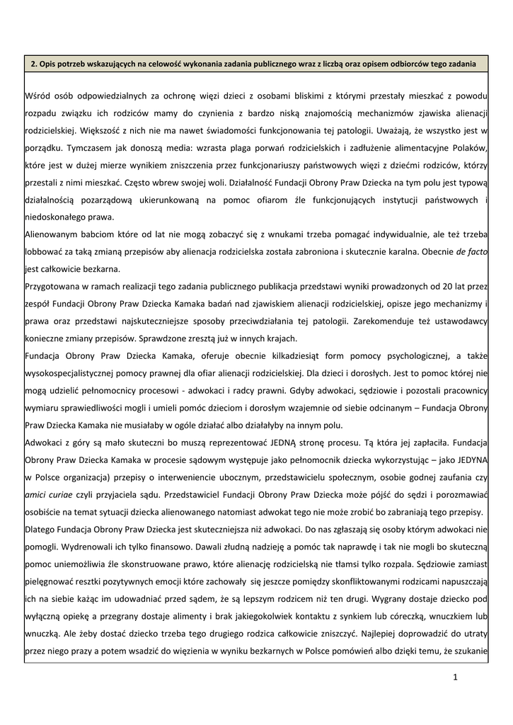 2. Opis potrzeb wskazujących na celowośd wykonania zadania publicznego wraz z liczbą oraz opisem odbiorców tego zadania Wśród osób odpowiedzialnych za ochronę więzi dzieci z osobami bliskimi z którymi przestały mieszkad z powodu rozpadu związku ich rodziców mamy do czynienia z bardzo niską znajomością mechanizmów zjawiska alienacji rodzicielskiej. Większośd z nich nie ma nawet świadomości funkcjonowania tej patologii. Uważają, że wszystko jest w porządku. Tymczasem jak donoszą media: wzrasta plaga porwao rodzicielskich i zadłużenie alimentacyjne Polaków, które jest w dużej mierze wynikiem zniszczenia przez funkcjonariuszy paostwowych więzi z dziedmi rodziców, którzy przestali z nimi mieszkad. Często wbrew swojej woli. Działalnośd Fundacji Obrony Praw Dziecka na tym polu jest typową działalnością pozarządową ukierunkowaną na pomoc ofiarom źle funkcjonujących instytucji paostwowych i niedoskonałego prawa. Alienowanym babciom które od lat nie mogą zobaczyd się z wnukami trzeba pomagad indywidualnie, ale też trzeba lobbowad za taką zmianą przepisów aby alienacja rodzicielska została zabroniona i skutecznie karalna. Obecnie de facto jest całkowicie bezkarna. Przygotowana w ramach realizacji tego zadania publicznego publikacja przedstawi wyniki prowadzonych od 20 lat przez zespół Fundacji Obrony Praw Dziecka Kamaka badao nad zjawiskiem alienacji rodzicielskiej, opisze jego mechanizmy i prawa oraz przedstawi najskuteczniejsze sposoby przeciwdziałania tej patologii. Zarekomenduje też ustawodawcy konieczne zmiany przepisów. Sprawdzone zresztą już w innych krajach. Fundacja Obrony Praw Dziecka Kamaka, oferuje obecnie kilkadziesiąt form pomocy psychologicznej, a także wysokospecjalistycznej pomocy prawnej dla ofiar alienacji rodzicielskiej. Dla dzieci i dorosłych. Jest to pomoc której nie mogą udzielid pełnomocnicy procesowi - adwokaci i radcy prawni. Gdyby adwokaci, sędziowie i pozostali pracownicy wymiaru sprawiedliwości mogli i umieli pomóc dzieciom i dorosłym wzajemnie od siebie odcinanym – Fundacja Obrony Praw Dziecka Kamaka nie musiałaby w ogóle działad albo działałyby na innym polu. Adwokaci z góry są mało skuteczni bo muszą reprezentowad JEDNĄ stronę procesu. Tą która jej zapłaciła. Fundacja Obrony Praw Dziecka Kamaka w procesie sądowym występuje jako pełnomocnik dziecka wykorzystując – jako JEDYNA w Polsce organizacja) przepisy o interweniencie ubocznym, przedstawicielu społecznym, osobie godnej zaufania czy amici curiae czyli przyjaciela sądu. Przedstawiciel Fundacji Obrony Praw Dziecka może pójśd do sędzi i porozmawiad osobiście na temat sytuacji dziecka alienowanego natomiast adwokat tego nie może zrobid bo zabraniają tego przepisy. Dlatego Fundacja Obrony Praw Dziecka jest skuteczniejsza niż adwokaci. Do nas zgłaszają się osoby którym adwokaci nie pomogli. Wydrenowali ich tylko finansowo. Dawali złudną nadzieję a pomóc tak naprawdę i tak nie mogli bo skuteczną pomoc uniemożliwia źle skonstruowane prawo, które alienację rodzicielską nie tłamsi tylko rozpala. Sędziowie zamiast pielęgnowad resztki pozytywnych emocji które zachowały się jeszcze pomiędzy skonfliktowanymi rodzicami napuszczają ich na siebie każąc im udowadniad przed sądem, że są lepszym rodzicem niż ten drugi. Wygrany dostaje dziecko pod wyłączną opiekę a przegrany dostaje alimenty i brak jakiegokolwiek kontaktu z synkiem lub córeczką, wnuczkiem lub wnuczką. Ale żeby dostad dziecko trzeba tego drugiego rodzica całkowicie zniszczyd. Najlepiej doprowadzid do utraty przez niego prazy a potem wsadzid do więzienia w wyniku bezkarnych w Polsce pomówieo albo dzięki temu, że szukanie 1 kontaktu z własnym dzieckiem policjanci i sędziowie uznają za nękanie, złośliwe niepokojenie czy przemoc względem „rodzica” alienującego. 3. Uzasadnienie potrzeby dofinansowania z dotacji inwestycji związanych z realizacją zadania publicznego, w szczególności ze 1) wskazaniem, w jaki sposób przyczyni się to do podwyższenia standardu realizacji zadania Nie dotyczy ponieważ nie ubiegamy się o dofinansowanie inwestycji. 4. Zakładany(-ne) cel(e) realizacji zadania publicznego Zakładanym celem realizacji zadania publicznego jest uporanie się ze zjawiskiem alienacji rodzicielskiej na poziomie mikro i makrospołecznym czyli na poziomie poszczególnych dzieci i ich rodzin oraz na poziomie strukturalnych zmian w prawie: orzekanie opieki wspólnej nawet bez zgody „rodzica” alienującego i karalnośd alienacji rodzicielskiej (art. 211 b K.k.). W zakresie realizacji celu zadania publicznego jakim jest pomoc w poszczególnych przypadkach zwrócid należy uwagę na fakt, że Fundacja Obrony Praw Dziecka Kamaka, oferuje obecnie kilkadziesiąt form pomocy psychologicznej, a także wysokospecjalistycznej pomocy prawnej dla ofiar alienacji rodzicielskiej. Dla dzieci i dorosłych. Jest to pomoc której nie mogą udzielid pełnomocnicy procesowi - adwokaci i radcy prawni. Gdyby adwokaci, sędziowie i pozostali pracownicy wymiaru sprawiedliwości mogli i umieli pomóc dzieciom i dorosłym wzajemnie od siebie odcinanym – Fundacja Obrony Praw Dziecka Kamaka nie musiałaby w ogóle działad albo działałyby na innym polu. Adwokaci z góry są mało skuteczni bo muszą reprezentowad JEDNĄ stronę procesu. Tą która jej zapłaciła. Fundacja Obrony Praw Dziecka Kamaka w procesie sądowym występuje jako pełnomocnik dziecka wykorzystując – jako JEDYNA w Polsce organizacja) przepisy o interweniencie ubocznym, przedstawicielu społecznym, osobie godnej zaufania czy amici curiae czyli przyjaciela sądu. Przedstawiciel Fundacji Obrony Praw Dziecka może pójśd do sędzi i porozmawiad osobiście na temat sytuacji dziecka alienowanego natomiast adwokat tego nie może zrobid bo zabraniają tego przepisy. 1) Wypełnid tylko w przypadku ubiegania się o dofinansowanie inwestycji. 2