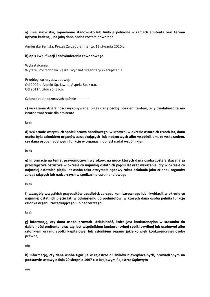 a) imię, nazwisko, zajmowane stanowisko lub funkcje pełnione w ramach emitenta oraz termin upływukadencji,najakądanaosobazostałapowołana AgnieszkaZemsta,PrezesZarząduemitenta,12stycznia2020r. b)opiskwalifikacjiidoświadczeniazawodowego Wykształcenie: Wyższe,PolitechnikaŚląska,WydziałOrganizacjiiZarządzania Przebiegkarieryzawodowej: Od2002r.AspektSp.jawna;AspektSp.zo.o. Od2011r.Lilousp.zo.o. Członekradnadzorczychspółek:----------- c)wskazaniedziałalnościwykonywanejprzezdanąosobępozaemitentem,gdydziałalnośćtama istotneznaczeniedlaemitenta brak d)wskazaniewszystkichspółekprawahandlowego,wktórych,wokresieostatnichtrzechlat,dana osobabyłaczłonkiemorganówzarządzającychlubnadzorczychalbowspólnikiem,zewskazaniem, czydanaosobanadalpełnifunkcjeworganachlubjestnadalwspólnikiem brak e)informacjenatematprawomocnychwyroków,namocyktórychdanaosobazostałaskazanaza przestępstwaoszustwawokresieconajmniejostatnichpięciulatorazwskazanie,czywokresieco najmniej ostatnich pięciu lat osoba taka otrzymała sądowy zakaz działania jako członek organów zarządzającychlubnadzorczychwspółkachprawahandlowego brak f)szczegóływszystkichprzypadkówupadłości,zarządukomisarycznegolublikwidacji,wokresieco najmniejostatnichpięciulat,wodniesieniudopodmiotów,wktórychdanaosobapełniłafunkcje członkaorganuzarządzającegolubnadzorczego brak g) informację, czy dana osoba prowadzi działalność, która jest konkurencyjna w stosunku do działalnościemitenta,orazczyjestwspólnikiemkonkurencyjnejspółkicywilnejlubosobowejalbo członkiem organu spółki kapitałowej lub członkiem organu jakiejkolwiek konkurencyjnej osoby prawnej nie h) informację, czy dana osoba figuruje w rejestrze dłużników niewypłacalnych, prowadzonym na podstawieustawyzdnia20sierpnia1997r.oKrajowymRejestrzeSądowym nie