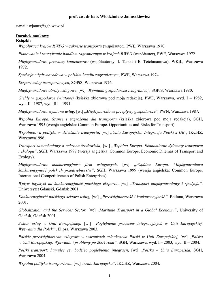 prof. zw. dr hab. Włodzimierz Januszkiewicz e-mail: [email protected] Dorobek naukowy Książki: Współpraca krajów RWPG w zakresie transportu (współautor), PWE, Warszawa 1970. Planowanie i zarządzanie handlem zagranicznym w krajach RWPG (współautor), PWE, Warszawa 1972. Międzynarodowe przewozy kontenerowe (współautorzy: I. Tarski i E. Teichmanowa), WKiŁ, Warszawa 1972. Spedycja międzynarodowa w polskim handlu zagranicznym, PWE, Warszawa 1974. Eksport usług transportowych, SGPiS, Warszawa 1976. Międzynarodowe obroty usługowe, [w:] „Wymiana gospodarcza z zagranicą”, SGPiS, Warszawa 1980. Giełdy w gospodarce światowej (książka zbiorowa pod moją redakcją), PWE, Warszawa, wyd. I – 1982, wyd. II –1987, wyd. III – 1991. Międzynarodowa wymiana usług, [w:] „Międzynarodowe przepływy gospodarcze”, PWN, Warszawa 1987. Wspólna Europa. Szanse i zagrożenia dla transportu (książka zbiorowa pod moją redakcją), SGH, Warszawa 1995 (wersja angielska: Common Europe. Opportunities and Risks for Transport). Wspólnotowa polityka w dziedzinie transportu, [w:] „Unia Europejska. Integracja Polski z UE”, IKCHZ, Warszawa1996. Transport samochodowy a ochrona środowiska, [w:] „Wspólna Europa. Ekonomiczne dylematy transportu i ekologii”, SGH, Warszawa 1997 (wersja angielska: Common Europe. Economic Dilemas of Transport and Ecology). Międzynarodowa konkurencyjność firm usługowych, [w:] „Wspólna Europa. Międzynarodowa konkurencyjność polskich przedsiębiorstw”, SGH, Warszawa 1999 (wersja angielska: Common Europe. International Competitiveness of Polish Enterprises). Wpływ logistyki na konkurencyjność polskiego eksportu, [w:] „Transport międzynarodowy i spedycja”, Uniwersytet Gdański, Gdańsk 2001. Konkurencyjność polskiego sektora usług, [w:] „Przedsiębiorczość i konkurencyjność”, Bellona, Warszawa 2001. Globalization and the Services Sector, [w:] „Maritime Transport in a Global Economy”, University of Gdańsk, Gdańsk 2001. Sektor usług w Unii Europejskiej, [w:] „Pogłębienie procesów integracyjnych w Unii Europejskiej. Wyzwania dla Polski”, Elipsa, Warszawa 2003. Polskie przedsiębiorstwa usługowe w warunkach członkostwa Polski w Unii Europejskiej, [w:] „Polska w Unii Europejskiej. Wyzwania i problemy po 2004 roku”, SGH, Warszawa, wyd. I – 2003, wyd. II – 2004. Polski transport: hamulec czy bodziec pogłębienia integracji, [w:] „Polska – Unia Europejska, SGH, Warszawa 2004. Wspólna polityka transportowa, [w:] „Unia Europejska”, IKCHZ, Warszawa 2004. 1 Polski sektor usług w perspektywie Unii Gospodarczej i Walutowej, [w:] „Usługi w rozwoju społecznogospodarczym”, IRWiK, Warszawa 2005. Ku wspólnej polityce morskiej Unii Europejskiej, [w:] „Seminaria Naukowe Instytutu Handlu Zagranicznego i Studiów Europejskich – Rok akademicki 2006-2007”, SGH, Warszawa 2007. Kilka refleksji na temat polskich przedsiębiorstw branży TSL w otoczeniu globalnym, [w:] „Przedsiębiorstwo w otoczeniu globalnym”, Uniwersytet Gdański, Warszawa 2008. Międzynarodowe usługi logistyczne (książka zbiorowa pod moją redakcją), Wyższa Szkoła Cła i Logistyki, Warszawa 2010. Unijna strategia dla regionu Morza Bałtyckiego, [w:] „Seminaria Naukowe Instytutu Handlu Zagranicznego i Studiów Europejskich – Rok akademicki 2009-2010”, SGH, Warszawa 2010. Transport morski państw bałtyckich w polityce integracyjnej Unii Europejskiej, [w:] „Państwa bałtyckie w zjednoczonej Europie”, Wyższa Szkoła Cła i Logistyki, Warszawa 2011. Międzynarodowe obroty usługowe w dobie światowego kryzysu gospodarczego, [w:] „Nowe procesy w gospodarce światowej. Wnioski dla Polski, SGH, Warszawa 2014. Ocena dziesięciu lat Wspólnej Polityki Transportowej Unii Europejskiej z punktu widzenia korzyści i niekorzyści dla Polski, [w:] „Wybrane aspekty funkcjonowania Polski w Unii Europejskiej. Bilans dziesięciu lat członkostwa”, SGH, Warszawa 2014. Balance of Ten Years of the EU Common Transport Policy in Terms of Advantages and Disadvantages to Poland, [w:] Selected Aspects of Functioning of Poland in the European Union. The Balance of Ten Years of Membership, ed. by G. Wojtkowska-Łodej and H. Bąk, SGH, Warszawa 2015. Artykuły Z działalności FIATA, „Rynki Zagraniczne” nr 136/1968. Tranzyt Europa Zachodnia – Azja, „Rynki Zagraniczne” nr 146/1968. Nowy list przewozowy CIM, „Rynki Zagraniczne” nr 3/1969. Konteneryzacja a porty polskie, „Rynki Zagraniczne” nr 10/1969. Poles Gear for Container Age, „The Journal of Commerce”, 9 June 1969. Spedycja własna w handlu zagranicznym krajów socjalistycznych, „Zeszyty Naukowe Instytutu Handlu Międzynarodowego SGPiS” nr 82/1971. Model procesu spedycyjnego w eksporcie krajów socjalistycznych przy przewozach ładunków transportem kolejowym, j. w. nr 84/1971. O reorganizację spedycji międzynarodowej w Polsce, „Rynki Zagraniczne” nr 131-132/1971. Koncepcja systemu informatycznego spedycji, „Rynki Zagraniczne” nr 120/1972. Wartość jednej tony ładunków w polskim handlu zagranicznym w latach 1960-1970, „Handel Zagraniczny” nr 2/1972. Rola tranzytu towarowego w gospodarce polskiej, „Sprawy Międzynarodowe” nr 9/1972. The Role of the Transit of Goods in the Polish Economy, „Studies on International Relations” No. 2/1973. 30 lat spedycji międzynarodowej w handlu zagranicznym PRL, „Problemy Handlu Zagranicznego” nr 6-7/1975. 2 Obsługa transportowo-spedycyjna radzieckiego handlu zagranicznego w latach siedemdziesiątych, „Handel Zagraniczny – wydanie specjalne poświęcone ZSRR”, 1975. Próba systematyzacji pojęć związanych z nr 10/1975. eksportem usług transportowych, „Handel Zagraniczny” Problematyka transportowa na Konferencji Bezpieczeństwa i Współpracy w Europie, „Przegląd Komunikacyjny” nr 4/1976. Spedytor międzynarodowy jako organizator przewozów kombinowanych, „Polish Maritime News” N