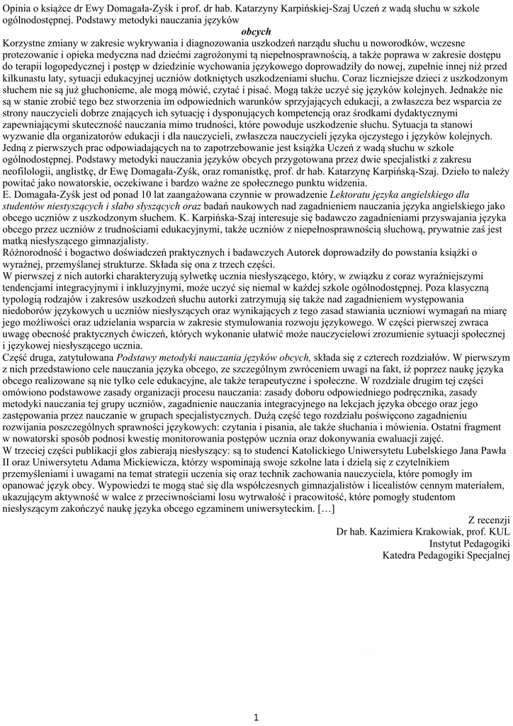 Opinia o książce dr Ewy Domagała-Zyśk i prof. dr hab. Katarzyny Karpińskiej-Szaj Uczeń z wadą słuchu w szkole ogólnodostępnej. Podstawy metodyki nauczania języków obcych Korzystne zmiany w zakresie wykrywania i diagnozowania uszkodzeń narządu słuchu u noworodków, wczesne protezowanie i opieka medyczna nad dziećmi zagrożonymi tą niepełnosprawnością, a także poprawa w zakresie dostępu do terapii logopedycznej i postęp w dziedzinie wychowania językowego doprowadziły do nowej, zupełnie innej niż przed kilkunastu laty, sytuacji edukacyjnej uczniów dotkniętych uszkodzeniami słuchu. Coraz liczniejsze dzieci z uszkodzonym słuchem nie są już głuchonieme, ale mogą mówić, czytać i pisać. Mogą także uczyć się języków kolejnych. Jednakże nie są w stanie zrobić tego bez stworzenia im odpowiednich warunków sprzyjających edukacji, a zwłaszcza bez wsparcia ze strony nauczycieli dobrze znających ich sytuację i dysponujących kompetencją oraz środkami dydaktycznymi zapewniającymi skuteczność nauczania mimo trudności, które powoduje uszkodzenie słuchu. Sytuacja ta stanowi wyzwanie dla organizatorów edukacji i dla nauczycieli, zwłaszcza nauczycieli języka ojczystego i języków kolejnych. Jedną z pierwszych prac odpowiadających na to zapotrzebowanie jest książka Uczeń z wadą słuchu w szkole ogólnodostępnej. Podstawy metodyki nauczania języków obcych przygotowana przez dwie specjalistki z zakresu neofilologii, anglistkę, dr Ewę Domagała-Zyśk, oraz romanistkę, prof. dr hab. Katarzynę Karpińską-Szaj. Dzieło to należy powitać jako nowatorskie, oczekiwane i bardzo ważne ze społecznego punktu widzenia. E. Domagała-Zyśk jest od ponad 10 lat zaangażowana czynnie w prowadzenie Lektoratu języka angielskiego dla studentów niestyszących i słabo słyszących oraz badań naukowych nad zagadnieniem nauczania języka angielskiego jako obcego uczniów z uszkodzonym słuchem. K. Karpińska-Szaj interesuje się badawczo zagadnieniami przyswajania języka obcego przez uczniów z trudnościami edukacyjnymi, także uczniów z niepełnosprawnością słuchową, prywatnie zaś jest matką niesłyszącego gimnazjalisty. Różnorodność i bogactwo doświadczeń praktycznych i badawczych Autorek doprowadziły do powstania książki o wyraźnej, przemyślanej strukturze. Składa się ona z trzech części. W pierwszej z nich autorki charakteryzują sylwetkę ucznia niesłyszącego, który, w związku z coraz wyraźniejszymi tendencjami integracyjnymi i inkluzyjnymi, może uczyć się niemal w każdej szkole ogólnodostępnej. Poza klasyczną typologią rodzajów i zakresów uszkodzeń słuchu autorki zatrzymują się także nad zagadnieniem występowania niedoborów językowych u uczniów niesłyszących oraz wynikających z tego zasad stawiania uczniowi wymagań na miarę jego możliwości oraz udzielania wsparcia w zakresie stymulowania rozwoju językowego. W części pierwszej zwraca uwagę obecność praktycznych ćwiczeń, których wykonanie ułatwić może nauczycielowi zrozumienie sytuacji społecznej i językowej niesłyszącego ucznia. Część druga, zatytułowana Podstawy metodyki nauczania języków obcych, składa się z czterech rozdziałów. W pierwszym z nich przedstawiono cele nauczania języka obcego, ze szczególnym zwróceniem uwagi na fakt, iż poprzez naukę języka obcego realizowane są nie tylko cele edukacyjne, ale także terapeutyczne i społeczne. W rozdziale drugim tej części omówiono podstawowe zasady organizacji procesu nauczania: zasady doboru odpowiedniego podręcznika, zasady metodyki nauczania tej grupy uczniów, zagadnienie nauczania integracyjnego na lekcjach języka obcego oraz jego zastępowania przez nauczanie w grupach specjalistycznych. Dużą część tego rozdziału poświęcono zagadnieniu rozwijania poszczególnych sprawności językowych: czytania i pisania, ale także słuchania i mówienia. Ostatni fragment w nowatorski sposób podnosi kwestię monitorowania postępów ucznia oraz dokonywania ewaluacji zajęć. W trzeciej części publikacji głos zabierają niesłyszący: są to studenci Katolickiego Uniwersytetu Lubelskiego Jana Pawła II oraz Uniwersytetu Adama Mickiewicza, którzy wspominają swoje szkolne lata i dzielą się z czytelnikiem przemyśleniami i uwagami na temat strategii uczenia się oraz technik zachowania nauczyciela, które pomogły im opanować język obcy. Wypowiedzi te mogą stać się dla współczesnych gimnazjalistów i licealistów cennym materiałem, ukazującym aktywność w walce z przeciwnościami losu wytrwałość i pracowitość, które pomogły studentom niesłyszącym zakończyć naukę języka obcego egzaminem uniwersyteckim. […] Z recenzji Dr hab. Kazimiera Krakowiak, prof. KUL Instytut Pedagogiki Katedra Pedagogiki Specjalnej 1