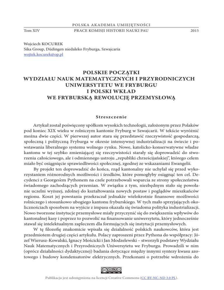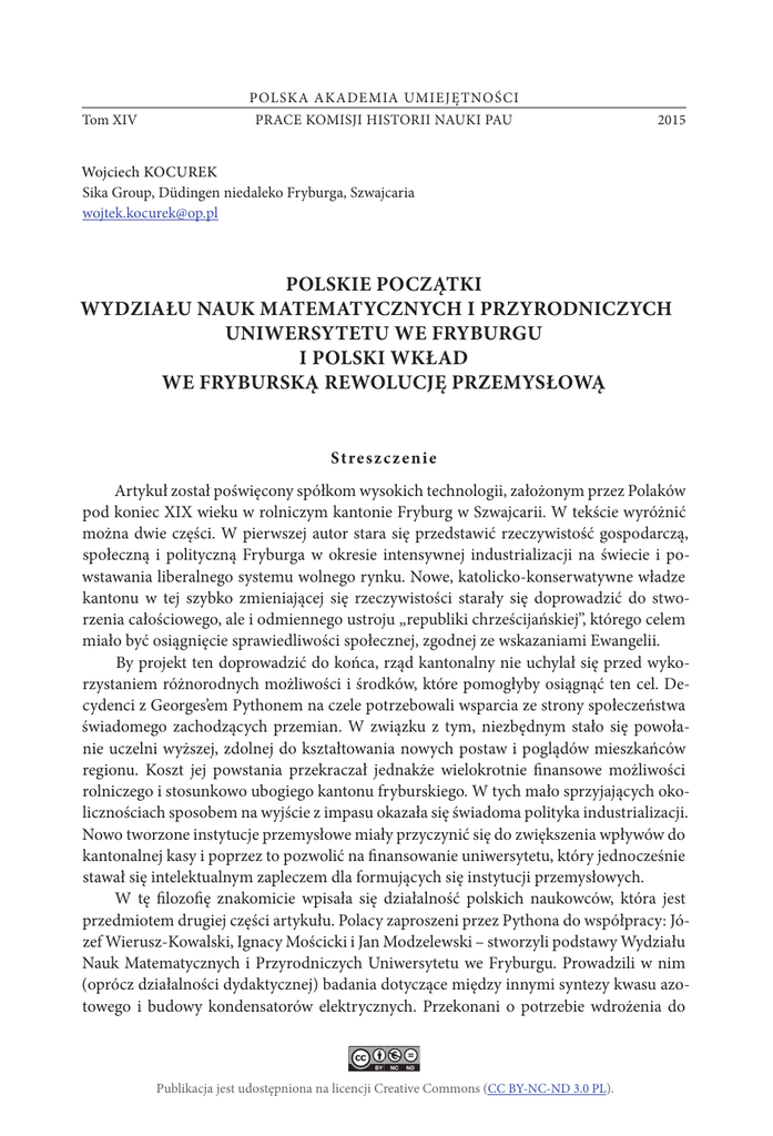POLSKA AKADEMIA UMIEJĘTNOŚCI Tom XIV PRACE KOMISJI HISTORII NAUKI PAU 2015 Wojciech KOCUREK Sika Group, Düdingen niedaleko Fryburga, Szwajcaria [email protected] POLSKIE POCZĄTKI WYDZIAŁU NAUK MATEMATYCZNYCH I PRZYRODNICZYCH... UNIWERSYTETU WE FRYBURGU I POLSKI WKŁAD WE FRYBURSKĄ REWOLUCJĘ PRZEMYSŁOWĄ Stresz cz eni e Artykuł został poświęcony spółkom wysokich technologii, założonym przez Polaków pod koniec XIX wieku w rolniczym kantonie Fryburg w Szwajcarii. W tekście wyróżnić można dwie części. W pierwszej autor stara się przedstawić rzeczywistość gospodarczą, społeczną i polityczną Fryburga w okresie intensywnej industrializacji na świecie i po wstawania liberalnego systemu wolnego rynku. Nowe, katolicko-konserwatywne władze kantonu w tej szybko zmieniającej się rzeczywistości starały się doprowadzić do stwo rzenia całościowego, ale i odmiennego ustroju „republiki chrześcijańskiej”, którego celem miało być osiągnięcie sprawiedliwości społecznej, zgodnej ze wskazaniami Ewangelii. By projekt ten doprowadzić do końca, rząd kantonalny nie uchylał się przed wyko rzystaniem różnorodnych możliwości i środków, które pomogłyby osiągnąć ten cel. De cydenci z Georges’em Pythonem na czele potrzebowali wsparcia ze strony społeczeństwa świadomego zachodzących przemian. W związku z tym, niezbędnym stało się powoła nie uczelni wyższej, zdolnej do kształtowania nowych postaw i poglądów mieszkańców regionu. Koszt jej powstania przekraczał jednakże wielokrotnie finansowe możliwości rolniczego i stosunkowo ubogiego kantonu fryburskiego. W tych mało sprzyjających oko licznościach sposobem na wyjście z impasu okazała się świadoma polityka industrializacji. Nowo tworzone instytucje przemysłowe miały przyczynić się do zwiększenia wpływów do kantonalnej kasy i poprzez to pozwolić na finansowanie uniwersytetu, który jednocześnie stawał się intelektualnym zapleczem dla formujących się instytucji przemysłowych. W tę filozofię znakomicie wpisała się działalność polskich naukowców, która jest przedmiotem drugiej części artykułu. Polacy zaproszeni przez Pythona do współpracy: Jó zef Wierusz-Kowalski, Ignacy Mościcki i Jan Modzelewski – stworzyli podstawy Wydziału Nauk Matematycznych i Przyrodniczych Uniwersytetu we Fryburgu. Prowadzili w nim (oprócz działalności dydaktycznej) badania dotyczące między innymi syntezy kwasu azo towego i budowy kondensatorów elektrycznych. Przekonani o potrzebie wdrożenia do Redaktor wydawnictwa Piotr Łozowski Edyta Podolska-Frej Skład i łamanie Agata Gruszczyńska / Pracownia Register Od 2013 roku wersją referencyjną czasopisma jest wersja elektroniczna dostępna w Internecie: http://pau.krakow.pl/index.php/Prace-Komisji-Historii-Nauki-PAU.html ISSN 1731-6715 (wersja drukowana) ISSN 2392-1749 (wersja elektroniczna) Publikacja jest udostępniona na licencji Creative Commons Uznanie autorstwa-Użycie niekomercyjne-Bez utworów zależnych 3.0 Publikacja jest udostępniona na licencji Creative Commons (CC BY-NC-ND 3.0 PL). Polska (CC-BY-NC-ND 3.0 PL), pewne prawa zastrzeżone na rzecz Autorów i Polskiej Akademii Umiejętności. Tekst licencji jest dostępny na stronie http://creativecommons.pl/licenses/by/3.0/pl Dystrybucja PAU, ul. Sławkowska 17, 31–016 Kraków 64 Wojciech KOCUREK szerokiej produkcji stworzonych przez siebie innowacji, sfinansowali i zbudowali pierw sze fabryki doświadczalne, a z czasem doprowadzili do powstania przemysłowych fabryk kwasu azotowego oraz kondensatorów wysokiego napięcia. Choć po zakończeniu pierw szej wojny światowej to zaangażowanie Polaków ustało, okres 30 lat badań i doświadczeń akademickich jasno pokazuje, że świadome współdziałanie decydentów politycznych i wysoko kwalifikowanej kadry naukowej może przynieść zaskakujące i nieoczekiwane efekty. Słowa kluczowe: Uniwersytet we Fryburgu, Wydział Nauk Matematycznych i Przy rodniczych, industrializacja, nauki stosowane, przemysł, kwas azotowy, kondensato ry, wyładowania elektryczne, saletra, synteza azotu z tlenem, „republika chrześcijańska”, katolicka nauka społeczna, spółka akcyjna, fabryka, patenty, Towarzystwo Kwasu Azo towego, Szwajcarska Fabryka Kondensatorów, Towarzystwo Generalne Kondensatorów Elektrycznych 1. Wprowadzenie XIX-wieczna rewolucja przemysłowa miała zasięg światowy, jednak nie wszędzie przebiegała równie intensywnie i skutecznie. Środowisko polityczne, stosunki religijne, stopień rozwoju społeczeństwa, najbliżsi sąsiedzi, jak i dalecy sprzymierzeńcy – wszystko to mogło mieć, i miało, przemożny wpływ na rezultaty rewolucji przemysłowej. Dlatego też trudno jednoznacznie określić warunki gwarantujące jej powodzenie lub takie, które skazywałyby ją na pewną porażkę. Nie jest regułą, że jedynie rządy liberalne i postępowe otwierały społecznościom możliwość pro-industrialnego działania. Chęć modernizacji wynikała z różnych powodów. Fryburg to przykład kantonu (a więc de facto państwa) raczej niepredestynowane go do wejścia na drogę industrializacji. W porównaniu z innymi krajami związkowymi Konfederacji Szwajcarskiej raczej ubogi, pod rządami ugrupowań o charakterze katolic ko-konserwatywnym – potrafił stworzyć spójną wizję państwa i społeczeństwa szczęśli wego. Realizował ją w sposób konsekwentny, a czasem i sprytny, metodami stosowanymi w społeczeństwach najbardziej rozwiniętych. Mało zważając na stan finansów państwa, do zrealizowania wytyczonych celów nie obawiał się zaangażować i cudzoziemców, o ile podążali oni wspólnie tak wytyczoną drogą. By dobrze zrozumieć istotę, a przede wszyst kim skalę przemian we Fryburgu, konieczne jest przyjrzenie się pokrótce temu systemowi i zasadom jego funkcjonowania, a także charakterowi społeczeństwa i gospodarki kanto nu fryburskiego. 2. Jak skutecznie uprzemysłowić 