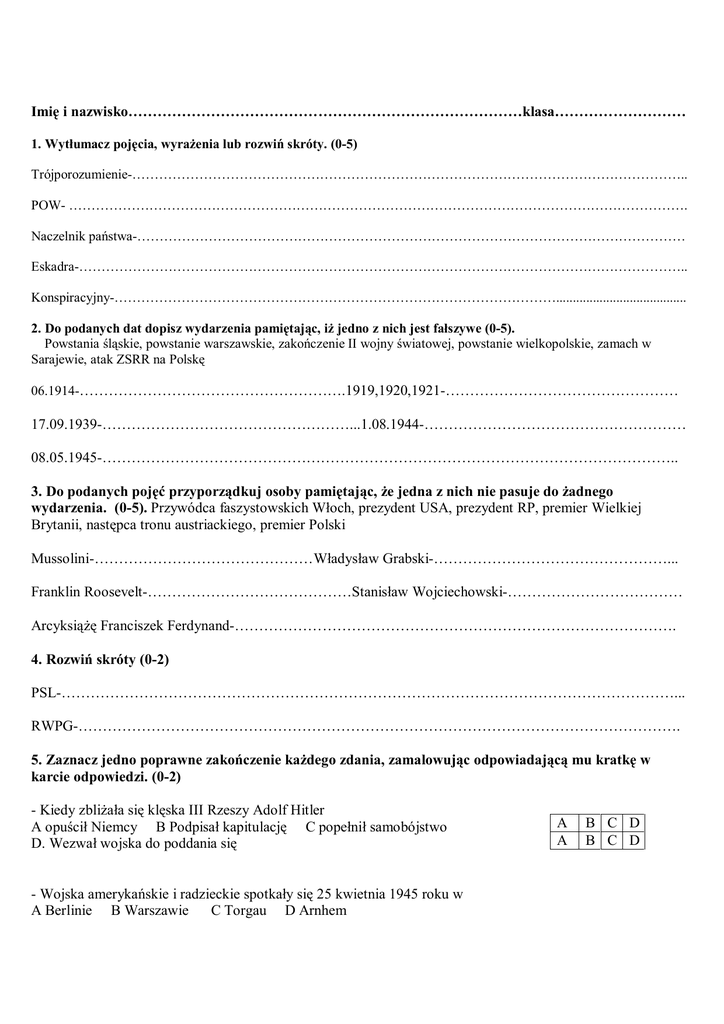 Imię i nazwisko………………………………………………………………………klasa……………………… 1. Wytłumacz pojęcia, wyrażenia lub rozwiń skróty. (0-5) Trójporozumienie-…………………………………………………………………………………………………………….. POW- …………………………………………………………………………………………………………………………. Naczelnik państwa-…………………………………………………………………………………………………………… Eskadra-……………………………………………………………………………………………………………………….. Konspiracyjny-………………………………………………………………………………………....................................... 2. Do podanych dat dopisz wydarzenia pamiętając, iż jedno z nich jest fałszywe (0-5). Powstania śląskie, powstanie warszawskie, zakończenie II wojny światowej, powstanie wielkopolskie, zamach w Sarajewie, atak ZSRR na Polskę 06.1914-……………………………………………….1919,1920,1921-………………………………………… 17.09.1939-……………………………………………...1.08.1944-……………………………………………… 08.05.1945-……………………………………………………………………………………………………….. 3. Do podanych pojęć przyporządkuj osoby pamiętając, że jedna z nich nie pasuje do żadnego wydarzenia. (0-5). Przywódca faszystowskich Włoch, prezydent USA, prezydent RP, premier Wielkiej Brytanii, następca tronu austriackiego, premier Polski Mussolini-………………………………………Władysław Grabski-…………………………………………... Franklin Roosevelt-……………………………………Stanisław Wojciechowski-……………………………… Arcyksiążę Franciszek Ferdynand-………………………………………………………………………………. 4. Rozwiń skróty (0-2) PSL-………………………………………………………………………………………………………………... RWPG-……………………………………………………………………………………………………………. 5. Zaznacz jedno poprawne zakończenie każdego zdania, zamalowując odpowiadającą mu kratkę w karcie odpowiedzi. (0-2) - Kiedy zbliżała się klęska III Rzeszy Adolf Hitler A opuścił Niemcy B Podpisał kapitulację C popełnił samobójstwo D. Wezwał wojska do poddania się - Wojska amerykańskie i radzieckie spotkały się 25 kwietnia 1945 roku w A Berlinie B Warszawie C Torgau D Arnhem A A B C D B C D 6. Na mapie konturowej (0-2) a. Zaznacz kolorem czerwonym ziemie wyzwolone i przyłączone do Polski w latach 1919-1921 b. Podkreśl na zielono nazwy miejscowości, w których wybuchały powstania. 7. Podpisz, jakie osoby znajdują się na fotografii poniżej. (0-3) 8. Odczytaj co drugi wyraz znajdujący się na fladze Polski. W ten sposób powstanie zdanie. Pozostałe wyrazy, czytane tak samo, utworzą kolejne zdanie. Zapisz oba zdania obok flagi i podkreśl zdanie prawdziwe (0-3) 9. Wykorzystując dane z tabeli wypisz w jakich latach szkolnych poziom analfabetyzmu w II RP był najmniejszy. (0-2). Dane zapisz pod tabelą. Rok szkolny 1921/1922 1924/1925 1926/1927 1938/1939 Poziom analfabetyzmu 69% 85% 95% 98% 10. Na podstawie diagramu wypisz trzy najliczniejsze narodowości zamieszkujące II RP. Dane zapisz pod diagramem. (0-7) 11. Podkreśl jakie państwa zdradziły powstańców warszawskich (0-2) a. Niemcy i USA b. ZSRR i Wielka Brytania c. Francja i Belgia d. USA i Włochy 12. Przeczytaj tekst źródłowy i odpowiedz na pytania (0-2) Traktat pokojowy miedzy mocarstwami sprzymierzonymi a Niemcami, ratyfikowany przez Polskę ustawą sejmową, uchwalony w Wersalu 28.06.1919 Artykuł 102 Główne Mocarstwa sprzymierzone i stowarzyszone zobowiązują się utworzyć z miasta Gdańska wraz z terytorium oznaczonym w artykule 100 wolne miasto. Będzie ono oddane pod ochronę Związku Narodów. a. Czego dotyczy artykuł 102 ……………………………………………………………………………………………………………………… b. Pod czyją ochroną miało pozostać wolne miasto? ……………………………………………………………………………………………………………………… ŹRÓDŁA 1. 2. 3. 4. 5. 6. 7. 8. 9. 10. 11. 12. 13. 14. Michał Błaut, Moja historia 6 część I, Rożak 2005 Marek Szymański, Moja historia 6 część II, Rożak 2005 Mariusz Kliszewski, Aleksandra Marcinko, Moja historia 6 część I- zeszyt ćwiczeń, Rożak 2005 Jolanta Węgiel, Aleksandra Marcinko, Moja historia 6 część II- zeszyt ćwiczeń, Rożak 2005 Maria Pacholska, Ćwiczenia ze źródłami- historia i społeczeństwo, Arka Poznań 2002 Grzegorz Wojciechowski, Człowiek i jego cywilizacja- zeszyt ćwiczeń, Nowa Era Poznań 2001 Red. Stanisław Sierpowski, Źródła i materiały do nauczania historii, Warszawa 1998 Lech Bielski, Historia i dokument, Kraków 2001 Andrzej Zaleski- Ejgierd, Testy osiągnięć uczniów z historii, Nowa Era Warszawa 2004 Wiesława Surdyk- Fertsch, Bogumiła Olszewska, My i historia- zeszyt ćwiczeń, Demart Warszawa 2004 Zofia Bentkowska- Sztonyk, Edyta Wach, Historia i społeczeństwo- zeszyt ćwiczeń 6, Wrocław 2001 Józef Ratajczak, Grzegorz Roszak, Historia i społeczeństwo- zeszyt ćwiczeń 6, Gdańsk 2001 Dariusz Baliszewski, Andrzej Krzysztof Kunert, Prawdziwa historia Polaków 2, Warszawa 1999 Dariusz Baliszewski, Andrzej Krzysztof Kunert, Prawdziwa historia Polaków 3, Warszawa 1999