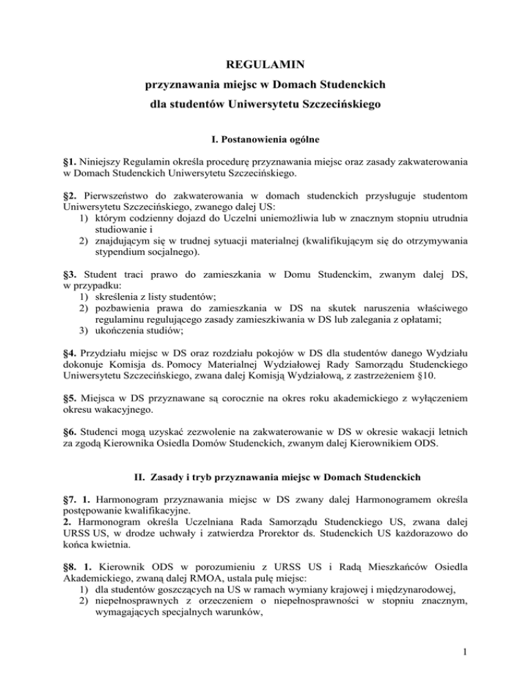 REGULAMIN przyznawania miejsc w Domach Studenckich dla studentów Uniwersytetu Szczecińskiego I. Postanowienia ogólne §1. Niniejszy Regulamin określa procedurę przyznawania miejsc oraz zasady zakwaterowania w Domach Studenckich Uniwersytetu Szczecińskiego. §2. Pierwszeństwo do zakwaterowania w domach studenckich przysługuje studentom Uniwersytetu Szczecińskiego, zwanego dalej US: 1) którym codzienny dojazd do Uczelni uniemożliwia lub w znacznym stopniu utrudnia studiowanie i 2) znajdującym się w trudnej sytuacji materialnej (kwalifikującym się do otrzymywania stypendium socjalnego). §3. Student traci prawo do zamieszkania w Domu Studenckim, zwanym dalej DS, w przypadku: 1) skreślenia z listy studentów; 2) pozbawienia prawa do zamieszkania w DS na skutek naruszenia właściwego regulaminu regulującego zasady zamieszkiwania w DS lub zalegania z opłatami; 3) ukończenia studiów; §4. Przydziału miejsc w DS oraz rozdziału pokojów w DS dla studentów danego Wydziału dokonuje Komisja ds. Pomocy Materialnej Wydziałowej Rady Samorządu Studenckiego Uniwersytetu Szczecińskiego, zwana dalej Komisją Wydziałową, z zastrzeżeniem §10. §5. Miejsca w DS przyznawane są corocznie na okres roku akademickiego z wyłączeniem okresu wakacyjnego. §6. Studenci mogą uzyskać zezwolenie na zakwaterowanie w DS w okresie wakacji letnich za zgodą Kierownika Osiedla Domów Studenckich, zwanym dalej Kierownikiem ODS. II. Zasady i tryb przyznawania miejsc w Domach Studenckich §7. 1. Harmonogram przyznawania miejsc w DS zwany dalej Harmonogramem określa postępowanie kwalifikacyjne. 2. Harmonogram określa Uczelniana Rada Samorządu Studenckiego US, zwana dalej URSS US, w drodze uchwały i zatwierdza Prorektor ds. Studenckich US każdorazowo do końca kwietnia. §8. 1. Kierownik ODS w porozumieniu z URSS US i Radą Mieszkańców Osiedla Akademickiego, zwaną dalej RMOA, ustala pulę miejsc: 1) dla studentów goszczących na US w ramach wymiany krajowej i międzynarodowej, 2) niepełnosprawnych z orzeczeniem o niepełnosprawności w stopniu znacznym, wymagających specjalnych warunków, 1 3) matek z dziećmi, 4) małżeństw oraz nieformalnych związków konkubenckich, 5) administratorów sieci ethernetowych w DS, 6) do dyspozycji URSS i RMOA, 7) pulę rezerwową do dyspozycji Uczelnianej Komisji ds. Pomocy Materialnej US. 2. Liczbę miejsc dla wydziału ustala się proporcjonalnie do liczby osób ubiegających się o miejsce w DS na tym wydziale. 3. W przypadku większej liczby osób ubiegających się o miejsce w DS niż miejsc przyznanych z puli na wydział, pierwszeństwo mają osoby spełniające kryteria §2, które uzyskały najwięcej punktów w postępowaniu kwalifikacyjnym. §9. Komisja wydziałowa pozostawia do 20% miejsc przyznanych wydziałowi dla studentów przyjętych na I rok studiów uwzględniając podział miejsc w DS dla studentów studiów I i II stopnia. §10. 1. Student I roku studiów ubiegający się o miejsce w DS zobowiązany jest złożyć we właściwym Dziekanacie podanie o przyznanie miejsca w DS w terminie przewidzianym w Harmonogramie 2. Do podania należy dołączyć: 1) zaświadczenie o liczbie punktów uzyskanych w postępowaniu rekrutacyjnym na studia, 2) lub kopię dyplomu ukończenia studiów pierwszego stopnia lub jednolitych magisterskich. 3. Studenci ubiegający się o stypendium socjalne w trybie określonym we właściwym regulaminie powinni do podania załączyć dokumenty wymagane przy składaniu wskazanego wniosku. §11. Studenci ostatniego roku studiów pierwszego stopnia, zamierzający kontynuować naukę na studiach drugiego stopnia w ramach tego samego wydziału mogą przystąpić do przydziału miejsc w trybie przewidzianym dla studentów pozostałych lat lub według zasad przewidzianych dla studentów I roku. §12. Studenci ubiegający się o miejsce w DS wpisują się na listę we właściwym Dziekanacie w terminach wyznaczonych Harmonogramem z zastrzeżeniem §10 i §11. §13. 1. Po upływie terminu określonego Harmonogramem, rozdziału wolnych miejsc dokonuje Kierownik ODS. 2. Pierwszeństwo w przydzielaniu miejsc przysługuje studentom, którzy brali udział w naborze w terminach określonych w Harmonogramie i nie otrzymali miejsca z powodu niewystarczającej liczby punktów w postępowaniu kwalifikacyjnym oraz złożyli pisemne oświadczenie o zamiarze zamieszkania w DS do Kierownika ODS. 3. Kierownik ODS przydziela miejsca w DS również studentom, którzy nie zgłosili zapotrzebowania na miejsce w DS w terminach określonych w Harmonogramie, a także innym osobom ubiegającym się o miejsce w DS, z uwzględnieniem ust. 2. §14. Miejsca w DS przydzielane są studentom pierwszego roku studiów I i II stopnia i jednolitych magisterskich: 1) zależnie od liczby punktów uzyskanych w postępowaniu rekrutacyjnym na studia odrębnie dla studentów studiów pierwszego i drugiego stopnia, albo 2 2) zależnie od oceny z dyplomu ukończenia studiów pierwszego stopnia lub jednolitych magisterskich, dla studentów ubiegających się o przyjęcie na studia drugiego stopnia, na których kryterium stanowi złożenie kompletu dokumentów. §15. Studenci, którzy nie otrzymali miejsca w DS mają prawo odwołać się do Uczelnianej Komisji ds. Pomocy Materialnej Uniwersytetu Szczecińskiego w terminie 7 dni od ogłoszenia wyników przydziału miejsc. III. Zakwaterowanie w Domu Studenta §16. 1. W terminie 7 dni od dnia posiedzenia Komisji Wydziałowej lub od dnia otrzymania decyzji o przyznaniu prawa do zamieszkania w DS przyznanego przez Komisję Wydziałową lub w trybie §13, student, któremu zostało przyznane miejsce w DS, zobowiązany jest dostarczyć do właściwego Dziekanatu lub Kierownika ODS: 1) pisemną deklarację zamieszkania w przyznanym pokoju, 2) dowód wpłaty zadatku, na konto US w wysokości podanej w Harmonogramie. 2. Zwrot zadatku, o którym mowa w ust. 1, następuje w wypadku złożenia pisemnej rezygnacji do Kiero