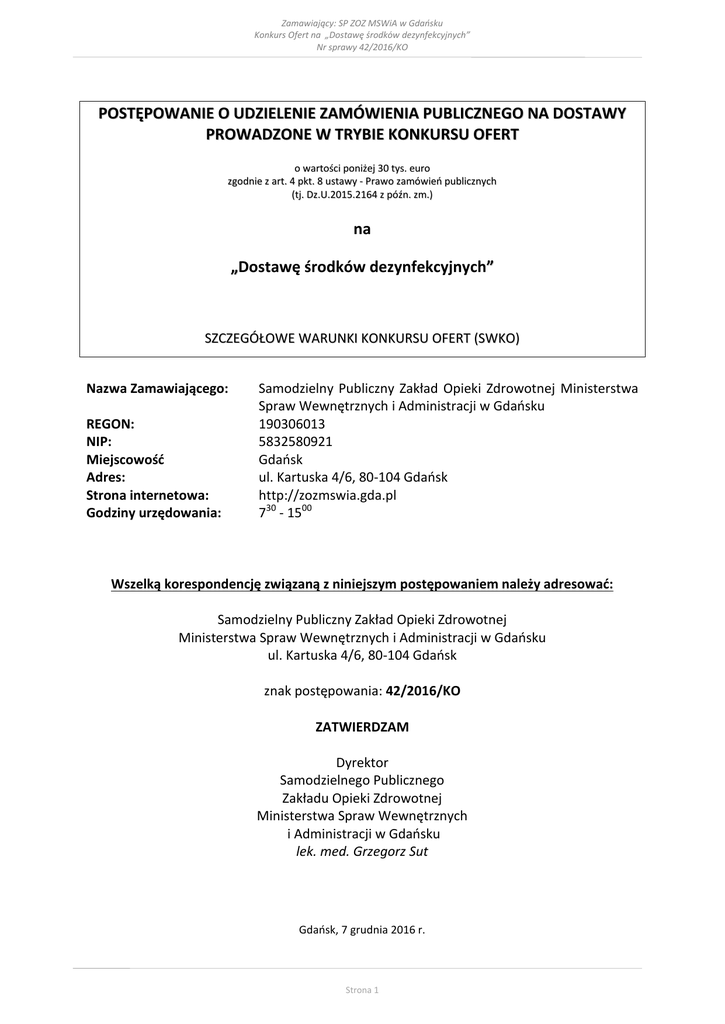 Zamawiający: SP ZOZ MSWiA w Gdańsku Konkurs Ofert na „Dostawę środków dezynfekcyjnych” Nr sprawy 42/2016/KO POSTĘPOWANIE O UDZIELENIE ZAMÓWIENIA PUBLICZNEGO NA DOSTAWY PROWADZONE W TRYBIE KONKURSU OFERT o wartości poniżej 30 tys. euro zgodnie z art. 4 pkt. 8 ustawy - Prawo zamówień publicznych (tj. Dz.U.2015.2164 z późn. zm.) na „Dostawę środków dezynfekcyjnych” SZCZEGÓŁOWE WARUNKI KONKURSU OFERT (SWKO) Nazwa Zamawiającego: REGON: NIP: Miejscowość Adres: Strona internetowa: Godziny urzędowania: Samodzielny Publiczny Zakład Opieki Zdrowotnej Ministerstwa Spraw Wewnętrznych i Administracji w Gdańsku 190306013 5832580921 Gdańsk ul. Kartuska 4/6, 80-104 Gdańsk http://zozmswia.gda.pl 730 - 1500 Wszelką korespondencję związaną z niniejszym postępowaniem należy adresować: Samodzielny Publiczny Zakład Opieki Zdrowotnej Ministerstwa Spraw Wewnętrznych i Administracji w Gdańsku ul. Kartuska 4/6, 80-104 Gdańsk znak postępowania: 42/2016/KO ZATWIERDZAM Dyrektor Samodzielnego Publicznego Zakładu Opieki Zdrowotnej Ministerstwa Spraw Wewnętrznych i Administracji w Gdańsku lek. med. Grzegorz Sut Gdańsk, 7 grudnia 2016 r. Strona 1 Zamawiający: SP ZOZ MSWiA w Gdańsku Konkurs Ofert na „Dostawę środków dezynfekcyjnych” Nr sprawy 42/2016/KO SPIS TREŚCI Rozdział 1. Rozdział 2. Rozdział 3. Rozdział 4. Rozdział 5. Rozdział 6. Rozdział 7. Rozdział 8. Załącznik Nr 1 do SWKO Załącznik Nr 2 do SWKO Załącznik Nr 3 do SWKO Opis przedmiotu zamówienia .................................................................................... 3 Termin wykonania zamówienia ................................................................................. 3 Wykaz oświadczeń i dokumentów potwierdzających spełnianie warunków udziału w niniejszym postępowaniu ....................................................................................... 4 Informacje o sposobie porozumiewania się Zamawiającego z Wykonawcami oraz przekazywania oświadczeń i dokumentów, a także wskazanie osoby uprawnionej do porozumiewania się z Wykonawcami ................................................................... 5 Opis sposobu przygotowania ofert ............................................................................ 5 Miejsce oraz termin składania i otwarcia ofert .......................................................... 6 Wybór oferty .............................................................................................................. 6 Opis sposobu obliczenia ceny .................................................................................... 6 ZAPOTRZEBOWANIE................................................................................................... 7 FORMULARZ „OFERTA” .............................................................................................. 8 WZÓR UMOWY ........................................................................................................ 10 Strona 2 Zamawiający: SP ZOZ MSWiA w Gdańsku Konkurs Ofert na „Dostawę środków dezynfekcyjnych” Nr sprawy 42/2016/KO Rozdział 1. 1. 2. 3. 4. 5. 6. 7. 8. 9. 10. 11. 12. 13. Przedmiotem zamówienia jest dostawa środków dezynfekcyjnych. Zamawiający podzielił zamówienie na 26 zadań i dopuszcza składanie ofert częściowych. Przy pierwszej dostawie Wykonawca zobowiązany będzie do dostarczenia ulotek informacyjnych w języku polskim w ilości 20 szt. do każdego rodzaju preparatu. Wszystkie oferowane preparaty dezynfekcyjne i antyseptyczne muszą być przeznaczone do zastosowania w obszarze medycznym. W przypadku takiej potrzeby Wykonawca zobowiązany będzie do przeprowadzenia bezpłatnego szkolenia personelu Zamawiającego w zakresie stosowania oferowanych produktów. Zamawiający wymaga, aby skuteczność działania (stężenie, spektrum, czas) była potwierdzona certyfikatami wydanymi przez laboratoria działające zgodnie z systemem GLP, na podstawie badań wykonanych metodami przewidzianymi dla obszaru medycznego, określonymi w normach PN-EN lub innymi uznanymi międzynarodowo, albo metodami zaakceptowanymi przez Urząd Rejestracji Produktów Leczniczych, Wyrobów Medycznych i Produktów Biobójczych. Wykonawca będzie zobowiązany do nieodpłatnego użyczenia i zainstalowania (najpóźniej w ciągu 30 dni od daty podpisania umowy) automatycznego urządzenia dozującego na czas trwania umowy oraz nieodpłatnej kalibracji urządzenia w sposób odpowiedni do zaproponowanego stężenia roztworu użytkowego w czasie nie dłuższym niż 7 dni od złożenia pierwszego zamówienia (dotyczy zadania nr 13). Zamawiający wymaga, aby informacje zawarte w Kartach Charakterystyki preparatów, dotyczące zużytych roztworów roboczych oraz opakowań w części ekologia i postępowanie z odpadami, a także wpływu na człowieka nie wymagały szczególnego i kosztownego postępowania. Zamawiający wymaga, aby dołączone do oferty ulotki/foldery informacyjne zawierały informacje potwierdzające wymagania określone przez Zamawiającego. Podczas analizy ofert Zamawiający będzie odnosił się do informacji zawartych się w dostarczonej dokumentacji. Zamawiający wymaga, aby: 1) 50% opakowań zbiorczych o pojemności większej lub równej 5 litrów było wyposażonych w pompki dozujące. 2) Wszystkie opakowania o pojemności większej niż 100 ml preparatu do pielęgnacji rąk były wyposażone w pompki dozujące (dotyczy zadania nr 10). 3) Wszystkie opakowania 1 litrowe preparatu z zadania nr 21a były wyposażone w pompki dozujące 8 ml. 4) Wszystkie opakowania preparatu z zadania 16 były wyposażone w rozpylacz lub głowicę spieniającą. 5) Wszystkie opakowania preparatu z zadania 17 były wyposażone w głowicę spieniającą. Wszystkie dostarczane preparaty muszą posiadać w chwili dostawy terminy ważności min. 12 miesięcy. Data ważności musi być umieszczona na każdym jednostkowym opakowaniu. Zamawiający wymaga, aby oferowa