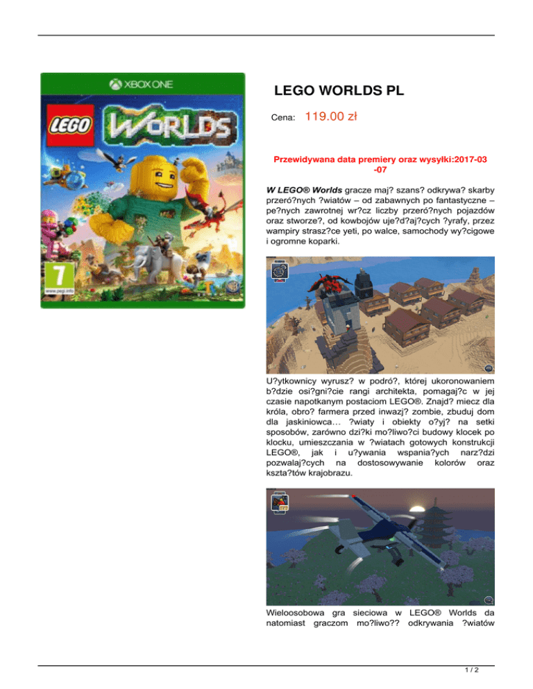 LEGO WORLDS PL Cena: 119.00 zł Przewidywana data premiery oraz wysyłki:2017-03 -07 W LEGO® Worlds gracze maj? szans? odkrywa? skarby przeró?nych ?wiatów – od zabawnych po fantastyczne – pe?nych zawrotnej wr?cz liczby przeró?nych pojazdów oraz stworze?, od kowbojów uje?d?aj?cych ?yrafy, przez wampiry strasz?ce yeti, po walce, samochody wy?cigowe i ogromne koparki. U?ytkownicy wyrusz? w podró?, której ukoronowaniem b?dzie osi?gni?cie rangi architekta, pomagaj?c w jej czasie napotkanym postaciom LEGO®. Znajd? miecz dla króla, obro? farmera przed inwazj? zombie, zbuduj dom dla jaskiniowca… ?wiaty i obiekty o?yj? na setki sposobów, zarówno dzi?ki mo?liwo?ci budowy klocek po klocku, umieszczania w ?wiatach gotowych konstrukcji LEGO®, jak i u?ywania wspania?ych narz?dzi pozwalaj?cych na dostosowywanie kolorów oraz kszta?tów krajobrazu. Wieloosobowa gra sieciowa w LEGO® Worlds da natomiast graczom mo?liwo?? odkrywania ?wiatów 1/2 innych u?ytkowników, wspólnego tworzenia, a tak?e zabawy w trybie wspó?pracy lub rywalizacji w samodzielnie stworzonym otoczeniu. 2/2 Powered by TCPDF (www.tcpdf.org)