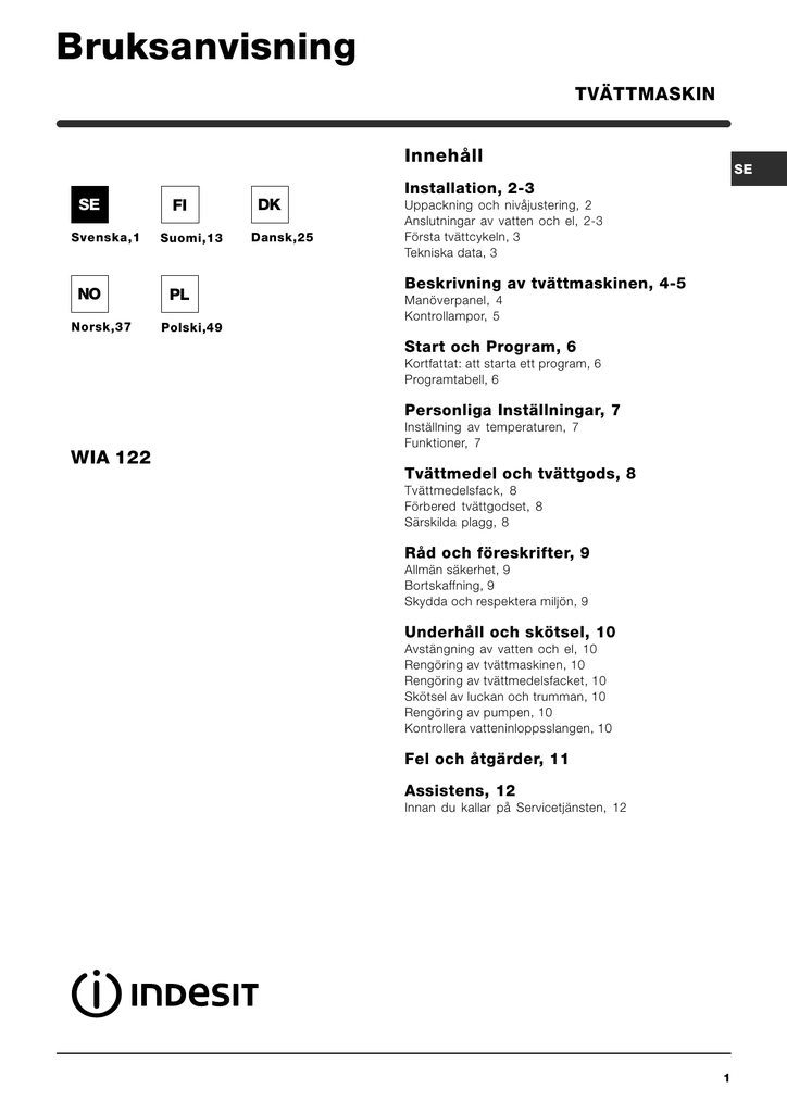 Bruksanvisning TVÄTTMASKIN Innehåll SE Svenska,1 NO Norsk,37 FI Suomi,13 PL Polski,49 DK Dansk,25 SE Installation, 2-3 Uppackning och nivåjustering, 2 Anslutningar av vatten och el, 2-3 Första tvättcykeln, 3 Tekniska data, 3 Beskrivning av tvättmaskinen, 4-5 Manöverpanel, 4 Kontrollampor, 5 Start och Program, 6 Kortfattat: att starta ett program, 6 Programtabell, 6 Personliga Inställningar, 7 WIA 122 Inställning av temperaturen, 7 Funktioner, 7 Tvättmedel och tvättgods, 8 Tvättmedelsfack, 8 Förbered tvättgodset, 8 Särskilda plagg, 8 Råd och föreskrifter, 9 Allmän säkerhet, 9 Bortskaffning, 9 Skydda och respektera miljön, 9 Underhåll och skötsel, 10 Avstängning av vatten och el, 10 Rengöring av tvättmaskinen, 10 Rengöring av tvättmedelsfacket, 10 Skötsel av luckan och trumman, 10 Rengöring av pumpen, 10 Kontrollera vatteninloppsslangen, 10 Fel och åtgärder, 11 Assistens, 12 Innan du kallar på Servicetjänsten, 12 1 Installation Det är viktigt att denna bruksanvisning bevaras så att den kan konsulteras vid behov. Vid försäljning, överlåtelse eller flytt ska du försäkra dig om att bruksanvisningen förblir tillsammans med tvättmaskinen så att den nye ägaren kan ta del av dess information och varningar. SE Läs instruktionerna noggrant: där finns viktig information om installation, användning och säkerhet. Uppackning och nivåjustering En ordentligt utförd nivåjustering ger maskinen stabilitet och hindrar uppkomsten av vibrationer, buller samt att maskinen flyttar sig under användningen. Om golvet har heltäckningsmatta eller en annan matta ska fötterna justeras på så sätt att det finns tillräckligt utrymme under tvättmaskinen för ventilationen. Anslutningar av vatten och el Anslutning av vatteninloppsslangen Uppackning 1. Ta ur tvättmaskinen ur förpackningen. 2. Kontrollera att tvättmaskinen inte skadats under transporten. Om det skulle finnas skador ska du inte ansluta den utan kontakta återförsäljaren. 3. Ta bort de 3 skruvarna och gummidelen med dess avståndsbricka ,som sitter på bakstycket, och som skyddat maskinen under transporten (se figur). A 1. För in packningen A i inloppslangens ände och skruva fast den till en kallvattenkran som har en öppning med 3/4 gasgänga (se figur). Innan du ansluter slangen ska du låta vattnet rinna tills det är helt klart. 2. Anslut inloppsslangen till tvättmaskinen genom att skruva fast den till det avsedda vattenuttaget i den bakre delen uppe till höger (se figur). 4. Stäng igen hålen med de medföljande plastpluggarna. 5. Spar alla delar: om tvättmaskinen måste flyttas ska de monteras tillbaka. Förpackningsmaterialet får inte användas av barn som leksaker 3. Se till att slangen inte har några veck eller är hopklämd. Nivåjustering Kranens vattentryck måste befinna sig inom de värden som finns i tabellen över Tekniska Data (se sidan intill). 1. Installera tvättmaskinen på ett hårt och jämnt underlag utan att stödja den mot väggar, möbler eller annat. 2. Om golvet inte skulle vara fullständigt plant kan ojämnheten kompenseras genom att de främre fötterna dras åt eller lossas (se figur); lutningsvinkeln, mätt på arbetsplanet, får inte överstiga 2°. 2 Om längden på inloppsslangen inte är tillräcklig ska du vända dig fackhandeln eller en auktoriserad tekniker. Anslutning av avloppsslangen SE Sladden får inte böjas eller tryckas ihop. Installation 65 - 100 cm Anslut avloppsslangen, utan att böja den, till en avloppsledning eller ett väggavlopp som är placerat på en höjd mellan 65 och 100 cm från marken; Använd inte skarvsladdar eller multipelkontakter. Driftsladden får endast bytas ut av behöriga tekniker. Observera! Företaget avsäger sig allt ansvar om dessa föreskrifter inte respekteras. Beskrivning Första tvättcykeln Tvättmedel Vi avråder från att använda förlängningsslangar; om det ändå skulle vara nödvändigt måste förlängningsslangen ha samma diameter som originalslangen och den får inte vara längre än 150 cm. Efter installationen, innan du börjar använda maskinen, ska du utföra en tvättcykel med tvättmedel men utan tvättgods, genom att ställa in ett program på 90°C utan förtvätt. Program eller lägg den i ett handfat eller ett badkar och bind fast den bifogade skenan till kranen (se figur). Den fria slangänden får inte vara nedsänkt i vatten. Tekniska data bredd 59,5 cm höjd 85 cm djup 52,5 cm Kapacitet från 1 till 5 kg uttaget klarar maskinens maxeffekt som anges i tabellen över Tekniska Data (se intill); Elanslutningar Spänning på 220/230 Volt 50 Hz max.absorberad effektförbrukning 1850 W spänningstillförseln befinner sig inom de värden som anges i tabellen över Tekniska Data (se intill); Vattenanslutningar Max. tryck 1 MPa (10 bar) min. tryck 0,05 MPa (0,5 bar) trummans kapacitet 46 liter Centrifugeringshastighet upp till 1200 varv/min Tvättprov har utförts i enlighet med standard IEC456 program 3; temperatur 60°C; utförd med 5 kg last. Innan du sätter i kontakten i uttaget ska du försäkra dig om att: uttaget är jordat och normenligt; Uttaget passar ihop med tvättmaskinens stickkontakt. Om det inte förhåller sig på detta vis ska du byta ut uttaget eller kontakten. När tvättmaskinen har installerats ska strömuttaget vara lättåtkomligt. Denna utrustning är i enlighet med följande EU-direktiv: - 73/23/EU från 19/02/73 (lågspänning) och följande ändringar - 89/336/EU från 03/05/89 (elektromagnetisk kompatibilitet) och följande ändringar - 2002/96/CE Assistens Tvättmaskinen får inte installeras utomhus, inte ens om installationsplatsen skyddas av ett tak, eftersom det är mycket farligt att utsätta den för regn och oväder. Fel Mått Underhåll WIA 122 Föreskrifter Modell Elanslutning 3 Beskrivning av tvättmaskinen Manöverpanel SE FUNKTION Sknappar Kontrollampa BLOCKERAD LUCKA START/ PAUS knapp Tvättmedelsfack Kontrollampor PROGRAM/AVPÅvred TEMPERATURvred Tv