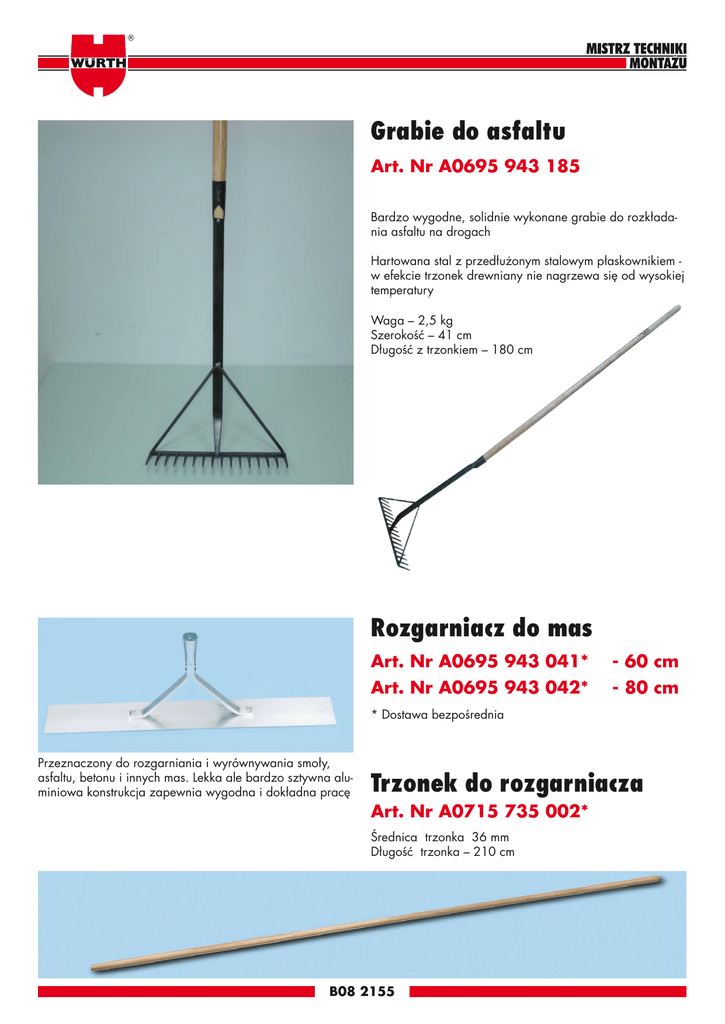 Grabie do asfaltu Art. Nr A0695 943 185 Bardzo wygodne, solidnie wykonane grabie do rozkładania asfaltu na drogach Hartowana stal z przedłużonym stalowym płaskownikiem w efekcie trzonek drewniany nie nagrzewa się od wysokiej temperatury Waga – 2,5 kg Szerokość – 41 cm Długość z trzonkiem – 180 cm Rozgarniacz do mas Art. Nr A0695 943 041* - 60 cm Art. Nr A0695 943 042* - 80 cm * Dostawa bezpośrednia Przeznaczony do rozgarniania i wyrównywania smoły, asfaltu, betonu i innych mas. Lekka ale bardzo sztywna aluminiowa konstrukcja zapewnia wygodna i dokładna pracę Trzonek do rozgarniacza Art. Nr A0715 735 002* Średnica trzonka 36 mm Długość trzonka – 210 cm B08 2155
