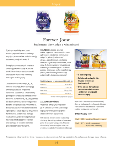 Napoje Forever Joost Suplement diety, płyn z witaminami Z jednym wyciÊni´ciem Joost mo˝esz poprawiç smak dowolnego napoju, a jednoczeÊnie zadbaç o swojà codziennà porcj´ witaminy B. Dwa płyny o owocowych smakach zmieniajà zwykłe napoje w pyszne drinki. Do wyboru masz dwa smaki: ananasowo-kokosowo-imbirowy oraz jagód acai i cytryny. SK¸ADNIKI: Woda, aromat, cukier, regulator kwasowoÊci – kwas cytrynowy, substancja utrzymujàca wilgoç – glicerol, witamina C (kwas L-askorbinowy), substancja słodzàca – glikozydy stewiolowe, witamina B6 (chlorowodorek pirydoksyny), substancje konserwujàce – sorbinian potasu, benzoesan sodu, kwas foliowy (kwas pteroilomonoglutaminowy), witamina B12 (cyjanokobalamina). Składniki od˝ywcze w zalecanej porcji dziennej (2 ml) Joost to êródło witaminy C, B6, B12 i kwasu foliowego, które pomagajà zmniejszyç uczucie zm´czenia i znu˝enia. Dodatkowo, kwas foliowy pomaga we właÊciwej syntezie aminokwasów, a witaminy B6 i B12 przyczyniajà si´ do utrzymania prawidłowego metabolizmu energetycznego. Witamina B6 bierze te˝ udział w metabolizmie białka i glikogenu, a tak˝e regulacji aktywnoÊci hormonalnej. Witamina C pomaga w utrzymaniu prawidłowego funkcjonowania układu odpornoÊciowego oraz pomaga w ochronie komórek przed stresem oksydacyjnym. Witamina C 40 mg (50%)* Witamina B 6 1 mg (71%)* Kwas foliowy 200 µg (100%)* Witamina B12 2 µg (80%)* • 5 kcal w porcji • èródło witaminy B6, B12, kwasu foliowego i witaminy C • Dwa smaki do wyboru: ananasowo-kokosowo-imbirowy oraz jagód acai i cytryny *% RWS – referencyjnej wartoÊci spo˝ycia ZALECANE SPO˚YCIE: Wycisnàç 2 ml płynu i rozpuÊciç go w szklance (240 ml) ulubionego napoju Forever lub innego płynu albo wody. Piç 1 raz dziennie. Ostrze˝enia: Zawiera cukier i substancj´ słodzàcà. Nie nale˝y przekraczaç zalecanej porcji do spo˝ycia w ciàgu dnia. Preparat nie mo˝e byç stosowany jako substytut zró˝nicowanej diety. Prowadzenie zdrowego trybu ˝ycia i stosowanie zrównowa˝onej diety sà niezb´dne dla zachowania dobrego stanu zdrowia. Nie zaleca si´ stosowania u kobiet w cià˝y oraz karmiàcych. OPAKOWANIE: 60 ml Kod: 516 – smak jagód acai i cytryny Kod: 517 –smak ananasowo-kokosowo-imbirowy Prowadzenie zdrowego trybu ˝ycia i stosowanie zrównowa˝onej diety sà niezb´dne dla zachowania dobrego stanu zdrowia. 14