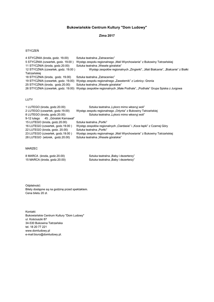 Bukowiańskie Centrum Kultury "Dom Ludowy" Zima 2017 STYCZEŃ 4 STYCZNIA (środa, godz. 19.00) 5 STYCZNIA (czwartek, godz. 19.00 ) 11 STYCZNIA (środa, godz.20.00) 12 STYCZNIA (czwartek, godz. 19.00 ) Tatrzańskiej 18 STYCZNIA (środa, godz. 19.00) 19 STYCZNIA (czwartek, godz. 19.00) 25 STYCZNIA (środa, godz.20.00) 26 STYCZNIA (czwartek, godz. 19.00) Sztuka teatralna „Zatraceniec” Występ zespołu regionalnego „Mali Wiyrchowianie” z Bukowiny Tatrzańskiej Sztuka teatralna „Wesele góralskie” Występ zespołów regionalnych „Zingierki”, „Mali Białcanie”, „Białcanie” z Białki Sztuka teatralna „Zatraceniec” Występ zespołu regionalnego „Zawaternik” z Leśnicy- Gronia Sztuka teatralna „Wesele góralskie” Występ zespołów regionalnych „Małe Podhale”, „Podhale” Grupa Spiska z Jurgowa LUTY 1 LUTEGO (środa, godz.20.00) 2 LUTEGO (czwartek, godz.19.00) 8 LUTEGO (środa, godz.20.00) 9-12 lutego 45. „Góralski Karnawał” 15 LUTEGO (środa, godz.20.00) 16 LUTEGO (czwartek, godz.19.00 ) 22 LUTEGO (środa, godz. 20.00) 23 LUTEGO (czwartek, godz.19.00 ) 28 LUTEGO (wtorek, godz.20.00) Sztuka teatralna „Lykorz mimo włosnyj woli” Występ zespołu regionalnego „Orlynta” z Bukowiny Tatrzańskiej Sztuka teatralna „Lykorz mimo włosnyj woli” Sztuka teatralna „Portki” Występ zespołów regionalnych „Ciardasie” i „Koce łapki” z Czarnej Góry Sztuka teatralna „Portki” Występ zespołu regionalnego „Mali Wiyrchowianie” z Bukowiny Tatrzańskiej Sztuka teatralna „Wesele góralskie” MARZEC 8 MARCA (środa, godz.20.00) 15 MARCA (środa, godz.20.00) Odpłatność: Bilety dostępne są na godzinę przed spektaklem. Cena biletu 20 zł. Kontakt: Bukowiańskie Centrum Kultury "Dom Ludowy" ul. Kościuszki 87 34-530 Bukowina Tatrzańska tel. 18 20 77 221 www.domludowy.pl e-mail:[email protected]. Sztuka teatralna „Baby i dezerterzy” Sztuka teatralna „Baby i dezerterzy”