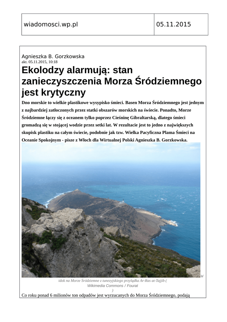 wiadomosci.wp.pl 05.11.2015 Agnieszka B. Gorzkowska akt. 05.11.2015, 10:18 Ekolodzy alarmują: stan zanieczyszczenia Morza Śródziemnego jest krytyczny Dno morskie to wielkie plastikowe wysypisko śmieci. Basen Morza Śródziemnego jest jednym z najbardziej zatłoczonych przez statki obszarów morskich na świecie. Ponadto, Morze Śródziemne łączy się z oceanem tylko poprzez Cieśninę Gibraltarską, dlatego śmieci gromadzą się w stojącej wodzie przez setki lat. W rezultacie jest to jedno z największych skupisk plastiku na całym świecie, podobnie jak tzw. Wielka Pacyficzna Plama Śmieci na Oceanie Spokojnym - pisze z Włoch dla Wirtualnej Polski Agnieszka B. Gorzkowska. W idok na Morze Śródziemne z tunezyjskiego przylądka Ar-Ras at-Tajjib ( Wikimedia Commons / Fourat ) Co roku ponad 6 milionów ton odpadów jest wyrzucanych do Morza Śródziemnego, podają włoskie media, z czego ponad 92 proc. to materiały wykonane z niebezpiecznych dla środowiska tworzyw sztucznych. Unoszące się na falach, wszelkiego rodzaju odpadki: plastik, guma, styropian, szkło, puszki aluminiowe, wata, itd., to zaledwie minimalna część zanieczyszczenia morskiego. 70 proc. odpadków osiada na dnie morza. Badania wykazały, że średnie zagęszczenie śmieci w Morzu Śródziemnym wynosi ponad 700 odpadów na km kwadratowy o średniej masie 100 kg na km kw. Tymczasem zagęszczenie mikroplastikami (drobinki mniejsze niż 5 mm) wynosi średnio 100 mln na km kw., przy czym szczególnie groźne zagęszczenie tych mikroskopijnych elementów rejestruje się na wybrzeżach północnych Włoch, południowej Francji i północnej Sardynii. Plastik na naszych stołach Stan włoskich mórz bezpośrednio przyczynia się do ogromnych strat gospodarczych uderzając w turystykę i rybołówstwo. Największe zagęszczenie odpadów zarejestrowano na Morzu Adriatyckim, znanym z najintensywniejszego połowu ryb w basenie Morza Śródziemnego. Ryby, żółwie, ptaki i ssaki morskie połykające odpadki (myląc je z pożywieniem), ryzykują masowym wymarciem przez uduszenie. Jednak zatopione śmiecistanowią zagrożenie nie tylko dla różnorodności biologicznej w morzu, plastik może przetrwać setki lat i jego fragmenty poprzez łańcuch pokarmowy ryb i ptaków trafiają prędzej czy później także na nasze stoły. Dlatego tak ważne jest podjęcie wspólnych wysiłków z udziałem wszystkich zainteresowanych stron i terytoriów. W kampanię na rzecz waloryzacji i ochrony wód morskich aktywnie włączyła się także Unia Europejska, co znalazło wyraz we wspólnej polityce morskiej w stosunku do czterech regionów: Morza Bałtyckiego, północno-wschodniego Oceanu Atlantyckiego, Morza Śródziemnego i Morza Czarnego. Unia działa Dyrektywa Parlamentu Europejskiego i Rady Marine Strategy 2008/56/WE, ustanawiającaramy działań UE na rzecz środowiska morskiego, ma na celu osiągnięcie dobrego stanu wód morskich do 2020 r., zapobieganie szkodliwej działalności człowieka, oraz ochronę i zachowanie ekosystemu morskiego. Na mocy dyrektywy, państwa członkowskie muszą przeprowadzić ocenę stanu środowiska swoich wód morskich, opracować programy, a następnie, zobowiązać się do ich wdrożenia i ciągłego monitorowania. Ma to na celu skończenie z progresywną zagładą różnorodności biologicznej i degradacją ekosystemów, przywracając je w miarę możliwości do pierwotnego stanu. Jak dotąd Włochy, Holandia i Niemcy najściślej przestrzegają reguł dyrektywy unijnej Marine Strategy. Rząd włoski przedsięwziął aktywne działania na poziomie europejskim, a także w całym rejonie basenu Morza Śródziemnego. Włoskie ministerstwo ochrony środowiska chce włączyć w programy wszystkie zainteresowane strony: mieszkańców, rybaków, płetwonurków, hodowców ryb, przemysłowców, lokalną administrację publiczną, instytucje, organizacje ekologiczne, przedstawicieli nauki, szkoły, itd. Organizowane są sympozja i konferencje międzynarodowe, warsztaty i kampanie informacyjne. W tym roku wdrożono rozbudowany system monitoringu ekosystemu morskiego i działań, które mogą mieć negatywny wpływ na środowisko. Jedną z takich akcji są międzynarodowe badania "Beach liter", zorganizowane w ramach kampanii "Clean-up the Med 2015" przez największą organizację ekologiczną Legambiente. Skontrolowano 87.200 m kw wiadomosci.wp.pl 05.11.2015 wybrzeży Włoch, Algierii, Chorwacji, Grecji, Hiszpanii, Turcji, Tunezji i Portugalii. Z badań wynikło, że najwięcej zanieczyszczeń znajduje się u wybrzeży Turcji, Algierii i Chorwacji. Inną inicjatywą jest włoski projekt ścisłej współpracy obywateli z instytutami naukowymi i instytucjami publicznymi CSMON-LIFE (Citizen Science MONitoring). Strategie na rzecz środowiska morskiego to wspólne wyzwanie dla Włoch i Europy, które wymaga poważnej zmiany kulturowej, co podkreślają włoscy ekolodzy. Morze jest jednym z najcenniejszych zasobów człowieka i może stać się główną dźwignią rozwoju, jeśli tylko będziemy potrafili połączyć wzrost gospodarczy ze zrównoważonym rozwojem środowiska.