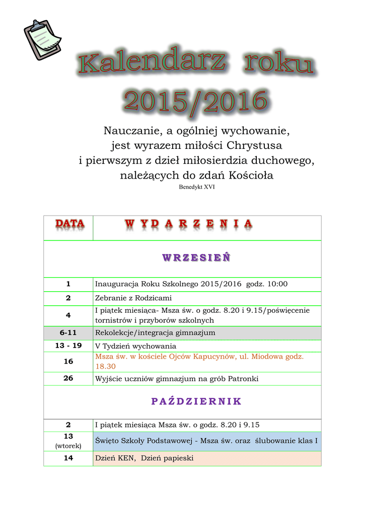 Nauczanie, a ogólniej wychowanie, jest wyrazem miłości Chrystusa i pierwszym z dzieł miłosierdzia duchowego, należących do zdań Kościoła Benedykt XVI DATA W YD A R Z E N I A WRZESIEŃ 1 Inauguracja Roku Szkolnego 2015/2016 godz. 10:00 2 Zebranie z Rodzicami 4 I piątek miesiąca- Msza św. o godz. 8.20 i 9.15/poświęcenie tornistrów i przyborów szkolnych 6-11 13 - 19 16 26 Rekolekcje/integracja gimnazjum V Tydzień wychowania Msza św. w kościele Ojców Kapucynów, ul. Miodowa godz. 18.30 Wyjście uczniów gimnazjum na grób Patronki PAŹDZIERNIK 2 13 (wtorek) 14 I piątek miesiąca Msza św. o godz. 8.20 i 9.15 Święto Szkoły Podstawowej - Msza św. oraz ślubowanie klas I Dzień KEN, Dzień papieski 16 Msza św. w kościele Ojców Kapucynów ul. Miodowa godz. 18.30 18 Przygotowanie do I Komunii Świętej 21 Rada Pedagogiczna 15.15 27 (poniedziałek) Święto Gimnazjum – Msza św. i ślubowanie uczniów kl. I oraz wyjście wszystkich uczniów gimnazjum na grób Patronki 28 Dzień otwarty 30 Szkolny Dzień Wszystkich Świętych LISTOPAD 6 I piątek miesiąca Msza św. o godz. 8.20 i 9.15 10 Uroczysty apel z okazji Narodowego Święta Niepodległości 1214 Forum Szkół Katolickich w Częstochowie Dla uczniów dni wolne od zajęć edukacyjnych 15 Przygotowanie do I Komunii Świętej 16 Msza św. w kościele Ojców Kapucynów ul. Miodowa godz. 18.30 18 Rada Pedagogiczna 16.00 25 Zebranie z Rodzicami 17:00-19:00 26 Wyjście uczniów gimnazjum na grób Patronki GRUDZIEŃ 4 13 16 17 I piątek miesiąca – Msza św. o godz. 8.20 i 9.15 Przygotowanie do I Komunii Świętej Msza św. u OO. Kapucynów godz. 18.30 (obowiązkowa obecność całej społeczności szkolnej ) Jasełka i spotkanie wigilijne w klasach – godz. 1700 oraz Dzień otwarty 21 XII 2015 – 31 XII 2015 ZIMOWA PRZERWA ŚWIĄTECZNA STYCZEŃ 6 2013 Uroczystość Objawienia Pańskiego - Orszak Trzech Króli 16 Msza św. w kościele Ojców Kapucynów ul. Miodowa godz. 18.30 / 17 Przygotowanie do I Komunii Świętej 25 Rada Pedagogiczna (klasyfikacja) 15.15 26 Wyjście uczniów gimnazjum na grób Patronki 27 Zebranie z Rodzicami (wywiadówka) LUTY 1 – 13 FERIE ZIMOWE 1 Rozpoczęcie nowego semestru 16 Msza św. w kościele Ojców Kapucynów ul. Miodowa godz. 18.30 17 Rada pedagogiczna - 16:00 22 Spotkanie rekrutacyjne – SP – 17:00 23 Spotkanie rekrutacyjne G – 17:00 24 Dzień otwarty 26 Wyjście uczniów gimnazjum na grób Patronki MARZEC 4 I piątek miesiąca – Msza św. o godz. 8.20 i 9.15 9 Rada pedagogiczna – 16:00 16 Msza św. w kościele Ojców Kapucynów ul. Miodowa godz. 18.30 16 - 20 Rekolekcje Wielkopostne 16-18 Rekolekcje dla uczniów SP i G 18-19 Rekolekcje dla rodziców i nauczycieli 20 Wspólne zakończenie rekolekcji: uczniowie + rodzice + nauczyciele godz. 12:00 24 - 29 Wiosenna przerwa świąteczna KWIECIEŃ 5 SPRAWDZIAN – Kl. VI szkoły podstawowej 13 Rada pedagogiczna – 16:00 16 Msza św. w kościele Ojców Kapucynów ul. Miodowa godz. 18.30 17 Przygotowanie do I Komunii Świętej 18 EGZAMIN / cz. humanistyczna – kl. III gimnazjum 19 EGZAMIN / cz. matematyczno przyrodnicza 20 EGZAMIN / j. obcy nowożytny 27 Dzień otwarty w godz. 17.00 – 19.00 Akademia majowa MAJ 2 Dzień Flagi Narodowej - Dzień wolny od zajęć 6 I piątek miesiąca – Msza św. o godz. 8.20 i 9.15 8 Pierwsza Komunia Święta 10 Pielgrzymka uczniów klas II do Częstochowy 11 Rada pedagogiczna – 15:15/ Zebranie z rodzicami 16 Msza św. w kościele Ojców Kapucynów ul. Miodowa godz. 18.30 16Wycieczki, zielone szkoły 221 CZERWIEC 3 I piątek miesiąca – Msza św. o godz. 8.20 i 9.15 12 Dzień Rodziny / Festyn rodzinny 15 Rada pedagogiczna klasyfikacyjna SP – 15:15 16 Rada pedagogiczna klasyfikacyjna G - 16:00 16 Msza św. w kościele Ojców Kapucynów ul. Miodowa godz. 18.30 17 Szkolny Dzień Sportu 22 Pożegnanie kl. VI 23 Zakończenie dla gimnazjum godz 16.00 24 Zakończenie roku szkolnego 27 Dokumentacja 28 Plenarna rada pedagogiczna godz. 10:00 LIPIEC – SIERPIEŃ : WAKACJE 1 WRZEŚNIA 2016 rozpoczęcie nowego roku szkolnego godz. 10.00 W roku szkolnym 2015/2016 dodatkowymi dniami wolnymi od zajęć dydaktycznych w Zespole Szkół (SP + G) są: 12, 13 listopada 2015 r. i 2 maja 2016 r.