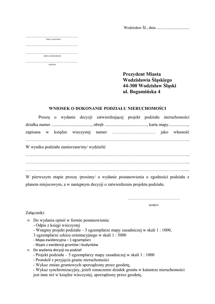 Wodzisław Śl., dnia ................................. ........................................................................ (imię i nazwisko) ........................................................................ ........................................................................ (adres zamieszkania) ........................................................................ (telefon) Prezydent Miasta Wodzisławia Śląskiego 44-300 Wodzisław Śląski ul. Bogumińska 4 WNIOSEK O DOKONANIE PODZIAŁU NIERUCHOMOŚCI Proszę o wydanie decyzji zatwierdzającej projekt podziału nieruchomości działka numer ....................................., obręb ......................................., karta mapy.................., zapisana w księdze wieczystej numer ………………………… jako własność …………………………………………………………………………………………………... W wyniku podziału zamierzam/my/ wydzielić …………………………………………………………………………………………………... …………………………………………………………………………………………………... ………………………………………………………………………………………………....... W pierwszym etapie proszę /prosimy/ o wydanie postanowienia o zgodności podziału z planem miejscowym, a w następnym decyzji o zatwierdzeniu projektu podziału. ........................................................................ (podpis) Załączniki: • • Do wydania opinii w formie postanowienia: - Odpis z księgi wieczystej - Wstępny projekt podziału – 3 egzemplarze mapy zasadniczej w skali 1 : 1000, 3 egzemplarze szkicu orientacyjnego w skali 1 : 5000 - Mapa ewidencyjna – 1 egzamplarz - Wypis z ewidencji gruntów i budynków Do wydania decyzji na podział - Projekt podziału – 5 egzemplarzy mapy zasadniczej w skali 1 : 1000 - Protokół z przyjęcia granic nieruchomości - Wykaz zmian gruntowych sporządzony przez geodetę, - Wykaz synchronizacyjny, jeżeli oznaczenie działek gruntu w katastrze nieruchomości jest inne niż w księdze wieczystej, sporządzony przez geodetę,