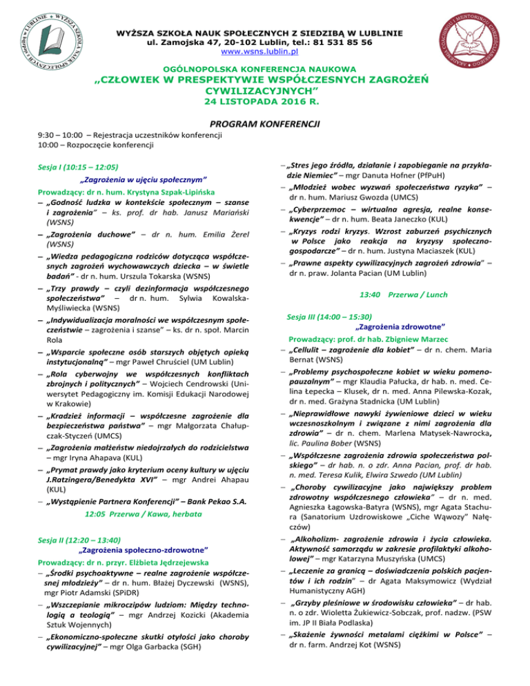WYŻSZA SZKOŁA NAUK SPOŁECZNYCH Z SIEDZIBĄ W LUBLINIE ul. Zamojska 47, 20-102 Lublin, tel.: 81 531 85 56 www.wsns.lublin.pl OGÓLNOPOLSKA KONFERENCJA NAUKOWA „CZŁOWIEK W PRESPEKTYWIE WSPÓŁCZESNYCH ZAGROŻEŃ CYWILIZACYJNYCH” 24 LISTOPADA 2016 R. PROGRAM KONFERENCJI 9:30 – 10:00 – Rejestracja uczestników konferencji 10:00 – Rozpoczęcie konferencji Sesja I (10:15 – 12:05) „Zagrożenia w ujęciu społecznym” Prowadzący: dr n. hum. Krystyna Szpak-Lipińska „Godność ludzka w kontekście społecznym – szanse i zagrożenia” – ks. prof. dr hab. Janusz Mariański (WSNS) „Zagrożenia duchowe” – dr n. hum. Emilia Żerel (WSNS) „Wiedza pedagogiczna rodziców dotycząca współczesnych zagrożeń wychowawczych dziecka – w świetle badań” - dr n. hum. Urszula Tokarska (WSNS) „Trzy prawdy – czyli dezinformacja współczesnego społeczeństwa” – dr n. hum. Sylwia KowalskaMyśliwiecka (WSNS) „Indywidualizacja moralności we współczesnym społeczeństwie – zagrożenia i szanse” – ks. dr n. społ. Marcin Rola „Wsparcie społeczne osób starszych objętych opieką instytucjonalną” – mgr Paweł Chruściel (UM Lublin) „Rola cyberwojny we współczesnych konfliktach zbrojnych i politycznych” – Wojciech Cendrowski (Uniwersytet Pedagogiczny im. Komisji Edukacji Narodowej w Krakowie) „Kradzież informacji – współczesne zagrożenie dla bezpieczeństwa państwa” – mgr Małgorzata Chałupczak-Styczeń (UMCS) „Zagrożenia małżeństw niedojrzałych do rodzicielstwa – mgr Iryna Ahapava (KUL) „Prymat prawdy jako kryterium oceny kultury w ujęciu J.Ratzingera/Benedykta XVI” – mgr Andrei Ahapau (KUL) „Wystąpienie Partnera Konferencji” – Bank Pekao S.A. „Stres jego źródła, działanie i zapobieganie na przykładzie Niemiec” – mgr Danuta Hofner (PfPuH) „Młodzież wobec wyzwań społeczeństwa ryzyka” – dr n. hum. Mariusz Gwozda (UMCS) „Cyberprzemoc – wirtualna agresja, realne konsekwencje” – dr n. hum. Beata Janeczko (KUL) „Kryzys rodzi kryzys. Wzrost zaburzeń psychicznych w Polsce jako reakcja na kryzysy społecznogospodarcze” – dr n. hum. Justyna Maciaszek (KUL) „Prawne aspekty cywilizacyjnych zagrożeń zdrowia” – dr n. praw. Jolanta Pacian (UM Lublin) 13:40 Przerwa / Lunch Sesja III (14:00 – 15:30) „Zagrożenia zdrowotne” 12:05 Przerwa / Kawa, herbata Sesja II (12:20 – 13:40) „Zagrożenia społeczno-zdrowotne” Prowadzący: dr n. przyr. Elżbieta Jędrzejewska „Środki psychoaktywne – realne zagrożenie współczesnej młodzieży” – dr n. hum. Błażej Dyczewski (WSNS), mgr Piotr Adamski (SPiDR) „Wszczepianie mikroczipów ludziom: Między technologią a teologią” – mgr Andrzej Kozicki (Akademia Sztuk Wojennych) „Ekonomiczno-społeczne skutki otyłości jako choroby cywilizacyjnej” – mgr Olga Garbacka (SGH) Prowadzący: prof. dr hab. Zbigniew Marzec „Cellulit – zagrożenie dla kobiet” – dr n. chem. Maria Bernat (WSNS) „Problemy psychospołeczne kobiet w wieku pomenopauzalnym” – mgr Klaudia Pałucka, dr hab. n. med. Celina Łepecka – Klusek, dr n. med. Anna Pilewska-Kozak, dr n. med. Grażyna Stadnicka (UM Lublin) „Nieprawidłowe nawyki żywieniowe dzieci w wieku wczesnoszkolnym i związane z nimi zagrożenia dla zdrowia” – dr n. chem. Marlena Matysek-Nawrocka, lic. Paulina Bober (WSNS) „Współczesne zagrożenia zdrowia społeczeństwa polskiego” – dr hab. n. o zdr. Anna Pacian, prof. dr hab. n. med. Teresa Kulik, Elwira Szwedo (UM Lublin) „Choroby cywilizacyjne jako największy problem zdrowotny współczesnego człowieka” – dr n. med. Agnieszka Łagowska-Batyra (WSNS), mgr Agata Stachura (Sanatorium Uzdrowiskowe „Ciche Wąwozy” Nałęczów) „Alkoholizm- zagrożenie zdrowia i życia człowieka. Aktywność samorządu w zakresie profilaktyki alkoholowej” – mgr Katarzyna Muszyńska (UMCS) „Leczenie za granicą – doświadczenia polskich pacjentów i ich rodzin” – dr Agata Maksymowicz (Wydział Humanistyczny AGH) „Grzyby pleśniowe w środowisku człowieka” – dr hab. n. o zdr. Wioletta Żukiewicz-Sobczak, prof. nadzw. (PSW im. JP II Biała Podlaska) „Skażenie żywności metalami ciężkimi w Polsce” – dr n. farm. Andrzej Kot (WSNS) 15:30 Zakończenie (sesja posterowa dostępna w sali wykładowej 120) „Wspieranie poczucia jakości życia u osób dorosłych uzdolnionych plastycznie” – dr n. społ. Barbara Cichy-Jasiocha (KUL) „Partycypacja obywatelska jako remedium na ponowoczesny kryzys – mit czy realna perspektywa?” – mgr Elżbieta SzulcWałecka (UMCS) „Zespół metaboliczny jako realne zagrożenie dla dorosłego człowieka- czy warto coś zmienić w stylu życia?” dr n. med. Agnieszka Łagowska-Batyra (WSNS), mgr Agata Stachura (Sanatorium Uzdrowiskowe „Ciche Wąwozy” Nałęczów) „Przekonanie o własnej skuteczności, a przystosowanie do pracy u osób w okresie średniej dorosłości” – dr n. społ. Paweł Kot (KUL) „Zagrożona uczciwość – zagrożone małżeństwo. Pedagogiczno-etyczne rozważania na temat uczciwości małżeńskiej” – mgr Katarzyna Hryszan „Postawy rodzicielskie i kompetencje interpersonalne w przyjaźni i miłości. Aspekty profilaktyczne.” – dr n. hum. Magdalena Dawidowicz (WSNS), dr hab. Waldemar Klinkosz (KUL) „Orientacja materialistyczna jako zgeneralizowane nastawienie na mieć- psychologiczne konsekwencje funkcjonowania w kulturze konsumpcyjnej” – dr n. hum. Martyna Płudowska (KUL) „Wpływ współczesnych zagrożeń na rozwój i role OSP w III RP” – lic. Magdalena Bubak (Uniwersytet Przyrodniczy w Krakowie) Patronat honorowy: JM Rektor Wyższej Szkoły Nauk Społecznych z siedzibą w Lublinie Dr n. hum. Emilia Żerel Partner konferencji: Patronat medialny: Patronat: Sponsorzy: Miejsce konferencji: Wyższej Szkoła Nauk Społecznych z siedzibą w Lublinie ul. Zamojska 47, 20-102 Lublin