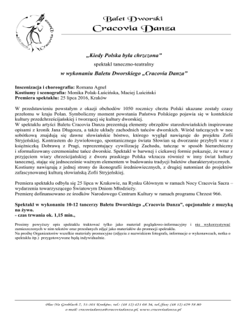 „Kiedy Polska była chrzczona” spektakl taneczno-teatralny w wykonaniu Baletu Dworskiego „Cracovia Danza” Inscenizacja i choreografia: Romana Agnel Kostiumy i scenografia: Monika Polak-Luścińska, Maciej Luściński Premiera spektaklu: 25 lipca 2016, Kraków W przedstawieniu powstałym z okazji obchodów 1050 rocznicy chrztu Polski ukazane zostały czasy przełomu w kraju Polan. Symboliczny moment powstania Państwa Polskiego pojawia się w kontekście kultury przedchrześcijańskiej i tworzącej się kultury dworskiej. W spektaklu artyści Baletu Cracovia Danza prezentują elementy obrzędów starosłowiańskich inspirowane opisami z kronik Jana Długosza, a także układy zachodnich tańców dworskich. Wśród tańczących w noc sobótkową znajdują się dawne słowiańskie bóstwo, którego wygląd nawiązuje do projektu Zofii Stryjeńskiej. Kontrastem do żywiołowego, spontanicznego świata Słowian są dworzanie przybyli wraz z księżniczką Dobrawą z Pragi, reprezentujący cywilizację Zachodu, tańcząc w sposób hierarchiczny i sformalizowany ceremonialne tańce dworskie. Spektakl w barwnej i ciekawej formie pokazuje, że wraz z przyjęciem wiary chrześcijańskiej z dworu praskiego Polska wkracza również w inny świat kultury tanecznej, stając się jednocześnie ważnym elementem w budowaniu tradycji baletów charakterystycznych. Kostiumy nawiązują z jednej strony do ikonografii średniowiecznych, z drugiej natomiast do projektów zafascynowanej kulturą słowiańską Zofii Stryjeńskiej. Premiera spektaklu odbyła się 25 lipca w Krakowie, na Rynku Głównym w ramach Nocy Cracovia Sacra – wydarzenia towarzyszącego Światowym Dniom Młodzieży. Premierę dofinansowano ze środków Narodowego Centrum Kultury w ramach programu Chrzest 966. Spektakl w wykonaniu 10-12 tancerzy Baletu Dworskiego „Cracovia Danza”, opcjonalnie z muzyką na żywo. - czas trwania ok. 1,15 min., Prosimy powyższy opis spektaklu traktować tylko jako materiał poglądowo-informacyjny i nie wykorzystywać zamieszczonych w nim tekstów oraz przesłanych zdjęć jako materiałów do promocji spektaklu. Na prośbę Organizatorów wszelkie materiały promocyjne (zdjęcia z nazwiskiem fotografa, informacje o wykonawcach, notka o spektaklu itp.) przygotowywane będą indywidualnie.