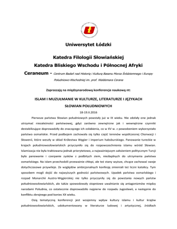 Uniwersytet Łódzki . Katedra Filologii Słowiańskiej Katedra Bliskiego Wschodu i Północnej Afryki Ceraneum - Centrum Badań nad Historią i Kulturą Basenu Morza Śródziemnego i Europy Południowo-Wschodniej im. prof. Waldemara Cerana Zapraszają na międzynarodową konferencje naukową nt: ISLAM I MUZUŁMANIE W KULTURZE, LITERATURZE I JĘZYKACH SŁOWIAN POŁUDNIOWYCH 18-19.II.2016 Pierwsze państwa Słowian południowych powstały już w IX wieku. Nie zdołały one jednak utrzymać niezależności państwowej, gdyż zarówno zewnętrzne jak i wewnętrzne czynniki destabilizujące doprowadziły do znaczącego ich osłabienia, co w XV w. z powodzeniem wykorzystało państwo osmańskie. Przed podbojem zachowała się tylko część terenów współczesnej Chorwacji i Słowenii, które weszły w skład Królestwa Węgier i imperium habsburskiego. Panowanie tureckie w krajach południowosłowiańskich przyczyniło się do rozpowszechnienia islamu wśród Słowian. Islamizacja nie była traktowana jednak priorytetowo, a najważniejszym założeniem politycznym Turcji było panowanie i czerpanie zysków z podbitych ziem, niezbędnych do utrzymania państwa osmańskiego. Na islam przechodzili przeważnie chłopi, ale też stany wyższe, chcące zachować swoje dotychczasowe przywileje. Ze względów ambicjonalnych konfesję zmieniali też liczni katolicy. Tym sposobem mogli dojść do najwyższych godności państwowych. Upadek państwa osmańskiego i rozpad Monarchii Austro-Węgierskiej nie tylko przyczyniły się do powstania nowych państw południowosłowiańskich, ale także spowodowały stopniowe uwalnianie się antagonizmów między narodami Południa, co ostatecznie doprowadziło najpierw do rozpadu Jugosławii, a następnie do konfliktu zbrojnego pod koniec XX wieku. Osią tematyczną konferencji jest wzajemny wpływ kultury islamu i kultur krajów południowosłowiańskich, udokumentowany w literaturze ludowej i artystycznej, źródłach historycznych oraz językoznawczych. Pojęcie "kultury" dla potrzeb konferencji chcemy definiować przede wszystkim w ujęciu dystrybutywnym, akcentując rolę historii, literatury, teatru oraz kina. Konferencja obejmuje następujące kręgi tematyczne: 1. Słowianie Południowi a kultura islamu. 2. Chrześcijaństwo wschodnie a islam. Polemika religijna, konflikty i współistnienie. 3. Dzieje relacji świata bizantyńsko-słowiańskiego z Arabami, Turkami i innymi etnosami muzułmańskimi. 4. Stereotypy kulturowe – obraz muzułmanina (Araba, Turka, itp.) w literaturze i sztuce etnosów bałkańskich oraz wizja wyznawcy prawosławia w kulturze islamu. 5. Wzajemne wpływy kulturowe – czy i jak cywilizacja islamu wzbogaciła kulturę kręgu bizantyńsko-słowiańskiego i vice versa. 6. Słowiańscy muzułmanie: Boszniacy, Gorani, Torbesze, Pomacy – w kulturze, literaturze, języku i historii Słowian południowych. 7. Wyznawcy innych religii pod panowaniem tureckim (historia, kultura, język). 8. Społeczno-polityczne problemy Bałkanów w perspektywie historycznej i dziś. Terminy: Prosimy o zgłoszenie tematów i przesłanie streszczeń do 1 grudnia 2015 roku – na adres: [email protected] Języki konferencji: polski, angielski, wszystkie języki słowiańskie Opłata konferencyjna: 300 zł. Opłata zawiera koszty druku materiałów pokonferencyjnych, nie obejmuje kosztów podróży, noclegu i wyżywienia uczestników. Inne szczegóły zostaną podane w późniejszym terminie. Organizatorzy: Sekretarze konferencji: Prof. dr hab. Marek Dziekan dr Zofia Brzozowska Prof. dr hab. Georgi Minczew mgr Marcin Antczak dr hab. Teresa Wolińska, prof. UŁ dr Anetta Buras-Marciniak dr Julia Mazurkiewicz-Sułkowska