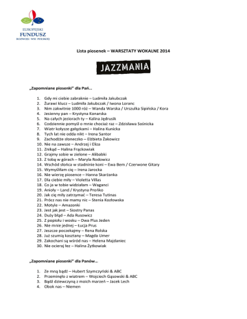 Lista piosenek – WARSZTATY WOKALNE 2014 „Zapomniane piosenki” dla Pań… 1. 2. 3. 4. 5. 6. 7. 8. 9. 10. 11. 12. 13. 14. 15. 16. 17. 18. 19. 20. 21. 22. 23. 24. 25. 26. 27. 28. 29. 30. Gdy mi ciebie zabraknie – Ludmiła Jakubczak Żurawi klucz – Ludmiła Jakubczak / Iwona Loranc Nim zakwitnie 1000 róż – Wanda Warska / Urszulka Sipińska / Kora Jesienny pan – Krystyna Konarska Na całych jeziorach ty – Kalina Jędrusik Codziennie pomyśl o mnie chociaż raz – Zdzisława Sośnicka Wiatr kołysze gałązkami – Halina Kunicka Tych lat nie odda nikt – Irena Santor Zachodźże słoneczko – Elżbieta Żakowicz Nie na zawsze – Andrzej i Eliza Znikąd – Halina Frąckowiak Grajmy sobie w zielone – Alibabki Z tobą w górach – Maryla Rodowicz Wschód słońca w stadninie koni – Ewa Bem / Czerwone Gitary Wymyśliłam cię – Irena Jarocka Nie wierzę piosence – Hanna Skarżanka Dla ciebie miły – Violetta Villas Co ja w tobie widziałam – Waganci Anioły – Land / Krystyna Prońko Jak cię miły zatrzymać – Teresa Tutinas Prócz nas nie mamy nic – Stenia Kozłowska Motyle – Amazonki Jest jak jest – Siostry Panas Duży błąd – Ada Rusowicz Z popiołu i wosku – Dwa Plus Jeden Nie mnie jednej – Łucja Prus Jeszcze poczekajmy – Rena Rolska Już szumią kasztany – Magda Umer Zakochani są wśród nas – Helena Majdaniec Nie ocieraj łez – Halina Żytkowiak „Zapomniane piosenki” dla Panów… 1. 2. 3. 4. Ze mną bądź – Hubert Szymczyński & ABC Przeminęło z wiatrem – Wojciech Gąsowski & ABC Bądź dziewczyną z moich marzeń – Jacek Lech Obok nas – Niemen 5. 6. 7. 8. 9. 10. 11. 12. 13. 14. 15. Czekam na twój przyjazd – Czerwone Gitary Do zobaczenia – Test Nie chodź dziewczyno do miasta – Marek Grechuta Masz przewrócone w głowie – Dżamble Spacer dziką plażą – Stan Borys Ty – Skaldowie Moja miła, moja cicha… – Jerzy Połomski Bądź wśród nas – Seweryn Krajewski Krajobrazy zimy – Trubadurzy Puste koperty – Piotr Szczepanik Smak i zapach pomarańczy – Tadeusz Woźniak