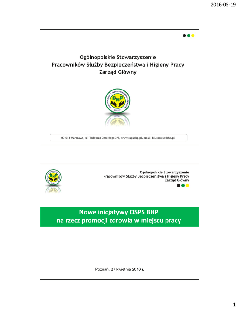 2016-05-19 Nowe inicjatywy OSPS BHP na rzecz promocji zdrowia w miejscu pracy 1 2016-05-19 Hipokrates radził lekarzom w swoich pismach: “Istnieje wiele zawodów związanych z niebezpieczeństwem powstania chorób, dlatego: ważne jest to, aby lekarz pytał chorego o zawód.” Źródło: R. Fenigsen, „Przysięga Hipokratesa” Pierwsze akty prawne dotyczące bezpieczeństwa pracy 1221 r. ordynacja górnicza określająca zasady bezpiecznego poszukiwania i wydobywania minerałów (książę Leszek Biały) 1592 r. instrukcja królewska zakazująca wwożenia alkoholu do kopalni (Król Zygmunt III) Źródło: Encyklopedia Brazilian Merit 2 2016-05-19 Georg Bauer (1494-1555) niemiecki lekarz, górnik, mineralog, metalurg i humanista, opisał szczegółowo zasady pracy pod ziemią, a także przy wytopie metali, zalecał m.in. stosowanie masek chroniących przed parami rtęci Bernardino Ramazzini (1633-1714) lekarz włoski, profesor uniwersytetów w Modenie i Padwie, prekursor higieny pracy i profilaktyki medycznej, sformułował pojęcie choroby zawodowej - „Uczona rozprawa o chorobach rzemieślników” 1700 r. 1840 r. (Anglia) wprowadzenie obowiązku pracodawcy zwrotu kosztów leczenia i zapewnienie renty okaleczonym w wypadkach przy pracy – kształtowanie pojęcia odpowiedzialności cywilnej 1953 r. (Polska) uchwała nr 592 Prezydium Rządu w sprawie zapewnienia postępu w dziedzinie bezpieczeństwa i higieny pracy 3 2016-05-19 Inicjatywy Ogólnopolskiego Stowarzyszenia Pracowników Służby BHP na rzecz promocji zdrowia Misją służby bhp jest dążenie do zapewnienia wysokiego poziomu bezpieczeństwa i ochrony zdrowia pracujących. Stowarzyszenie realizuje cele statutowe przy wykorzystaniu społecznej pracy członków. 2500 członków 38 oddziałów 4 2016-05-19 Działania oddziałów OSPSBHP • szkolenia doskonalące wiedzę i umiejętności służby bhp, organizowane przez zarządy oddziałów • seminaria, konferencje, konkursy, pikniki edukacyjne, wizyty techniczne w zakładach pracy, wyjazdy studyjne do innych krajów Wybrane działania naszych oddziałów 5 2016-05-19 Wybrane działania naszych oddziałów Planowane działania ZG OSPSBHP MIĘDZYNARODOWA KONFERENCJA „Ochrona życia i zdrowia pracujących w sektorze budownictwa ” Warszawa, 24 czerwca 2016 r., Hotel Gromada Centrum MIĘDZYNARODOWA KONFERENCJA „Ochrona zdrowia pracujących – wyzwania interdyscyplinarne dla służby bhp i służby medycyny pracy” Kraków, 1–2 grudnia 2016 r., Hotel Novotel City West 6 2016-05-19 Planowane działania ZG OSPSBHP WYJAZD STUDYJNY „Ochrona życia i zdrowia pracujących ” zorganizowany w ramach ogólnopolskiej kampanii „Zdrowie pracowników zyskiem firmy” Czechy, 30 czerwca – 2 lipca 2016 r. Modułowy program szkoleń dla służby bhp zatrudnionej na budowach • przygotowanie modułów szkolenia – współpraca z Porozumieniem dla Bezpieczeństwa w Budownictwie • przeprowadzenie pilotażowego szkolenia • wdrożenie projektu w różnych regionach Polski Planowane działania ZG OSPSBHP Wdrożenie etyki zawodowej w środowisku służby bhp Etyka zawodowa zespół zasad i obowiązków właściwych dla danego zawodu, zespół norm wskazujących, jak z moralnego punktu widzenia powinni się zachowywać przedstawiciele określonej profesji Zasada Etyki Zawodowej określa, jakie zachowania należy uznać za powinność w danej sytuacji, która wynika z określonego obowiązku. Zasady etyki zawodowej wynikają z ogólnych wartości i norm moralnych uwzględniających specyfikę wykonywania zadań służby bhp 7 2016-05-19 Dziękuję za uwagę www.ospsbhp.pl 8
