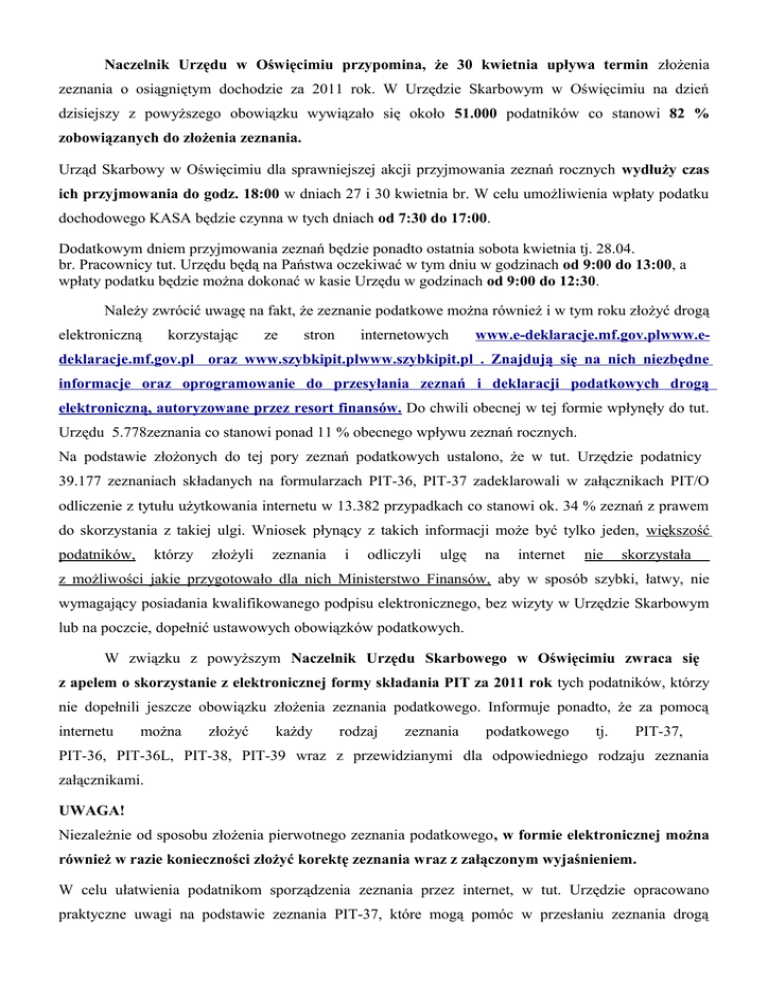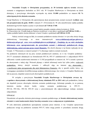 Naczelnik Urzędu w Oświęcimiu przypomina, że 30 kwietnia upływa termin złożenia zeznania o osiągniętym dochodzie za 2011 rok. W Urzędzie Skarbowym w Oświęcimiu na dzień dzisiejszy z powyższego obowiązku wywiązało się około 51.000 podatników co stanowi 82 % zobowiązanych do złożenia zeznania. Urząd Skarbowy w Oświęcimiu dla sprawniejszej akcji przyjmowania zeznań rocznych wydłuży czas ich przyjmowania do godz. 18:00 w dniach 27 i 30 kwietnia br. W celu umożliwienia wpłaty podatku dochodowego KASA będzie czynna w tych dniach od 7:30 do 17:00. Dodatkowym dniem przyjmowania zeznań będzie ponadto ostatnia sobota kwietnia tj. 28.04. br. Pracownicy tut. Urzędu będą na Państwa oczekiwać w tym dniu w godzinach od 9:00 do 13:00, a wpłaty podatku będzie można dokonać w kasie Urzędu w godzinach od 9:00 do 12:30. Należy zwrócić uwagę na fakt, że zeznanie podatkowe można również i w tym roku złożyć drogą elektroniczną korzystając ze stron internetowych www.e-deklaracje.mf.gov.plwww.e- deklaracje.mf.gov.pl oraz www.szybkipit.plwww.szybkipit.pl . Znajdują się na nich niezbędne informacje oraz oprogramowanie do przesyłania zeznań i deklaracji podatkowych drogą elektroniczną, autoryzowane przez resort finansów. Do chwili obecnej w tej formie wpłynęły do tut. Urzędu 5.778zeznania co stanowi ponad 11 % obecnego wpływu zeznań rocznych. Na podstawie złożonych do tej pory zeznań podatkowych ustalono, że w tut. Urzędzie podatnicy 39.177 zeznaniach składanych na formularzach PIT-36, PIT-37 zadeklarowali w załącznikach PIT/O odliczenie z tytułu użytkowania internetu w 13.382 przypadkach co stanowi ok. 34 % zeznań z prawem do skorzystania z takiej ulgi. Wniosek płynący z takich informacji może być tylko jeden, większość podatników, którzy złożyli zeznania i odliczyli ulgę na internet nie skorzystała z możliwości jakie przygotowało dla nich Ministerstwo Finansów, aby w sposób szybki, łatwy, nie wymagający posiadania kwalifikowanego podpisu elektronicznego, bez wizyty w Urzędzie Skarbowym lub na poczcie, dopełnić ustawowych obowiązków podatkowych. W związku z powyższym Naczelnik Urzędu Skarbowego w Oświęcimiu zwraca się z apelem o skorzystanie z elektronicznej formy składania PIT za 2011 rok tych podatników, którzy nie dopełnili jeszcze obowiązku złożenia zeznania podatkowego. Informuje ponadto, że za pomocą internetu można złożyć każdy rodzaj zeznania podatkowego tj. PIT-37, PIT-36, PIT-36L, PIT-38, PIT-39 wraz z przewidzianymi dla odpowiedniego rodzaju zeznania załącznikami. UWAGA! Niezależnie od sposobu złożenia pierwotnego zeznania podatkowego, w formie elektronicznej można również w razie konieczności złożyć korektę zeznania wraz z załączonym wyjaśnieniem. W celu ułatwienia podatnikom sporządzenia zeznania przez internet, w tut. Urzędzie opracowano praktyczne uwagi na podstawie zeznania PIT-37, które mogą pomóc w przesłaniu zeznania drogą elektroniczną. Uwagi te zamieszczono na stronie www.usoswiecim.pl Bez względu na wybór formy, w której składa się zeznanie - każdy podatnik powinien również zadbać o to, aby zeznanie było złożone prawidłowo i nie zawierało błędów. Najczęściej popełniane przez podatników błędy to: • przekroczenie limitów ulg i odliczeń, • brak podpisu na zeznaniu, • nieprawidłowo przenoszone kwoty podlegające odliczeniom z załączników do formularza zeznania podatkowego, • brak danych dziecka w załączniku PIT/O, • z punktu widzenia rejestracji podawanie adresu zameldowania zamiast adresu zamieszkania, • nieodliczanie składek na ubezpieczenie społeczne czy zdrowotne, • błędy w numerze KRS Organizacji Pożytku Publicznego, • nieprawidłowo zaokrąglana kwota podatku przekazywana na rzecz OPP. Dla zmniejszenia ryzyka ich popełniania wyjaśnia się, że przepisy ustawy o podatku dochodowym od osób fizycznych dla każdej ulgi czy odliczenia stanowią o ich wysokości i warunkach w jakich mogą być stosowane. Kto nie dysponuje przepisami ustawy ma możliwość odszukania niezbędnych informacji na stronie urzędu www.usoswiecim.pl lub na stronie Ministerstwa Finansów www.mofnet.gov.pl w części Podatki/Broszury informacyjne lub w części Podatki/Formularze/PIT w zakresie odpowiedniego rodzaju Formularza np. PIT/O broszura. Ponadto każdy Urząd Skarbowy dysponuje broszurami dla poszczególnych rodzajów ulg, w których w przystępny sposób przedstawiono żądane informacje. W Urzędzie Skarbowym w Oświęcimiu broszury informacyjne znajdują się na sali obsługi podatnika. Tam również można uzyskać potrzebne informacje. Nie należy również zapominać o wykazywaniu w zeznaniach składek na ubezpieczenie społeczne czy zdrowotne, gdyż ich pominięcie wpływa na zwiększenie zobowiązania podatkowego. Błędy w numerze KRS Organizacji Pożytku Publicznego są o tyle istotne, że ich popełnienie może skutkować przesłaniem środków na konto innej organizacji pożytku publicznego, gdyż w zeznaniu podajemy tylko numer KRS OPP (bez nazwy organizacji). Poświęćmy więc na tę część zeznania również uwagę. Naczelnik Urzędu Skarbowego w Oświęcimiu zauważa, że zeznanie roczne prawidłowo wypełnione złożone drogą elektroniczną to korzyść dla Państwa w postaci szybszego zwrotu podatku dochodowego, a dla Urzędu mniejsze koszty i sprawniejsza obsługa Państwa zeznań rocznych.