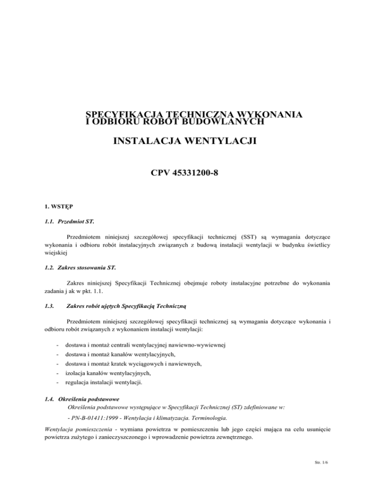 SPECYFIKACJA TECHNICZNA WYKONANIA I ODBIORU ROBÓT BUDOWLANYCH INSTALACJA WENTYLACJI CPV 45331200-8 1. WSTĘP 1.1. Przedmiot ST. Przedmiotem niniejszej szczegółowej specyfikacji technicznej (SST) są wymagania dotyczące wykonania i odbioru robót instalacyjnych związanych z budową instalacji wentylacji w budynku świetlicy wiejskiej 1.2. Zakres stosowania ST. Zakres niniejszej Specyfikacji Technicznej obejmuje roboty instalacyjne potrzebne do wykonania zadania j ak w pkt. 1.1. 1.3. Zakres robót ujętych Specyfikacją Techniczną Przedmiotem niniejszej szczegółowej specyfikacji technicznej są wymagania dotyczące wykonania i odbioru robót związanych z wykonaniem instalacji wentylacji: - dostawa i montaż centrali wentylacyjnej nawiewno-wywiewnej - dostawa i montaż kanałów wentylacyjnych, - dostawa i montaż kratek wyciągowych i nawiewnych, - izolacja kanałów wentylacyjnych, - regulacja instalacji wentylacji. 1.4. Określenia podstawowe Określenia podstawowe występujące w Specyfikacji Technicznej (ST) zdefiniowane w: - PN-B-01411:1999 - Wentylacja i klimatyzacja. Terminologia. Wentylacja pomieszczenia - wymiana powietrza w pomieszczeniu lub jego części mająca na celu usunięcie powietrza zużytego i zanieczyszczonego i wprowadzenie powietrza zewnętrznego. Str. 1/6 Rozprowadzenia powietrza - przeniesienie strumienia powietrza określonej objętości do wentylowanej przestrzeni lub z tej przestrzeni na ogół z zastosowaniem przewodów. Rozdział powietrza w pomieszczeniu - rozprowadzenie powietrza w wentylowanej przestrzeni z zastosowaniem nawiewników i wywiewników w celu zagwarantowania wymaganych warunków - intensywności wymiany powietrza, ciśnienia, czystości, temperatury, wilgotności względnej, prędkości ruchu powietrza, poziomu hałasu w strefie przebywania ludzi. Krotność wymiany powietrza - liczbowa wartość intensywności wentylacji pomieszczenia, liczba określająca ile razy w ciągu godziny przepływa przez pomieszczenie strumień powietrza o objętości równej objętości pomieszczenia. Powietrze zewnętrzne - powietrze atmosferyczne czerpane na zewnątrz obiektu. Powietrze wewnętrzne - powietrze znajdujące się wewnątrz pomieszczenia lub klimatyzowanej przestrzeni. Powietrze nawiewane - powietrze wprowadzane przez nawiewniki do pomieszczenia wentylowanego lub klimatyzowanego. Powietrze wywiewane - powietrze wewnętrzne odprowadzane z pomieszczenia wentylowanego lub klimatyzowanego. Powietrze wyrzutowe - całość lub część powietrza wywiewanego odprowadzana do atmosfery. Indukcja powietrza - zasysanie części powietrza wewnętrznego w wyniku ejekcyjnego działania strumienia powietrza pierwotnego. Cyrkulacja powietrza - naturalne lub wymuszone przemieszczanie powietrza w pomieszczeniu. Zanieczyszczenie powietrza - zawarta w powietrzu substancja stała, ciekła lub gazowa, która nie występuje w normalnym składzie powietrza atmosferycznego i która ma charakter szkodliwy. Wentylacja naturalna - wentylacja zachodząca na skutek działania naturalnych sił przyrody tj. sił wyporu termicznego lub/i siły naporu wiatru. Wentylacja grawitacyjna - wentylacja naturalna spowodowana przez różnicę gęstości powietrza na zewnątrz i wewnątrz pomieszczenia. Aeracja - wentylacja naturalna z dodatkowym wykorzystaniem elementów wspomagających i otworów o obliczonej i regulowanej powierzchni. Infiltracja powietrza - napływ powietrza do pomieszczenia przez otwory i nieszczelności w przegrodach. Eksfiltracja powietrza - wypływ powietrza z pomieszczenia przez otwory i nieszczelności w przegrodach. Wentylacja mechaniczna - wentylacja będąca wynikiem działania urządzeń mechanicznych lub strumienicowych, wprawiających powietrze w ruch. Wentylacja ogólna - wentylacja polegająca na wymianie powietrza w całym pomieszczeniu. Wentylacja miejscowa - wentylacja polegająca na wymianie powietrza w określonej przestrzeni w pomieszczeniu, w obrębie stanowiska pracy lub urządzenia technologicznego. Wentylacja nawiewna - wentylacja polegająca na doprowadzeniu powietrza do pomieszczenia. Wentylacja wywiewna - wentylacja polegająca na odprowadzeniu powietrza z pomieszczenia. Instalacja wentylacji - zestaw urządzeń, zespołów i elementów wentylacyjnych służących do uzdatniania i rozprowadzania powietrza. System wentylacji centralny - system wentylacji z centralnym uzdatnianiem powietrza, w którym strumienie objętości powietrza obliczone dla poszczególnych pomieszczeń są do nich doprowadzane o jednakowych Str. 2/6 parametrach, niezależnie od występujących w pomieszczeniach odmiennych bilansów ciepła, wilgotności i innych zanieczyszczeń powietrza. System wentylacji indywidualny - system wentylacji umożliwiający utrzymanie regulowanego lub regulowanych parametrów powietrza w pomieszczeniu dzięki zastosowaniu indywidualnego urządzenia wentylacyjnego zamontowanego w danym lub sąsiednim pomieszczeniu. Przewód wentylacyjny - element o zamkniętym obwodzie przekroju poprzecznego, stanowiący obudowę przestrzeni, przez która przepływa powietrze.. Nawiewnik - element lub zespół, przez który powietrze napływa do wentylowanej przestrzeni. Wywiewnik element lub zespół, przez który powietrze wypływa z wentylowanej przestrzeni. 1.5. Ogólne wymagania dotyczące robót. Ogólne wymagania dotyczące robót jak w pkt. 1.5 STWiORB – Wymagania ogólne. Wykonawca robót jest odpowiedzialny za jakość wykonania robót oraz za zgodność z dokumentacją projektową, szczegółową specyfikacja techniczną i poleceniami Inspektora nadzoru. 2. MATERIAŁY Wszystkie materiały użyte przy montażu instalacji wentylacji winny spełniać wymagania ogólne zawarte w STWiORB – Wymagania ogólne pkt. 2. Instalacja wentylacji mechanicznej (nawiewna i wywiewna) została zaprojektowana w oparciu o centralę wentylacyjną nawiewno-wywiewną, kanały wentylacyjne i kratki wentylacyjne. Przewody wentylacyjne - prostokątne oraz kołowe t