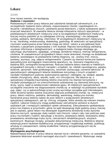 Lekarz 221101 Inna nazwa zawodu: nie występują Zadania i czynności Podstawowym celem pracy lekarza jest udzielanie świadczeń zdrowotnych, a w szczególności badanie stanu zdrowia, rozpoznawanie chorób i zapobieganie im, leczenie i rehabilitacja chorych, udzielanie porad lekarskich, z także wydawanie opinii i orzeczeń lekarskich. W zawodzie lekarza istnieje kilkanaście różnych specjalności – w podstawowych dziedzinach medycyny oraz w szczegółowych dziedzinach medycyny. Inaczej można podzielić je na zabiegowe (chirurg, anestezjolog) i nie zabiegowe (urolog, pediatra, dermatolog, internista). W szczegółowych dziedzinach medycyny są to np.: kardiolog, endokrynolog, diabetolog, gastrolog. W zależności od specjalizacji czynności wykonywane przez lekarza mogą się różnić. Lekarz w początkowej fazie kontaktu z pacjentem przeprowadza z nim wywiad. Poprzez komunikację werbalną uzyskuje informacje o dolegliwościach, a następnie bada chorego dotykając go, osłuchując słuchawkami, oglądając, uciskając określone miejsca, mierząc temperaturę, ciśnienie. W uzasadnionych przypadkach lekarz może skierować chorego na dodatkowe badania, pozwalające na postawienie trafnej diagnozy, np.: analizy krwi, moczu, posiewy, wymazy, usg, zdjęcia rentgenowskie. Czasami są również konieczne badania specjalistyczne wymagające nowoczesnej aparatury, np. rezonans magnetyczny, badania EEG, tomografia komputerowa. Podczas badania lekarz również w niektórych przypadkach korzysta z różnych narzędzi i urządzeń, np. młotek neurologiczny, pęseta, wziernik, spirometr, fotel ginekologiczny, tonometr (oznaczając ciśnienie tętnicze). W specjalizacjach zabiegowych lekarze dodatkowo korzystają z innych urządzeń i narzędzi niezbędnych podczas wykonywania operacji i zabiegów, np. skalpel, pęseta, młotek chirurgiczny, dłuto, wiertło, ssaki, nici chirurgiczne. Dla lekarza np. o specjalizacji ortopeda-traumatolog istotne znaczenie ma również korzystanie z narzędzi pozwalających na unieruchomienie uszkodzonej czy złamanej kończyny, np. druty, szyny, bądź w ostateczności założenie gipsu. W niektórych specjalnościach szczególne znaczenie ma diagnozowanie chorób,np. w radiologii na podstawie wyników usg, zdjęć, czy w patomorfologii przez ocenę wycinków narządów pod mikroskopem. Obok leczenia bardzo istotne znaczenie odgrywa profilaktyka chorób, np. medycyna pracy, lekarz rodzinny, pediatra, dermatolog, wenerolog, medycyna morska. Generalnie praca lekarza należy do prac lekkich z wyłączeniem określonych specjalizacji zabiegowych, jak np. chirurg, ortopeda, które określa się mianem średnio ciężkich. Lekarze medycyny mogą podejmować zatrudnienie zarówno w dużych szpitalach jak i mniejszych zakładach opieki zdrowotnej. Zdecydowanie spokojniejsza praca ma miejsce w przychodni, gdzie na ogół obowiązują stale godziny pracy. Inaczej jest w szpitalu, gdzie lekarz ma obowiązek wypełnienia określonej liczby dyżurów dzienno-nocnych, sprawując stały nadzór nad chorymi. Lekarz cały czas podczas swej pracy ma kontakt z ludźmi, decydując o leczeniu, podawaniu leków, stosowaniu diety, prowadzeniu określonego trybu życia, ćwiczeniach rehabilitacyjnych, wizytach kontrolnych. Wypisuje recepty, prowadzi dokumentację medyczną. Niektórzy lekarze wykonują prace naukowo-dydaktyczną: przygotowują i wygłaszają wykłady, publikują artykuły w czasopismach, szkolą studentów i lekarzy przygotowujących się do specjalizacji. Wymagania psychologiczne Najważniejszą wartość w pracy lekarza stanowi życie i zdrowie pacjenta, co uzasadnia stawianie lekarzowi wysokich wymagań etycznych i zawodowych. Wykonując swoje obowiązki, ma dostęp do największych tajemnic swoich pacjentów – powinien być dyskretny, obowiązuje go tajemnica lekarska wynikająca z kodeksu etyki lekarskiej. Lekarz powinien lubić ludzi i umieć z nimi rozmawiać, posiadać umiejętność dostrzegania i wczuwania się w problemy innych ludzi, umieć łatwo nawiązywać kontakt zarówno z dziećmi, jak i ze starszymi oraz pragnąć przynieść chorym ulgę w cierpieniu, nawet jeżeli nie może przywrócić zdrowia. Nauka i wiedza medyczna są podstawowym narzędziem pracy lekarza. Wiedza z zakresu biologii, fizyki, chemii, psychologii jest bardzo potrzebna, ale zawód ten wymaga także zaangażowania emocjonalnego. Chorzy oczekują czasem bardziej, współczucia, "dobrego słowa", niż przepisania właściwych tabletek. Lekarz powinien być sumienny, dokładny i spostrzegawczy, aby nie przeoczyć nawet drobnych objawów chorobowych. Musi umieć myśleć i wyciągać wnioski, kojarzyć fakty, określać związki przyczyno-skutkowe co pozwoli mu postawić dokładne rozpoznanie i zlecić właściwe leczenie. Powinien mieć dobrą pamięć ze względu na konieczność przyswojenia obszernej wiedzy fachowej (nazwy anatomiczne po polsku i po łacinie, nazwy chorób, leków). Dobra pamięć jest także bardzo przydatna nie tylko w uczeniu się, ale i w zapamiętywaniu historii chorób pacjentów. Pracując w zmieniających się warunkach i sytuacjach, powinien umieć się do nich dostosować i nie zważając na drobiazgi, zajmować się sprawami zasadniczymi. Bardzo ważna jest również u lekarza odporność emocjonalna czyli opanowanie w sytuacjach trudnych (np. chirurg, lekarz pogotowia) i zdolność do efektywnych działań mimo wynikających jakichkolwiek trudności. Dobrze, aby potrafił organizować pracę sobie i innym, potrafił podporządkować się szefom (ordynatorowi, kierownikowi przychodni) i równocześnie umiał pełnić rolę przełożonego niższego personelu - pielęgniarek, salowych, rejestratorek. Praca lekarza w niektórych specjalnościach ma charakter pracy zespołowej (np. chirurg), dlatego ważna jest umiejętność pracy w grupie, wzajemne zaufanie, dobre stosunki interpersonalne (współdziałanie na sali operacyjnej). Do sukcesów w prac
