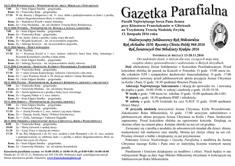 14.11.2016 PONIEDZIAŁEK – WSPOMNIENIE ŚW. MĘCZ. MIKOŁAJA I TOWARZYSZY 7:00 Za + brata Edgara Smolka – gregorianka. Konc. Za + Franciszka Rataj – gregorianka. 17:30 W int. Bożeny i Zbigniewa z ok. 31. rocz. ślubu z podziękowaniem za łaski i z prośbą o dalsze błogosławieństwo Boże w rodzinie. Konc. Za + Stanisława Więzik i mamę Antoninę. Konc. Za + Ewę Michalską – int. od członków Trzeciej Róży Różańcowej. 15.11.2016 WTOREK – WSPOMNIENIE ŚW. DYDAKA Z ALKALI, ZAKONNIKA 7:00 Za + brata Edgara Smolka – gregorianka. Konc. Za + Franciszka Rataj – gregorianka. 17:30 W int. Jacka i Edyty z prośbą o łaskę wiary dla nich. Konc. Za + Brygidę Kamczyk – int. od uczestników pogrzebu. Konc. Za + Jadwigę Seweryn – int. od uczestników pogrzebu. 16.11.2016 ŚRODA – DZIEŃ POWSZEDNI 7:00 W int. Parafian. 17:30 Za ++ Krystynę Kozieł w 1. rocz. śmierci, rodziców, braci Jana, Julię, Antoniego i Ryszarda Konarskich z prośbą o łaskę nieba. Konc. Za + brata Edgara Smolka – gregorianka. Konc. Za + Jadwigę Seweryn – int. od pracowników służby zdrowia. 17.11.2016 CZWARTEK – ŚWIĘTO ŚW. ELŻBIETY WĘGIERSKIEJ, PATRONKI FZŚ 7:00 Za + Franciszka Rataj – gregorianka. 17:30 Za ++ męża Zenona Kujawskiego, rodziców i krewnych z obu stron. Konc. Za ++ ojca Wacława Stosik w 30. dzień po śmierci i mamę Bernadetę. Konc. Za + brata Edgara Smolka – gregorianka. 18.11.2016 PIĄTEK – WSPOMNIENIE BŁ. KAROLINY KÓZKÓWNY, DZIEWICY I MĘCZENNICY 7:00 Za + Franciszka Rataj – gregorianka. Konc. Za + Genowefę Olsińską – int. od rodziny Straszak. 17:30 Za + Józefa Ignatowicza z prośbą o łaskę życia wiecznego. Konc. Za + Eugenię Pulnar w 3. rocz. śmierci. Konc. Za + brata Edgara Smolka – gregorianka. 19.11.2016 SOBOTA – WSPOMNIENIE BŁ. SALOMEI, DZIEWICY 7:00 Za + brata Edgara Smolka – gregorianka. Konc. Za + Franciszka Rataj – gregorianka. 17:30 Za ++ Józefę Piwoda w 2. rocz. śmierci i jej męża Juliana. Konc. Za ++ Danutę, Józefa, Marię i Wiktora Szwabowicz. Konc. Za ++ Zofię, Antoniego i Tadeusza Giejgałło. 20.11.2016 NIEDZIELA UROCZYSTOŚĆ JEZUSA CHRYSTUSA, KRÓLA WSZECHŚWIATA 8:00 Za + Franciszka Rataj – gregorianka. 10:00 Za + Marię Gaworek o spokój duszy. 11:30 Za + Łucję Tracz w miesiąc po śmierci. 17:30 W int. Rity Mularczyk z ok. 82. rocz. urodzin i córki Bernadety z ok. 41. rocz. urodzin z podziękowaniem za odebrane łaski i z prośbą o dalsze błogosławieństwo Boże na dalsze lata życia (Te Deum). Konc. Za + brata Edgara Smolka – gregorianka. Konc. Za + Genowefę Olsińską – int. od rodziny Kamińskich. Kancelaria parafialna czynna: wt 16:00-18:00, śr 18:00-19:30, pt 8:00-9:00 i 16:00-18:00 Parafia tel. 32 333 21 21, Proboszcz tel. 693 236 691, Proboszcz mail: [email protected] Strona internetowa parafii i klasztoru: www.franciszkaniegliwice.pl Parafii Najświętszego Serca Pana Jezusa przy Klasztorze Franciszkanów w Gliwicach na Trzydziestą Trzecią Niedzielę Zwykłą 13. listopada 2016 roku Nadzwyczajny Jubileuszowy Rok Miłosierdzia Rok obchodów 1050. Rocznicy Chrztu Polski 966-2016 Rok Światowych Dni Młodzieży Kraków 2016 INFORMACJE BIEŻĄCE 13-20.11.2016 Oto nadchodzi dzień, w którym dla was, czczących moje imię, wzejdzie słońce sprawiedliwości i uzdrowienie w Bożych skrzydłach. Dziś obchodzimy Dzień Solidarności z Kościołem Prześladowanym. Przed kościołem zbiórka do puszek na Kościół w Potrzebie. O godz. 15:00 msza św. dla członków FZŚ i sympatyków duchowości franciszkańskiej. O godz. 17:00 nabożeństwo nowenny przed jubileuszowym aktem przyjęcia Jezusa Chrystusa za Króla i Pana. O godz. 18:30 spotkanie Bractwa Pisma św. Adoracja Najświętszego Sakramentu z okazją do spowiedzi św. i nowenną do piątku o godz. 18:00-19:00, w sobotę i niedzielę o godz. 18:30-19:30. W środę o godz. 7:00 msza św. szkolna. O godz. 16:00 spotkania dla LSO. W piątek o godz. 18:30 spotkanie RMF i młodzieży. W sobotę o godz. 6:30 Godzinki ku czci N.M.P. O godz. 10:00 spotkanie Dzieci Maryi. W przyszłą niedzielę uroczystość Jezusa Chrystusa, Króla Wszechświata. Zakończenie Roku Miłosierdzia. O godz. 17:00 uroczyste nabożeństwo z jubileuszowym aktem przyjęcia Jezusa Chrystusa za Króla i Pana. Serdecznie zapraszamy. Przed kościołem zbiórka na ogrzewanie kościoła. Dziękuję za złożone ofiary na remont placu. Kolejne zbiórki na ten cel od grudnia. Zwracamy się z prośbą o produkty do adwentowych śniadań dla dzieci: dżemy truskawkowe lub malinowe oraz nutellę. Można też złożyć ofiarę na ten cel. Prosimy również o kubki i dziękujemy za już przyniesione. Polecamy Gościa Niedzielnego i Gazetkę Parafialną z modlitwą do Jezusa Chrystusa naszego Króla i Pana oraz ze statystyką liczenia wiernych naszej parafii. Parafianom i Gościom dziękujemy za modlitwy i ofiary. Niech będzie w nas wdzięczność Bogu za dary Jego Miłości Miłosiernej otrzymane w kończącym się Jubileuszowym Roku Miłosierdzia. Żegnamy parafian: Jadwiga Seweryn (1935), Michał Ptaczek (1947). Wieczny odpoczynek racz im dać Panie. A światłość wiekuista niechaj im świeci. Niech odpoczywają w pokoju wiecznym. Amen. JUBILEUSZOWY AKT PRZYJĘCIA JEZUSA CHRYSTUSA ZA KRÓLA I PANA Przyjęcie panowania Jezusa, uznanie Go swym Panem, ma znaczenie zbawcze. Jest pragnieniem serc Polaków rozumiejących, że od największych zagrożeń doczesnych nieskończenie groźniejsza jest utrata zbawienia. Współcześnie zagraża ona coraz większej liczbie ludzi na skutek odrzucenia prawdy – na skutek odrzucenia Chrystusa, który jest Prawdą i na skutek odrzucenia Jego prawa miłości. Stąd pragnienie, aby powszechnej w świecie detronizacji Chrystusa Polska przeciwstawiła Jego intronizację. Przyjęcie panowania Jezusa Chrystusa ma być z założenia aktem wiary narodu. Celem tego aktu nie jest zapewnienie doczesnej władzy czy dostatku, ale poddanie