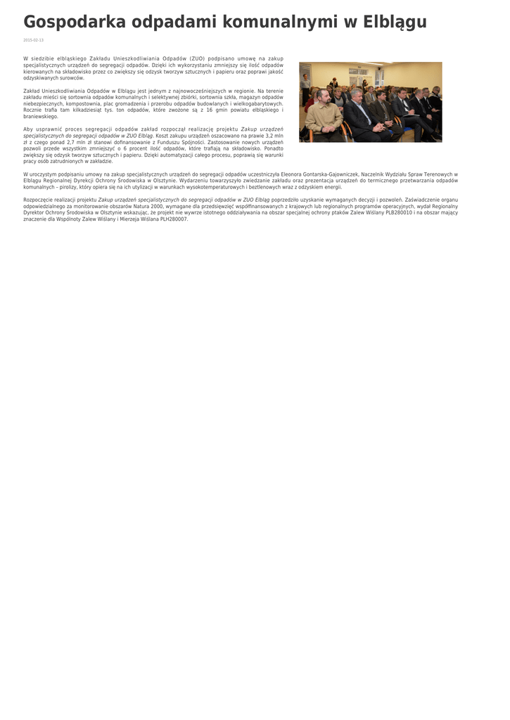 Gospodarka odpadami komunalnymi w Elblągu 2015-02-13 W siedzibie elbląskiego Zakładu Unieszkodliwiania Odpadów (ZUO) podpisano umowę na zakup specjalistycznych urządzeń do segregacji odpadów. Dzięki ich wykorzystaniu zmniejszy się ilość odpadów kierowanych na składowisko przez co zwiększy się odzysk tworzyw sztucznych i papieru oraz poprawi jakość odzyskiwanych surowców. Zakład Unieszkodliwiania Odpadów w Elblągu jest jednym z najnowocześniejszych w regionie. Na terenie zakładu mieści się sortownia odpadów komunalnych i selektywnej zbiórki, sortownia szkła, magazyn odpadów niebezpiecznych, kompostownia, plac gromadzenia i przerobu odpadów budowlanych i wielkogabarytowych. Rocznie trafia tam kilkadziesiąt tys. ton odpadów, które zwożone są z 16 gmin powiatu elbląskiego i braniewskiego. Aby usprawnić proces segregacji odpadów zakład rozpoczął realizację projektu Zakup urządzeń specjalistycznych do segregacji odpadów w ZUO Elbląg. Koszt zakupu urządzeń oszacowano na prawie 3,2 mln zł z czego ponad 2,7 mln zł stanowi dofinansowanie z Funduszu Spójności. Zastosowanie nowych urządzeń pozwoli przede wszystkim zmniejszyć o 6 procent ilość odpadów, które trafiają na składowisko. Ponadto zwiększy się odzysk tworzyw sztucznych i papieru. Dzięki automatyzacji całego procesu, poprawią się warunki pracy osób zatrudnionych w zakładzie. W uroczystym podpisaniu umowy na zakup specjalistycznych urządzeń do segregacji odpadów uczestniczyła Eleonora Gontarska-Gajowniczek, Naczelnik Wydziału Spraw Terenowych w Elblągu Regionalnej Dyrekcji Ochrony Środowiska w Olsztynie. Wydarzeniu towarzyszyło zwiedzanie zakładu oraz prezentacja urządzeń do termicznego przetwarzania odpadów komunalnych – pirolizy, który opiera się na ich utylizacji w warunkach wysokotemperaturowych i beztlenowych wraz z odzyskiem energii. Rozpoczęcie realizacji projektu Zakup urządzeń specjalistycznych do segregacji odpadów w ZUO Elbląg poprzedziło uzyskanie wymaganych decyzji i pozwoleń. Zaświadczenie organu odpowiedzialnego za monitorowanie obszarów Natura 2000, wymagane dla przedsięwzięć współfinansowanych z krajowych lub regionalnych programów operacyjnych, wydał Regionalny Dyrektor Ochrony Środowiska w Olsztynie wskazując, że projekt nie wywrze istotnego oddziaływania na obszar specjalnej ochrony ptaków Zalew Wiślany PLB280010 i na obszar mający znaczenie dla Wspólnoty Zalew Wiślany i Mierzeja Wiślana PLH280007.