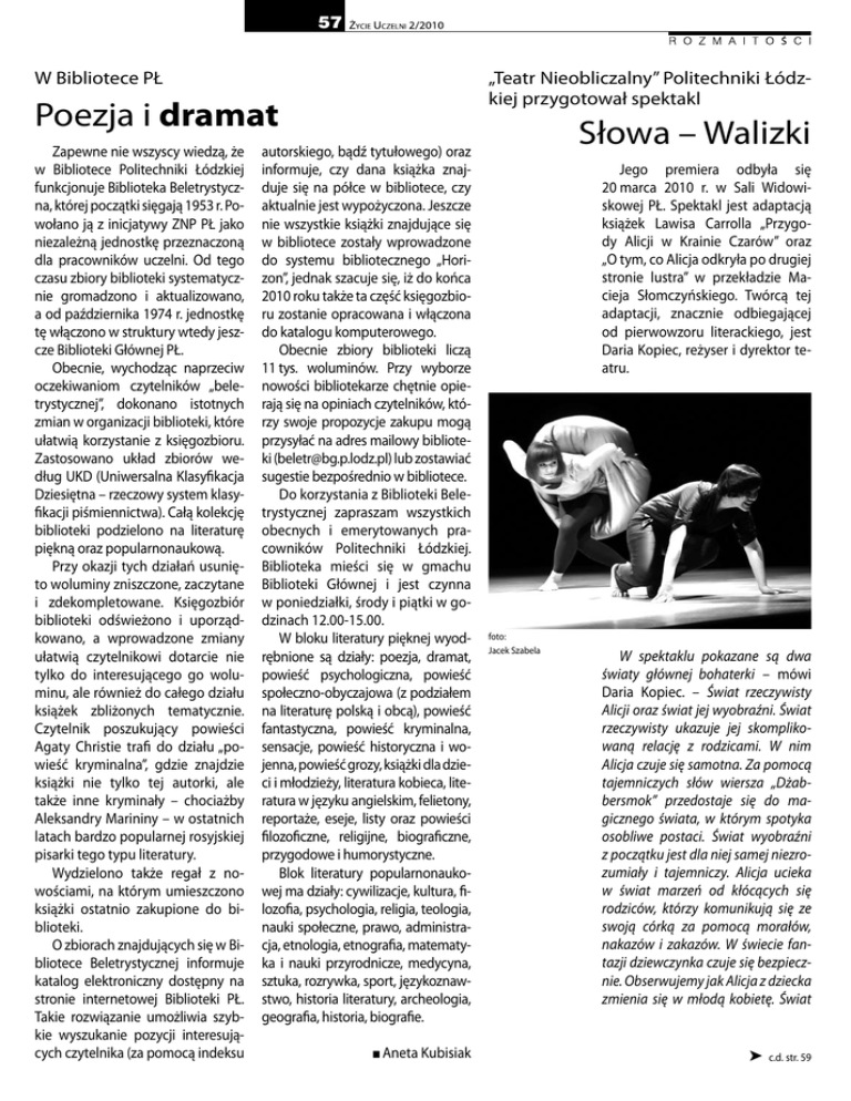 57 W Bibliotece PŁ „Teatr Nieobliczalny” Politechniki Łódzkiej przygotował spektakl Poezja i dramat Zapewne nie wszyscy wiedzą, że w Bibliotece Politechniki Łódzkiej funkcjonuje Biblioteka Beletrystyczna, której początki sięgają 1953 r. Powołano ją z inicjatywy ZNP PŁ jako niezależną jednostkę przeznaczoną dla pracowników uczelni. Od tego czasu zbiory biblioteki systematycznie gromadzono i aktualizowano, a od października 1974 r. jednostkę tę włączono w struktury wtedy jeszcze Biblioteki Głównej PŁ. Obecnie, wychodząc naprzeciw oczekiwaniom czytelników „beletrystycznej”, dokonano istotnych zmian w organizacji biblioteki, które ułatwią korzystanie z księgozbioru. Zastosowano układ zbiorów według UKD (Uniwersalna Klasyfikacja Dziesiętna – rzeczowy system klasyfikacji piśmiennictwa). Całą kolekcję biblioteki podzielono na literaturę piękną oraz popularnonaukową. Przy okazji tych działań usunięto woluminy zniszczone, zaczytane i zdekompletowane. Księgozbiór biblioteki odświeżono i uporządkowano, a wprowadzone zmiany ułatwią czytelnikowi dotarcie nie tylko do interesującego go woluminu, ale również do całego działu książek zbliżonych tematycznie. Czytelnik poszukujący powieści Agaty Christie trafi do działu „powieść kryminalna”, gdzie znajdzie książki nie tylko tej autorki, ale także inne kryminały – chociażby Aleksandry Marininy – w ostatnich latach bardzo popularnej rosyjskiej pisarki tego typu literatury. Wydzielono także regał z nowościami, na którym umieszczono książki ostatnio zakupione do biblioteki. O zbiorach znajdujących się w Bibliotece Beletrystycznej informuje katalog elektroniczny dostępny na stronie internetowej Biblioteki PŁ. Takie rozwiązanie umożliwia szybkie wyszukanie pozycji interesujących czytelnika (za pomocą indeksu autorskiego, bądź tytułowego) oraz informuje, czy dana książka znajduje się na półce w bibliotece, czy aktualnie jest wypożyczona. Jeszcze nie wszystkie książki znajdujące się w bibliotece zostały wprowadzone do systemu bibliotecznego „Horizon”, jednak szacuje się, iż do końca 2010 roku także ta część księgozbioru zostanie opracowana i włączona do katalogu komputerowego. Obecnie zbiory biblioteki liczą 11 tys. woluminów. Przy wyborze nowości bibliotekarze chętnie opierają się na opiniach czytelników, którzy swoje propozycje zakupu mogą przysyłać na adres mailowy biblioteki ([email protected]) lub zostawiać sugestie bezpośrednio w bibliotece. Do korzystania z Biblioteki Beletrystycznej zapraszam wszystkich obecnych i emerytowanych pracowników Politechniki Łódzkiej. Biblioteka mieści się w gmachu Biblioteki Głównej i jest czynna w poniedziałki, środy i piątki w godzinach 12.00-15.00. W bloku literatury pięknej wyodrębnione są działy: poezja, dramat, powieść psychologiczna, powieść społeczno-obyczajowa (z podziałem na literaturę polską i obcą), powieść fantastyczna, powieść kryminalna, sensacje, powieść historyczna i wojenna, powieść grozy, książki dla dzieci i młodzieży, literatura kobieca, literatura w języku angielskim, felietony, reportaże, eseje, listy oraz powieści filozoficzne, religijne, biograficzne, przygodowe i humorystyczne. Blok literatury popularnonaukowej ma działy: cywilizacje, kultura, filozofia, psychologia, religia, teologia, nauki społeczne, prawo, administracja, etnologia, etnografia, matematyka i nauki przyrodnicze, medycyna, sztuka, rozrywka, sport, językoznawstwo, historia literatury, archeologia, geografia, historia, biografie. n Aneta Kubisiak Słowa – Walizki Jego premiera odbyła się 20 marca 2010 r. w Sali Widowiskowej PŁ. Spektakl jest adaptacją książek Lawisa Carrolla „Przygody Alicji w Krainie Czarów” oraz „O tym, co Alicja odkryła po drugiej stronie lustra” w przekładzie Macieja Słomczyńskiego. Twórcą tej adaptacji, znacznie odbiegającej od pierwowzoru literackiego, jest Daria Kopiec, reżyser i dyrektor teatru. foto: Jacek Szabela W spektaklu pokazane są dwa światy głównej bohaterki – mówi Daria Kopiec. – Świat rzeczywisty Alicji oraz świat jej wyobraźni. Świat rzeczywisty ukazuje jej skomplikowaną relację z rodzicami. W nim Alicja czuje się samotna. Za pomocą tajemniczych słów wiersza „Dżabbersmok” przedostaje się do magicznego świata, w którym spotyka osobliwe postaci. Świat wyobraźni z początku jest dla niej samej niezrozumiały i tajemniczy. Alicja ucieka w świat marzeń od kłócących się rodziców, którzy komunikują się ze swoją córką za pomocą morałów, nakazów i zakazów. W świecie fantazji dziewczynka czuje się bezpiecznie. Obserwujemy jak Alicja z dziecka zmienia się w młodą kobietę. Świat c.d. str. 59