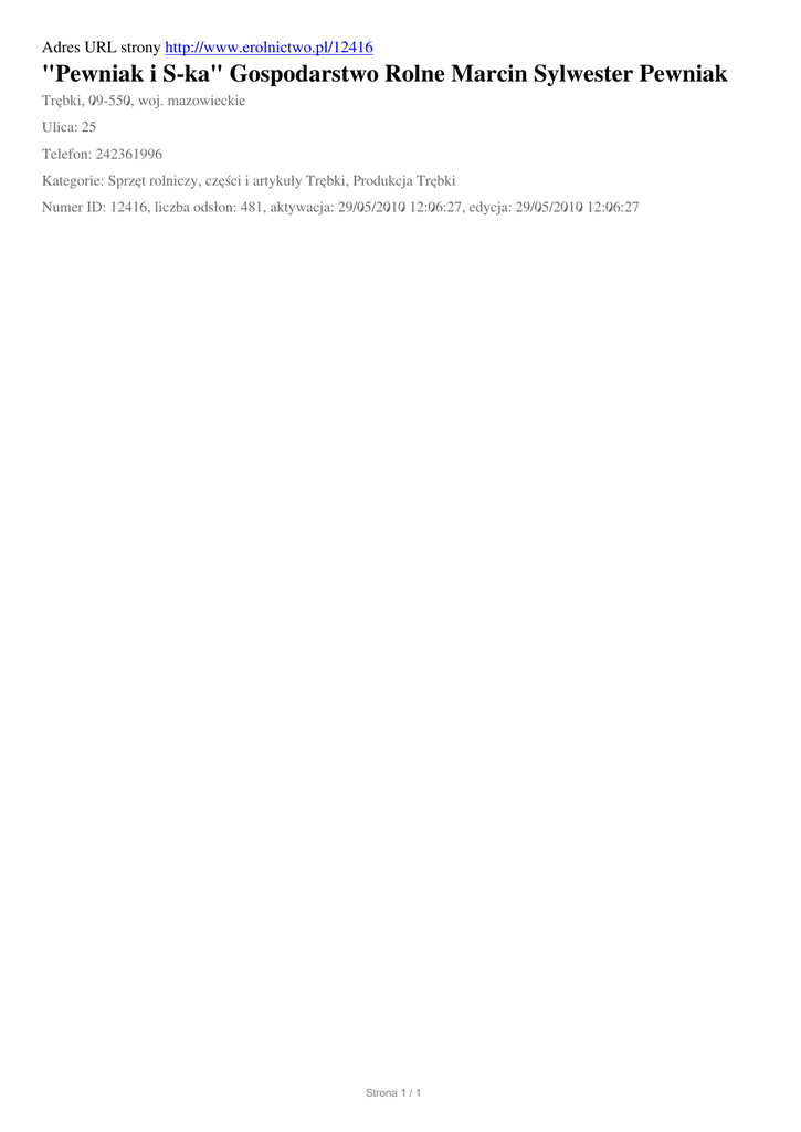 Adres URL strony http://www.erolnictwo.pl/12416 "Pewniak i S-ka" Gospodarstwo Rolne Marcin Sylwester Pewniak Trębki, 09-550, woj. mazowieckie Ulica: 25 Telefon: 242361996 Kategorie: Sprzęt rolniczy, części i artykuły Trębki, Produkcja Trębki Numer ID: 12416, liczba odsłon: 481, aktywacja: 29/05/2010 12:06:27, edycja: 29/05/2010 12:06:27 Strona 1 / 1