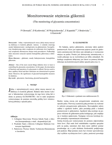 ● JOURNAL OF PUBLIC HEALTH, NURSING AND MEDICAL RESCUE ● No.3/2011 (7-9) ● ● JOURNAL OF PUBLIC HEALTH, NURSING AND MEDICAL RESCUE ● No.3/2011 ● 7 Monitorowanie stężenia glikemii (The monitoring of glycaemia concentration) P Głowacki1, D Kozłowska1, M Wojciechowska1, Z Kopański1,2, I Brukwicka 3 , A Kurowski1 Streszczenie - Jedną z najważniejszych rzeczy jakiej muszą nauczyć się diabetycy to kontrola glikemii. Autorzy w artykule omawiają zasady funkcjonowania i posługiwania się glukometrem. Szczegółowiej charakteryzują także urządzenia do pobierania krwi kapilarnej, oraz urządzenia alternatywne służące temu procederowi. Podkreślają także znaczenie oznaczeń stężenie hemoglobiny glikowanej u diabetyków. Słowa kluczowe - glukomet, zasady funkcjonowania, hemoglobina glikowana. II. GLUKOMETR Do badania, oprócz glukometru, używamy także pasków pomiarowych. Krew jest aspirowana poprzez pasek do glukometru automatycznie lub chory sam zakrapla ją w wyznaczone miejsce na pasku. Pomiar jest dokonywany automatycznie, a wynik pokazuje się na wyświetlaczu po kilku sekundach. Do każdego urządzenia dołączony jest lancet za pomocą którego dokonuje się kontrolowanych nakłuć opuszki palca (ryc.1). Abstract - One of the most crucial things diabetics have to learn is controlling the glycaemia concentration. In this paper, the description of functions and operation of a glucometer is offered. Devices used to draw capillary blood and their substitutes are characterised in greater detail. Moreover, the significance of glycated haemoglobin measures for diabetics. Key words - glucometer, functioning, glycated haemoglobin. I. WSTĘP edną z najważniejszych rzeczy jakiej muszą nauczyć się diabetycy to kontrola glikemii. Badanie takie można wykonać w laboratorium wykorzystując do tego krew żylną lub w domu za pomocą GLUKOMETRU. Jest to małe urządzenie wykorzystujące do pomiaru niewielką próbkę krwi włośniczkowej pobranej z opuszki palca. J Afiliacja: 1. Collegium Masoviense Wyższa Szkoła Nauk o Zdrowiu (korespondencja; e-mail: [email protected]). 2. Wydziału Nauk o Zdrowiu Collegium Medicum Uniwersytet Jagielloński. 3. Państwowa Wyższa Szkoła Techniczno-Ekonomiczna w Jarosławiu. Ryc.1 Glukometr z paskami oraz nakłuwaczem (5) Bardzo ważną rzeczą jest przygotowanie urządzenia oraz opuszki palca. Pierwszą czynnością jaką powinno się wykonać to należyte przygotowanie glukometru. Bezwzględnie należy zadbać o zgodność kodów, jakie posiadają paski z kodami pomiarowymi w glukometrze. Zgodność taką uzyskuje się poprzez włożenie do glukometru paska kodującego, jaki znajduje się w każdym opakowaniu. Następuje wówczas korelacja kodów pomiędzy wspomnianymi elementami. Istotną kwestią jest wykorzystanie do pomiaru odpowiedniej ilości krwi. Zbyt mała ilość niedokładnie wypełnia specjalne pole na pasku, natomiast zbyt duża może zakłócić pomiar przedostając się w pole działania fotokomórki podpływając pod paskiem. Błąd pomiaru może być również spowodowany zbyt szybkim wyciśnięciem krwi z palca, ponieważ powoduje 8 ● JOURNAL OF PUBLIC HEALTH, NURSING AND MEDICAL RESCUE ● No.3/2011 ● to rozcieńczenie krwi płynem surowiczym. W celu eliminacji tego błędu powinno się używać do nakłuć lancetu, który zapewnia dobraną głębokość nakłucia, a to wówczas gwarantuje możliwość uzyskania próbki krwi [1,2]. Istnieją przyrządy pomocnicze umożliwiające pobranie próbek krwi kapilarnej z innych, alternatywnych miejsc np. przedramienia, ramienia, kłębu kciuka, uda czy też łydki (ryc.2). Ryc. 3 Kartka z dzienniczka samokontroli [2] Ryc.2 Przyrząd alternatywny do pobierania krwi kapilarnej[3] Z uwagi na wrażliwą zawartość substancji enzymatycznych zawartych w paskach, nie powinny one być wystawiane na działanie wysokich i niskich temperatur. Niski poziom baterii, urządzenia wytwarzające w pobliżu silne pole magnetyczne oraz uszkodzenia mechaniczne glukometru mogą mieć również wpływ na wynik pomiaru [2,3]. Przed każdym pomiarem poziomu glukozy we krwi należy dokładnie umyć ręce, aby oczyścić powierzchnię nakłucia z cukru, na przykład z owoców. Powierzchnia skóry musi być dokładnie osuszona, aby woda znajdująca się na jej powierzchni nie powodowała rozcieńczenia kropli krwi. Nie należy do dezynfekcji używać preparatów zawierających spirytus salicylowy, który również wpływa na wynik pomiaru, tylko wodę destylowaną [4]. Wracając do obowiązku pomiaru glikemii należy pamiętać, że jest to podstawa bezpieczeństwa i jedyny sposób na bieżące kontrolowanie leczenia. Aby prowadzenie kontroli było bardziej dokładne i pozbawione luk w pomiarach, zaleca się prowadzenie zeszytu samokontroli (ryc. 3), w którym zamieszczamy informacje niezbędne do skutecznej oceny leczenia podczas okresowej wizyty u lekarza. Pomiary są dokonywane w ściśle określonych porach dnia i nocy: na czczo oraz 30 min. przed każdym posiłkiem, dwie godziny po posiłku, przed snem, a także w środku nocy około godziny 3.00. Zapisywane informacje w dzienniczku samokontroli powinny zawierać również informacje dotyczące występowania sytuacji stresowych, zaostrzonych infekcji organizmu. Opisana metoda kontroli stężenia glukozy jest ważna w danej chwili, aby dobrać dawkę insuliny, jaką należy wstrzyknąć. Zapisane wartości w dzienniczku samokontroli pozwalają na ocenę glikemii całodobowej. Jednak weryfikacja całego miesiąca byłaby bardzo żmudna i wymagała poświęcenia dużej ilości czasu, a przy kilkudziesięciu wynikach obarczona jest wystąpieniem dużego błędu. Metodą, która pozwala bezpiecznie określić czas trwania hiperglikemii w ostatnich dwóch miesiącach jest oznaczenie tzw. hemoglobiny glikowanej– HbA1C. HbA1c jest hemoglobiną z przyłączoną nieenzymatycznie, trwale cząsteczką glukozy do N-końcowych aminokwasów łańc