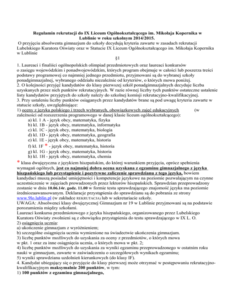 Regulamin rekrutacji do IX Liceum Ogólnokształcącego im. Mikołaja Kopernika w Lublinie w roku szkolnym 2014/2015. O przyjęciu absolwenta gimnazjum do szkoły decydują kryteria zawarte w zasadach rekrutacji Lubelskiego Kuratora Oświaty oraz w Statucie IX Liceum Ogólnokształcącego im. Mikołaja Kopernika w Lublinie §1 1. Laureaci i finaliści ogólnopolskich olimpiad przedmiotowych oraz laureaci konkursów o zasięgu wojewódzkim i ponadwojewódzkim, których program obejmuje w całości lub poszerza treści podstawy programowej co najmniej jednego przedmiotu, przyjmowani są do wybranej szkoły ponadgimnazjalnej, wybranego oddziału niezależnie od kryteriów, o których mowa poniżej. 2. O kolejności przyjęć kandydatów do klasy pierwszej szkół ponadgimnazjalnych decyduje liczba uzyskanych przez nich punktów rekrutacyjnych. W razie równej liczby tych punktów ostateczne ustalenie listy kandydatów przyjętych do szkoły należy do szkolnej komisji rekrutacyjno-kwalifikacyjnej. 3. Przy ustaleniu liczby punktów osiąganych przez kandydatów brane są pod uwagę kryteria zawarte w statucie szkoły, uwzględniające: 1) oceny z języka polskiego i trzech wybranych, obowiązkowych zajęć edukacyjnych (w zależności od rozszerzenia programowego w danej klasie liceum ogólnokształcącego): a) kl. 1 A - język obcy, matematyka, fizyka b) kl. 1B - język obcy, matematyka, informatyka c) kl. 1C - język obcy, matematyka, biologia d) kl. 1D - język obcy, matematyka, geografia e) kl. 1E - język obcy, matematyka, historia f) kl. 1F * - język obcy, matematyka, historia g) kl. 1G - język obcy, matematyka, historia h) kl. 1H - język obcy, matematyka, chemia * klasa dwujęzyczna z językiem hiszpańskim, do której warunkiem przyjęcia, oprócz spełnienia wymagań ogólnych, jest co najmniej dobra ocena uzyskana z egzaminu gimnazjalnego z języka hiszpańskiego lub przystąpienie i pozytywne zaliczenie sprawdzianu z tego języka, bowiem kandydaci muszą posiadać umiejętności i kompetencje językowe na poziomie pozwalającym na czynne uczestniczenie w zajęciach prowadzonych przez lektorów hiszpańskich. Sprawdzian przeprowadzony zostanie w dniu 10.06.14r. godz. 11.00 w formie testu sprawdzającego znajomość języka ma poziomie średniozaawansowanym. Deklaracje przystąpienia do sprawdzianu są do pobrania ze strony www.9lo.lublin.pl (w zakładce REKRUTACJA) lub w sekretariacie szkoły. UWAGA: Absolwenci klasy dwujęzycznej Gimnazjum nr 19 w Lublinie przyjmowani są na podstawie porozumienia między szkołami. Laureaci konkursu przedmiotowego z języka hiszpańskiego, organizowanego przez Lubelskiego Kuratora Oświaty zwolnieni są z obowiązku przystąpienia do testu sprawdzającego w IX L. O. 2) osiągnięcia ucznia: a) ukończenie gimnazjum z wyróżnieniem; b) szczególne osiągnięcia ucznia wymienione na świadectwie ukończenia gimnazjum. 3) liczbę punktów możliwych do uzyskania za oceny z przedmiotów, o których mowa w pkt. 1 oraz za inne osiągnięcia ucznia, o których mowa w pkt. 2; 4) liczbę punktów możliwych do uzyskania za wyniki egzaminu przeprowadzonego w ostatnim roku nauki w gimnazjum, zawarte w zaświadczeniu o szczegółowych wynikach egzaminu; 5) wyniki sprawdzianu uzdolnień kierunkowych (do klasy IF). 4. Kandydat ubiegający się o przyjęcie do klasy pierwszej może otrzymać w postępowaniu rekrutacyjnokwalifikacyjnym maksymalnie 200 punktów, w tym: 1) 100 punktów z egzaminu gimnazjalnego, przy czym wyniki egzaminu gimnazjalnego wyrażone w skali procentowej dla zadań z zakresu: a) z języka polskiego, b) z matematyki, c) z historii oraz wiedzy o społeczeństwie, d) z przedmiotów przyrodniczych: chemia, fizyka, biologia, geografia, e) z języka obcego (poziom podstawowy) będą mnożone przez 0,2 pkt. Przykład: uczeń uzyskał z egzaminu gimnazjalnego : język polski - 80%, matematyka - 65%, historia i wos - 59%, przedmioty przyrodnicze - 70%, język obcy (poziom podstawowy) - 96% po przeliczeniu według wzoru otrzymujemy: 80%*0,2+65%*0,2+59%*0,2+70%*0,2+96%*0,2=16+13+11,8+14+19,2=74 Liczba punktów rekrutacyjnych dla ucznia wynosi 74 pkt. Przykład : uczeń uzyskał z egzaminu gimnazjalnego : 2) 80 punktów za oceny z języka polskiego i trzech obowiązkowych zajęć edukacyjnych, otrzymane na świadectwie ukończenia gimnazjum, zgodnie z zasadą: a) 20 punktów – ocena „celujący”, b) 18 punktów - ocena „bardzo dobry”, c) 15 punktów - ocena „dobry”, d) 8 punktów - ocena „dostateczny”, e) 2 punkty - ocena „dopuszczający”, 3) 20 punktów za inne osiągnięcia ucznia wymienione na świadectwie ukończenia gimnazjum, zgodnie z zasadami: a) 4 punkty za ukończenie gimnazjum z wyróżnieniem, b) maksymalnie 10 punktów za uzyskanie tytułu finalisty w konkursach o zasięgu co najmniej wojewódzkim (zgodnie z Zarządzeniem LKO): 1 konkurs – 4 pkt. 2 konkursy - 8pkt. 3 i więcej - 10 pkt. c) maksymalnie 4 punkty (1 osiągnięcie - 2pkt, 2 i więcej-4 pkt.) za jedno z poniżej wskazanych osiągnięć: - zajęcie od I do III miejsca w zawodach sportowych organizowanych co najmniej na szczeblu powiatowym, - zajęcie od I do III miejsca lub uzyskanie tytułu laureata w konkursach lub zawodach artystycznych organizowanych co najmniej na szczeblu powiatowym, - zajęcie od I do III miejsca lub uzyskanie tytułu laureata w konkursach lub zawodach wiedzy lub innych konkursach tematycznych organizowanych co najmniej na szczeblu powiatowym, d) 2 punkty za jedno z poniżej zapisanych na świadectwie ukończenia szkoły gimnazjalnej osiągnięć: - działalność na rzecz innych ludzi, zwłaszcza w formie wolontariatu - aktywna współpraca z domem dziecka, hospicjum, organizacjami charytatywnymi; lub - działalność na rzecz środowiska szkolnego, zwłaszcza w międzyszkolnych organach samorządów młodzieży, samorządzie szkolnym lub organizacjach młodzieżowych; lub - udział w projekcie /programie dydaktyczno-wychowaw