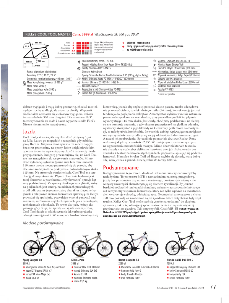 KELLYS COOL TOOL MASTER Cena: 3999 zł Współczynnik bB: 100 g za 30 zł* 605 mm Jazda 5 Budowa 4 Amortyzacja 5 Opłacalność 2,8 Ocena końcowa 4,6 73,5° Uwaga! Tekst jest integralną częścią testu. Wnioskowanie tylko na podstawie punktacji może prowadzić do błędów w interpretacji sztywna i mocna rama czuły i płynnie działający amortyzator z blokadą skoku za krótki wspornik siodła 68,8° 320 mm 423 mm 1120 mm Rama: aluminium triple butted Rozmiary: 17.5”, 19.5”, 21.5” Geometria: rozmiar testowany: 495 mm - 19,5” Masa kompletnego roweru: 13 010 g* Masa ramy: 2000 g Masa przedniego koła: 1990 g Masa tylnego koła: 2645 g Skok amortyzacji przód: 120 mm Przedni widelec: Rock Shox Recon Silver TK (2140 g) Piasty: Shimano HB/FH-M475 Obręcze: Kellys Draft Opony: Schwalbe Rocket Ron Performance 2.25 (585 g, dętka: 145 g) Korby: Shimano Acera FC-M361 42/32/22T (170 mm) Kaseta: Shimano CS-HG30 (11-32) 8-rz. Łańcuch: KMC Z7 Przerzutka przód: Shimano Altus FD-M311 Przerzutka tył: Shimano XT RD-M772 dobrze wyglądają i mają dobrą geometrię, chociaż mostek wydaje trochę za długi, ale o tym za chwilę. Wspornik siodła także odznacza się ciekawym wyglądem, szkoda że ma zaledwie 300 mm długości. Dla rozmiaru 19,5” to zdecydowanie za mało i nawet wygodne siodło Fi:zi’k Nisene nie zmieniło naszej oceny. Jazda Cool Tool jest niezwykle szybki i dość „sztywny”, jak na fulla. Łatwo go rozpędzić, szczególnie gdy zablokujemy Recona. Sztywna rama sprawia, że moc z napędu bez strat przenosimy na opony, które dzięki niewielkim oporom toczenia zapewniają szybkość i naprawdę niezłe przyspieszenie. Pod górę przekonujemy się, że Cool Tool nie jest narzędziem do wygrywania maratonów. Mimo dość wyłożonej sylwetki (górna rura 605 mm i mostek 110 mm) trzeba mocno przesuwać się do przodu, aby dociskać amortyzator o praktycznie potwierdzonym skoku 115 mm. Na stromych wzniesieniach, Cool Tool ma tendencję do myszkowania. Płynne obracanie korbami jest tutaj kluczowe, a powolnemu „młynkowaniu” sprzyja kąt rury podsiodłowej. Za sprawą płaskiego kąta główki, który na podjazdach jest zmorą, na odcinkach prowadzących w dół odkrywamy jego prawdziwy charakter. Łagodny kąt główki i relatywnie szeroka kierownica sprawiają, że Kellys prowadzi się spokojnie, pozwalając w pełni panować nad rowerem, zarówno na szybkich zjazdach, jak i na wolnych, technicznych odcinkach. To rower dla tych, którzy eksplorując góry czują, że zjazdy nie są ich mocną stroną, Cool Tool działa w takich sytuacja jak turbosprężarka odwagi i umiejętności. W zakrętach bardzo łatwo kręci się Manetki: Shimano Altus SL-M310 Klamki: Hayes Stroker Trail Hamulce: Hayes Stroker Trail (160 mm) Kierownica: Kellys Master riser (640 mm) Wspornik kierownicy: Kellys Expert (110 mm) Łożyska sterów: aheadset Wspornik siodełka: Kellys Expert (300 mm) Siodełko: Fi’zi:k Nisene Pedały: VP-349S * masa bez pedałów kierownicą, jednak aby szybciej pokonać ciasne pasaże, trzeba zdecydowanie pracować ciałem, to efekt dużego trailu (94 mm), konsekwencją jest też tendencja do pogłębiania zakrętów. Amortyzator wybiera wszelkie naturalne przeszkody spotkane na swej drodze, przy prawidłowym SAG-u płynnie wykorzystując 115 mm skoku. Jest czuły, choć przy pedałowaniu na siedząco nie pompuje znacznie, a gdy chcemy przyspieszyć na gładkim odcinku, wystarczy skorzystać z jego blokady na kierownicy. Jeśli mowa o amortyzacji, to należy uświadomić sobie, że wszelkie zabiegi wpływające na zwiększenie wytrzymałości ramy odbiły się na jej zdolnościach do tłumienia drgań. A raczej ich pozbawieniu. Sytuacji nie poprawiają drutowe Rocket Rony o słusznej skądinąd szerokości 2,25”. W mniejszym rozmiarze są często na wyposażeniu maratońskich maszyn. Mimo obaw niektórych testerów nie okazały się wcale zbyt delikatne i zarówno one, jak i koła, wyszły bez szwanku z testów na kamienistych zjazdach, poprawnie spisując się podczas hamowań. Hamulce Stroker Trail od Hayesa szybko się dotarły, mają dobrą siłę, nam jednak z przodu trochę zabrakło tarczy 180-tki. Podsumowanie Kategoryzowanie tego roweru do działu all mountain czy enduro byłoby nadużyciem. To po prostu MTB z nastawieniem na ostrą, przygodową, jazdę bez pulsometru czy numeru startowego, bowiem - jak wiemy - nie wszyscy rowerzyści charakteryzują się duchem rywalizacji. By jeszcze bardziej podkreślić ten luzacki charakter, zalecamy zastosowanie krótszego o 2 centymetry wspornika kierownicy, który nie tylko wpłynie na zwrotność, ale i wyprostuje sylwetkę, odciążając ręce. Geometria i amortyzator o skoku 120 mm pozwolą na zmierzenie się ze zjazdami, które dotychczas były zbyt trudne. Kellys Cool Tool może stać się „spoko narzędziem” do eksploracji okolicy, także tej oferującej spore nastromienia i czerpanie większej przyjemności ze zjazdów. Taki sztywny full. Cool full? Tekst: Wojciech Więcej zdjęć i pełne specyfikacje modeli porównywalnych Szlachta znajdziecie na www.bikeBoard.pl. Modele porównywalne Agang Gangsta 8.0 3999 zł amortyzator Recon SL Solo Air, oś 20 mm napęd 27 biegów SRAM x.7 korby FSA Moto Mega Exo masa 13,3 kg Powyższe cechy odróżniają modele porównywalne od testowanego KTM EL Paso 3699 zł Suntour XCM HLO, 100 mm napęd Shimano SLX 2x9 kaseta 11-34 hamulce Shimano M486 masa 13,9 kg Romet Mosquito 2.0 2599 zł Rock Shox Tora 289 U-Turn 85-130 mm hamulce Avid Juicy 3 korby Truvativ Ruktion dwa rozmiary ramy Merida MATTS Trail 800-D 4399 zł napęd 10-biegowy Shimano SLX korby Shimano M552-10 komponenty FSA cztery rozmiary ramy bi ke Boa r d #11 - 12 l i sto p a d - g r u d zi eń 2 010 77