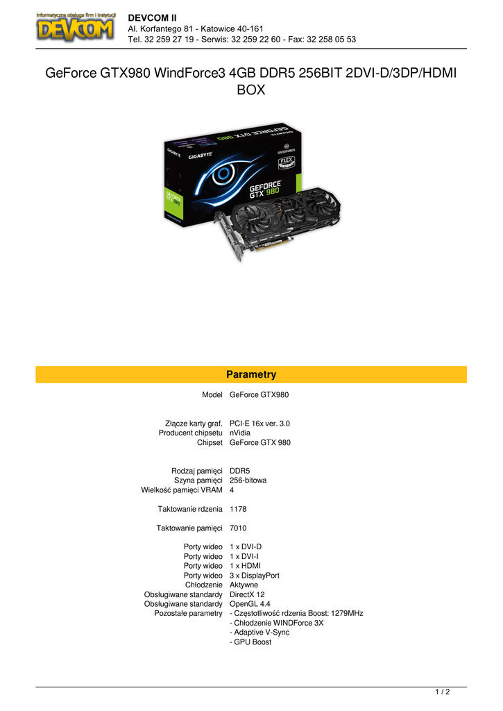 DEVCOM II Al. Korfantego 81 - Katowice 40-161 Tel. 32 259 27 19 - Serwis: 32 259 22 60 - Fax: 32 258 05 53 GeForce GTX980 WindForce3 4GB DDR5 256BIT 2DVI-D/3DP/HDMI BOX Parametry Model GeForce GTX980 Złącze karty graf. PCI-E 16x ver. 3.0 Producent chipsetu nVidia Chipset GeForce GTX 980 Rodzaj pamięci DDR5 Szyna pamięci 256-bitowa Wielkość pamięci VRAM 4 Taktowanie rdzenia 1178 Taktowanie pamięci 7010 Porty wideo Porty wideo Porty wideo Porty wideo Chłodzenie Obsługiwane standardy Obsługiwane standardy Pozostałe parametry 1 x DVI-D 1 x DVI-I 1 x HDMI 3 x DisplayPort Aktywne DirectX 12 OpenGL 4.4 - Częstotliwość rdzenia Boost: 1279MHz - Chłodzenie WINDForce 3X - Adaptive V-Sync - GPU Boost 1/2 DEVCOM II Al. Korfantego 81 - Katowice 40-161 Tel. 32 259 27 19 - Serwis: 32 259 22 60 - Fax: 32 258 05 53 - NVidia SLI - PhysX - Geforce 3D Vision Ready - Process Technology: 28nm - Max. obsługiwana rozdzielczość cyfrowa: 4096 x 2160 - Max. obsługiwana rozdzielczość analogowa: 2047 x 1536 - Multi-view: 4 - Wymagany PSU: 600W (2x 8-pin power) Wymiary 312 x 129 x 43 mm 2/2 Powered by TCPDF (www.tcpdf.org)