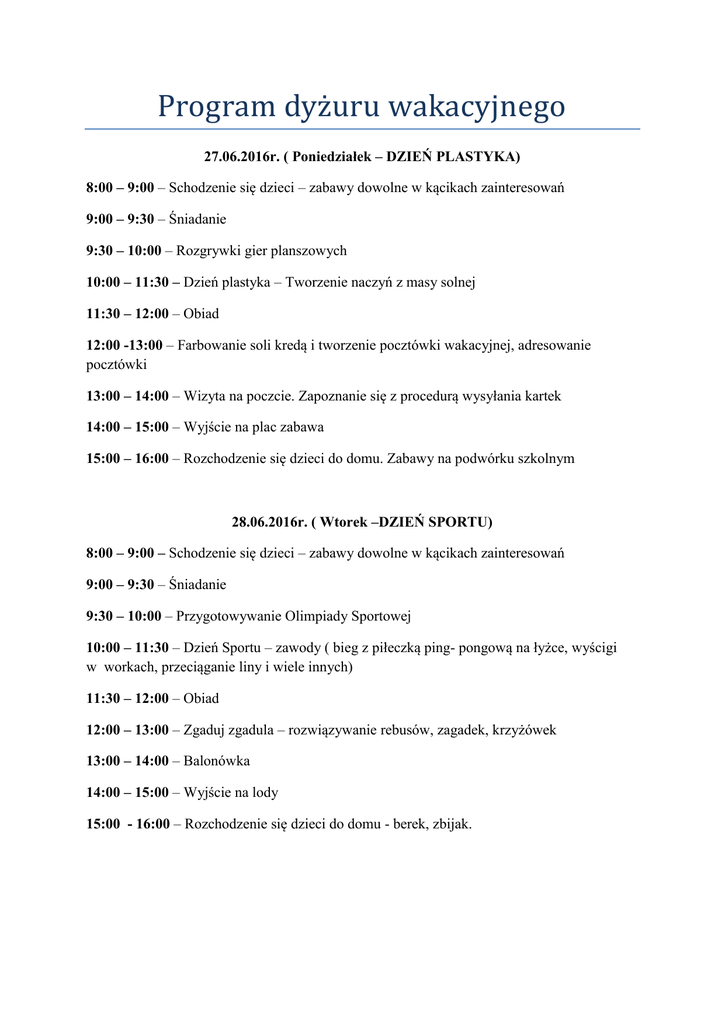 Program dyżuru wakacyjnego 27.06.2016r. ( Poniedziałek – DZIEŃ PLASTYKA) 8:00 – 9:00 – Schodzenie się dzieci – zabawy dowolne w kącikach zainteresowań 9:00 – 9:30 – Śniadanie 9:30 – 10:00 – Rozgrywki gier planszowych 10:00 – 11:30 – Dzień plastyka – Tworzenie naczyń z masy solnej 11:30 – 12:00 – Obiad 12:00 -13:00 – Farbowanie soli kredą i tworzenie pocztówki wakacyjnej, adresowanie pocztówki 13:00 – 14:00 – Wizyta na poczcie. Zapoznanie się z procedurą wysyłania kartek 14:00 – 15:00 – Wyjście na plac zabawa 15:00 – 16:00 – Rozchodzenie się dzieci do domu. Zabawy na podwórku szkolnym 28.06.2016r. ( Wtorek –DZIEŃ SPORTU) 8:00 – 9:00 – Schodzenie się dzieci – zabawy dowolne w kącikach zainteresowań 9:00 – 9:30 – Śniadanie 9:30 – 10:00 – Przygotowywanie Olimpiady Sportowej 10:00 – 11:30 – Dzień Sportu – zawody ( bieg z piłeczką ping- pongową na łyżce, wyścigi w workach, przeciąganie liny i wiele innych) 11:30 – 12:00 – Obiad 12:00 – 13:00 – Zgaduj zgadula – rozwiązywanie rebusów, zagadek, krzyżówek 13:00 – 14:00 – Balonówka 14:00 – 15:00 – Wyjście na lody 15:00 - 16:00 – Rozchodzenie się dzieci do domu - berek, zbijak. 29.06.2016r. ( Środa – DZIEŃ ODKRYWCY) 8:00 -9:00 – Schodzenie się dzieci – zabawy dowolne w kącikach zainteresowań 9:00 – 9:30– Śniadanie 9:30 – 10:00 – Przygotowywania do gry terenowej, ustalenie kapitana, wytłumaczenie zasad 10:00 –11:30 – Gra terenowa po Starym Sączu 11:30 – 12:00 – Obiad 12:00 – 13:00 – Odkrywanie tajemnic jakie skrywają puzzle edukacyjne 13:00 – 14:00 – Zabawa w podchody 14:00 – 15:00 – Wyjście na plac zabaw 15:00 – 16:00 – Rozchodzenie się dzieci- zabawy na świeżym powietrzu. 30.06.2016r. ( Czwartek – DZIEŃ KONSTRUKTORA) 8:00 – 9:00 – Schodzenie się dzieci – zabawy dowolne w kącikach zainteresowań 9:00 – 9:30 – Śniadanie 9:30 – 10:00 – Rysowanie projektu - sprzętu do zamykania w bańce 10:00 – 11:30- Tworzenie sprzętu do zamykania w bańce 11:30 – 12:00 – Obiad 12:00 – 13:00 – Pisanie listu i umieszczanie go w kolorowej butelce 13:00 – 14:00 – Testowanie stworzonej maszyny – zamykanie dzieci w bańce mydlanej 14:00 – 15:00 – Malowanie bańką 15:00 – 16:00 – Rozchodzenie się dzieci – zabawy na świeżym powietrzu 01.07.2016r. ( Piątek –DZIEŃ PODRÓŻNIKA) 8:00 – 9:00 – Schodzenie się dzieci – zabawy dowolne w kącikach zainteresowań 9:00 -9:30 – Śniadanie 9:30 – 11:30 – Podróżowanie po kontynentach i poznawanie tradycji i sposobów spędzania wakacji przez dzieci 11:30 – 12:00 – Obiad 12:00 – 14:00 – Spacer na Ołtarz Papieski, Źródełko Świętej Kingi 14:00 – 15:00 -Tworzenie plakatu ,,Wakacje na danym kontynencie w rozmiarze XXL” 15:00 – 16:00 – Rozchodzenie się dzieci do domu- zabawy na świeżym powietrzu 04.07.2016r. ( Poniedziałek – DZIEŃ MANUALNY) 8:00 – 9:00 – Schodzenie się dzieci – zabawy dowolne w kącikach zainteresowań 9:00 – 9:30 – Śniadanie 9:30 – 10:00 – Wybieranie wzoru do wyszywania 10:00 – 11:30 – Wyszywanie muliną na materialne wybranego wzoru 11:30 – 12:00 – Obiad 12:00 – 13:00 – Tworzenie ramki na wyszyty obraz, obstawianie obrazu w ramce 13:00 – 14:00 - Autoportret na wesoło 14:00 – 15:00 – Wyjście na orlika 15:00 – 16:00 – Rozchodzenie się dzieci. Zabawy na świeżym powietrzu 05.07.2016r. ( Wtorek – DZIEŃ JĘZYKOWY) 8:00 – 9:00 – Schodzenie się dzieci – zbiórka 9:00 – 9:30 – Śniadanie 9:30 – 11:30 – Zapoznanie dzieci z systemem języka migowego – ćwiczenia we wzajemnym porozumiewaniu się 11:30 – 12:00 – Obiad 12:00 – 14:00 – Poznanie podstawowych słów przydatnych do komunikacji we wakacje w innych językach 14:00 -15:00 – Wyjście na lody 15:00 – 16:00 – Rozchodzenie się dzieci – zabawy na świeżym powietrzu 06.07.2016r. ( Środa – DZIEŃ Z PIŁKĄ ) 8:00 – 9:00 – Schodzenie się dzieci – zabawy dowolne w kącikach zainteresowań 9:00 – 9:30 – Śniadanie 9:30 –11:30 – Rozgrywki piłki nożnej na orliku 11:30 – 12:00 – Obiad 12:00 –14:00 – Konstruowanie piłki z recyklingu 14:00 – 15:00 – Wyjście na spacer 15:00 – 16:00 – Rozchodzenie się dzieci – zabawy na świeżym powietrzu 07.07.2016r. ( Czwartek – DZIEŃ AKTORA) 8:00 – 9:00 – Schodzenie się dzieci – zabawy dowolne w kącikach zainteresowań 9:00 – 9:30 – Śniadanie 9:30 – 10:30 – Przejazd do Nowego Sącza autobusem MPK 10:30 – 12:00 – Warsztaty wakacyjne z aktorami w Teatrze Nowym w Nowym Sączu 12:00 – 13:00 – Powrót do szkoły 13:00 – 13:30 – Obiad 13:30 – 14:00 – Czytanie bajek kolegom 14:00 – 15:00 – Projektowanie okładki do przeczytanej bajki 15:00 – 16:00 – Rozchodzenie się dzieci 08.07.2016r. ( PIĄTEK – DZIEŃ ANIMACYJNY) 8:00 – 9:00 –Schodzenie się dzieci – zabawy dowolne w kącikach zainteresowań 9:00 – 9:30 – Śniadanie 9:30 – 11:30 – Warsztaty malowania twarzy sobie nawzajem, tworzenie masek gipsowych, odlewów dłoni, malowanie paznokci, tworzenie tatuaży 11:30 – 12:00 – Obiad 12:00 – 14:00 – Szycie własnej chusty animacyjnej ze skrawków materiału 14:00 – 15:00 – Gra zręcznościowa na świeżym powietrzu 15:00 – 16:00 – Rozchodzenie się dzieci – zabawy na świeżym powietrzu 11.07.2016r. (Poniedziałek - DZIEŃ ARTYSTY) 8:00 – 9:00 – Schodzenie się dzieci – zabawy dowolne w kącikach zainteresowań 9:00 - 9:30 – Śniadanie 9:30 - 11:30 – Wyjazd do kina do Nowego Sącza na seans filmowy 11:30 – 12:00 – Obiad 12:00 – 13:00 – Rozmowa na temat seansu i wybór najciekawszych scen 13:00 – 14:00 – Tworzenie własnego filmu 14:00 – 15:00 – Prezentowanie własnego filmu 15:00 – 16:00 – Rozchodzenie się dzieci zabawy na świeżym powietrzu 12.07.2016r. ( Wtorek – DZIEŃ K