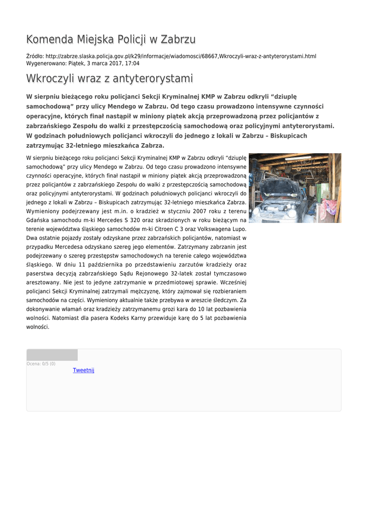 Komenda Miejska Policji w Zabrzu Źródło: http://zabrze.slaska.policja.gov.pl/k29/informacje/wiadomosci/68667,Wkroczyli-wraz-z-antyterorystami.html Wygenerowano: Piątek, 3 marca 2017, 17:04 Wkroczyli wraz z antyterorystami W sierpniu bieżącego roku policjanci Sekcji Kryminalnej KMP w Zabrzu odkryli “dziuplę samochodową” przy ulicy Mendego w Zabrzu. Od tego czasu prowadzono intensywne czynności operacyjne, których finał nastąpił w miniony piątek akcją przeprowadzoną przez policjantów z zabrzańskiego Zespołu do walki z przestępczością samochodową oraz policyjnymi antyterorystami. W godzinach południowych policjanci wkroczyli do jednego z lokali w Zabrzu – Biskupicach zatrzymując 32-letniego mieszkańca Zabrza. W sierpniu bieżącego roku policjanci Sekcji Kryminalnej KMP w Zabrzu odkryli “dziuplę samochodową” przy ulicy Mendego w Zabrzu. Od tego czasu prowadzono intensywne czynności operacyjne, których finał nastąpił w miniony piątek akcją przeprowadzoną przez policjantów z zabrzańskiego Zespołu do walki z przestępczością samochodową oraz policyjnymi antyterorystami. W godzinach południowych policjanci wkroczyli do jednego z lokali w Zabrzu – Biskupicach zatrzymując 32-letniego mieszkańca Zabrza. Wymieniony podejrzewany jest m.in. o kradzież w styczniu 2007 roku z terenu Gdańska samochodu m-ki Mercedes S 320 oraz skradzionych w roku bieżącym na terenie województwa śląskiego samochodów m-ki Citroen C 3 oraz Volkswagena Lupo. Dwa ostatnie pojazdy zostały odzyskane przez zabrzańskich policjantów, natomiast w przypadku Mercedesa odzyskano szereg jego elementów. Zatrzymany zabrzanin jest podejrzewany o szereg przestępstw samochodowych na terenie całego województwa śląskiego. W dniu 11 października po przedstawieniu zarzutów kradzieży oraz paserstwa decyzją zabrzańskiego Sądu Rejonowego 32-latek został tymczasowo aresztowany. Nie jest to jedyne zatrzymanie w przedmiotowej sprawie. Wcześniej policjanci Sekcji Kryminalnej zatrzymali mężczyznę, który zajmował się rozbieraniem samochodów na części. Wymieniony aktualnie także przebywa w areszcie śledczym. Za dokonywanie włamań oraz kradzieży zatrzymanemu grozi kara do 10 lat pozbawienia wolności. Natomiast dla pasera Kodeks Karny przewiduje karę do 5 lat pozbawienia wolności. Ocena: 0/5 (0) Tweetnij
