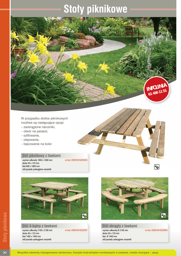 Osłony Stoły piknikowe ogrodowe NIA I L O F N I 11 51 6 61 43 W przypadku stołów piknikowych możliwe są następujące opcje: – zaokrąglone narożniki, – otwór na parasol, – szlifowanie, – olejowanie, – bejcowanie na kolor Stół piknikowy z ławkami Stoły piknikowe wymiar całkowity 1800 x 1600 mm deska 40 x 120 mm blat 800 x 1800 mm stół posiada zaokrąglone narożniki 30 nr kat. 05901874292933 Stół 4-kątny z ławkami wymiar całkowity 2100 x 2100 mm deska 40 x 120 mm blat 1400 x 1400 mm stół posiada zaokrąglone narożniki Stół okrągły z ławkami nr kat. 05901874292957 wymiar całkowity Ø 2100 mm deska 40 x 120 mm blat Ø 1400 mm stół posiada zaokrąglone narożniki nr kat. 05901874292964 Wszystkie elementy impregnowane ciśnieniowo. Komplet śrub/wkrętów montażowych w zestawie, metale mocujące – opcja Stoły piknikowe NIA INFOLI11 51 6 61 43 Stół Clipper wymiar całkowity 1800 x 1600 mm deska 40 x 120 mm, kantówka 90 x 90 mm blat 800 x 1800 mm Stół piknikowy z ławkami Stół myśliwski z zadaszeniem i ławkami nr kat. 05901874292919 Stół Piknikowy z ławkami Eco Wymiar całkowity 1600 x 1600 deska 30 x 115 blat 800 x 1600 nr kat. 05901874294289 Stół piknikowy z podnoszonymi ławkami wymiar całkowity 1800 x 1600 mm deska 40 x 120 mm blat 800 x 1800 mm wymiary: długość 2600, szerokość 1900/1600 mm wysokość 2500 mm nr kat. 05901874292995 deska 40 x 120 mm blat 800 x 2400 mm pokrycie dachowe w opcji (gont, papa) nr kat. 05901874292940 Stół piknikowy z oparciem wymiar całkowity 1800 x 1800 mm deska 40 x 120 mm blat 800 x 1800 mm nr kat. 05901874292988 Wykonujemy stoły na indywidualne zamówienie. Komplet śrub/wkrętów montażowych w zestawie, metale mocujące – opcja Stoły piknikowe wymiar całkowity 1800 x 1600 mm deska 40 x 120 mm blat 800 x 1800 mm nr kat. 05901874292971 31 Osłony Stoły piknikowe ogrodowe Stół dla dzieci Fabula Stoły piknikowe wymiar całkowity 550 x 900 mm deska modrzewiowa 30 x 90 mm blat 800 x 1800 mm 32 Stół piknikowy z ławkami Deluxe nr kat. 05901874294722 Stół kwadratowy z ławkami Deluxe wymiar całkowity 1400 x 1400 mm deska świerkowa 40 x 120 mm blat 1400 x 1400 mm stół posiada zaokrąglone narożniki nr kat. 05901874294739 wymiar całkowity 1500 x 1800 mm wymiar całkowity 1500 x 2400 mm deska świerkowa 40 x 90 mm blat 800 x 1800/2400 mm stół posiada zaokrąglone narożniki nr kat. 05901874294708 nr kat. 05901874294715 Stół okrągły z ławkami Deluxe wymiar całkowity Ø 1400 mm deska świerkowa 40 x 120 mm blat Ø 1400 mm stół posiada zaokrąglone narożniki nr kat. 05901874294746 Wszystkie elementy impregnowane ciśnieniowo. Komplet śrub/wkrętów montażowych w zestawie, metale mocujące – opcja