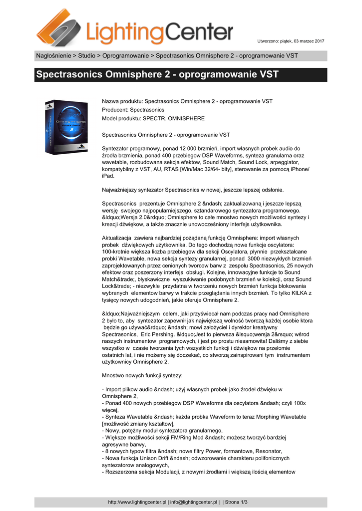 Utworzono: piątek, 03 marzec 2017 Nagłośnienie > Studio > Oprogramowanie > Spectrasonics Omnisphere 2 - oprogramowanie VST Spectrasonics Omnisphere 2 - oprogramowanie VST Nazwa produktu: Spectrasonics Omnisphere 2 - oprogramowanie VST Producent: Spectrasonics Model produktu: SPECTR. OMNISPHERE Spectrasonics Omnisphere 2 - oprogramowanie VST Syntezator programowy, ponad 12 000 brzmień, import własnych probek audio do źrodła brzmienia, ponad 400 przebiegow DSP Waveforms, synteza granularna oraz wavetable, rozbudowana sekcja efektow, Sound Match, Sound Lock, arpeggiator, kompatybilny z VST, AU, RTAS [Win/Mac 32/64- bity], sterowanie za pomocą iPhone/ iPad. Najważniejszy syntezator Spectrasonics w nowej, jeszcze lepszej odsłonie. Spectrasonics prezentuje Omnisphere 2 – zaktualizowaną i jeszcze lepszą wersję swojego najpopularniejszego, sztandarowego syntezatora programowego. “Wersja 2.0” Omnisphere to całe mnostwo nowych możliwości syntezy i kreacji dźwiękow, a także znacznie unowocześniony interfejs użytkownika. Aktualizacja zawiera najbardziej pożądaną funkcję Omnisphere: import własnych probek dźwiękowych użytkownika. Do tego dochodzą nowe funkcje oscylatora: 100-krotnie większa liczba przebiegow dla sekcji Oscylatora, płynnie przekształcane probki Wavetable, nowa sekcja syntezy granularnej, ponad 3000 niezwykłych brzmień zaprojektowanych przez cenionych tworcow barw z zespołu Spectrasonics, 25 nowych efektow oraz poszerzony interfejs obsługi. Kolejne, innowacyjne funkcje to Sound Match™, błyskawiczne wyszukiwanie podobnych brzmień w kolekcji, oraz Sound Lock™ - niezwykle przydatna w tworzeniu nowych brzmień funkcja blokowania wybranych elementow barwy w trakcie przeglądania innych brzmień. To tylko KILKA z tysięcy nowych udogodnień, jakie oferuje Omnisphere 2. “Najważniejszym celem, jaki przyświecał nam podczas pracy nad Omnisphere 2 było to, aby syntezator zapewnił jak największą wolność tworczą każdej osobie ktora będzie go używać” – mowi założyciel i dyrektor kreatywny Spectrasonics, Eric Pershing. “Jest to pierwsza ‘wersja 2’ wśrod naszych instrumentow programowych, i jest po prostu niesamowita! Daliśmy z siebie wszystko w czasie tworzenia tych wszystkich funkcji i dźwiękow na przełomie ostatnich lat, i nie możemy się doczekać, co stworzą zainspirowani tym instrumentem użytkownicy Omnisphere 2. Mnostwo nowych funkcji syntezy: - Import plikow audio – użyj własnych probek jako źrodeł dźwięku w Omnisphere 2, - Ponad 400 nowych przebiegow DSP Waveforms dla oscylatora – czyli 100x więcej, - Synteza Wavetable – każda probka Waveform to teraz Morphing Wavetable [możliwość zmiany kształtow], - Nowy, potężny moduł syntezatora granularnego, - Większe możliwości sekcji FM/Ring Mod – możesz tworzyć bardziej agresywne barwy, - 8 nowych typow filtra – nowe filtry Power, formantowe, Resonator, - Nowa funkcja Unison Drift – odwzorowanie charakteru polifonicznych syntezatorow analogowych, - Rozszerzona sekcja Modulacji, z nowymi źrodłami i większą ilością elementow http://www.lightingcenter.pl | [email protected] | | Strona 1/3 Utworzono: piątek, 03 marzec 2017 Nagłośnienie > Studio > Oprogramowanie > Spectrasonics Omnisphere 2 - oprogramowanie VST Spectrasonics Omnisphere 2 - oprogramowanie VST modulowanych, - Polifoniczne LFO i obwiednia modulacji, - Funkcja odwrocenia przebiegu Soundsource. Ponad 10,000 brzmień - Ponad 3,000 nowych brzmień i przebiegow soundsource od uznanych projektantow z zespołu Spectrasonics, - Nowa kolekcja Omnisphere EDM z masą nowoczesnych, modnych brzmień, - Nowe, ekskluzywne przebiegi [soundsource] od Diego Stocco Custom Built Instruments, - Nowa kategoria przebiegow Phrase Soundsources - do syntezy granularnej, - Setki nowych przebiegow Circuit Bent Soundsources, - Wiele nowatorskich przebiegow Psychoacoustic Soundsources, - Nowe przebiegi Melodic Cave Stalactites Soundsources, - …i dużo, dużo więcej! Nowy interfejs - Zmieniony, rozszerzony interfejs użytkownika z mnostwem nowych funkcjami, - Nowy panel Modulation z ustawieniami połączeń modulacji, po lewej stronie, - Nowa, dostępna przez cały czas mini przeglądarka, - Rozbudowana przeglądarka głowna [Browser], Wygodniejsze przeglądanie - Sound Match™ - funkcja błyskawicznego wyszukiwania podobnych brzmień w bibliotece barw, - Sound Lock™ - umożliwia nieograniczone tworzenie przydatnych odmian brzmienia, poprzez blokowanie wybranych elementow barwy w trakcie przeglądania, - Łatwa wymiana dźwiękow/projektow ze wspołpracownikami i na potrzeby kolekcji, - Usprawniony system organizacji brzmień, - Szybki auto podgląd/progresywne ładowanie brzmień przyspieszają przeglądanie, - Nowa kategoria przeglądania brzmień – Mood, - Rozszerzona ilość gatunkow muzycznych w kategorii Genre, - Przeglądanie według typu Oscylatora, - Logiczny system wyszukiwania. Nowe funkcje Arpeggiatora - Transpozycja nut do tworzenia patternow w stylu sekwencera krokowego, - Blokada patternu Arpeggiatora w trakcie przeglądania brzmień, - Regulacja Speed Offset pozwala zwolnić/przyspieszyć efekty, - Nowe możliwości modulacji. 25 nowych modułow efektowych: - Innerspace, - Quad Resonator, - Thriftshop Speaker, - Classic Twin, - Bassman, - Hi-Wattage, - Rock Stack, - Brit-Vox, http://www.lightingcenter.pl | [email protected] | | Strona 2/3 Utworzono: piątek, 03 marzec 2017 Nagłośnienie > Studio > Oprogramowanie > Spectrasonics Omnisphere 2 - oprogramowanie VST Spectrasonics Omnisphere 2 - oprogramowanie VST - Boutique, - San-Z-Amp, - Stompbox Modeler, - Metalzone Distortion, - Toxic Smasher, - Foxxy Fuzz, - Analog Phaser, - Analog Flanger, - Analog Chorus, - Analog Vibrato, - Solina Ensemble, - Vintage Tremolo, - Envelope Filter, - Crying Wah, - Stomp-Comp, - Precision Compressor, - Studio 2-Band EQ. Nowe możliwości sekcji FX: - 16 modułow FX na barwę, - Pełna matryca 