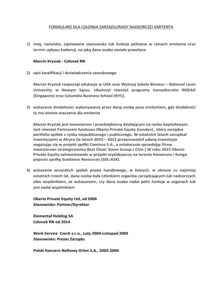 FORMULARZ DLA CZŁONKA ZARZĄDU/RADY NADZORCZEJ EMITENTA 1) imię, nazwisko, zajmowane stanowisko lub funkcje pełnione w ramach emitenta oraz termin upływu kadencji, na jaką dana osoba została powołana Marcin Krysiak -‐ Członek RN 2) opis kwalifikacji i doświadczenia zawodowego Marcin Krysiak rozpoczął edukacje w USA oraz Wyższej Szkole Biznesu – National Louis University w Nowym Sączu. Ukończył również programy menadżerskie INSEAD (Singapore) oraz Columbia Business School (NYC). 3) wskazanie działalności wykonywanej przez daną osobę poza emitentem, gdy działalność ta ma istotne znaczenie dla emitenta Marcin Krysiak jest inwestorem i przedsiębiorcą działającym na rynku kapitałowym. Jest również Partnerem funduszu Oberio Private Equity (Londyn) , który zarządza portfolio spółek z rynku niepublicznego i publicznego. W ostatnich latach zarządzał inwestycjami w Afryce (w latach 2010 – 2012 przeprowadził udaną inwestycje angażując się w projekt spółki Caminco S.A., a ostatecznie sprzedając firmę inwestorowi strategicznemu Best Cheer Stone Group z Chin.) W roku 2015 Oberio Private Equity zainwestowało w projekt wydobywczy na terenie Kamerunu i Kongo poprzez społkę Sundance Resources (SDL:ASX). 4) wskazanie wszystkich spółek prawa handlowego, w których, w okresie co najmniej ostatnich trzech lat, dana osoba była członkiem organów zarządzających lub nadzorczych albo wspólnikiem, ze wskazaniem, czy dana osoba nadal pełni funkcje w organach lub jest nadal wspólnikiem Oberio Private Equity Ltd, od 2006 Stanowisko: Partner/Dyrektor Elemental Holding SA Członek RN od 2014 Work Service Czech s.r.o., Luty 2004-‐Listopad 2005 Stanowisko: Prezes Zarządu Polski Koncern Naftowy Orlen S.A., 2002-‐2004 Biuro Ds. Integracji z Holdingiem Unipetrol , Zespół Doradców Prezesa Zarządu/Biuro ds. Relacji Korporacyjnych Winda Internet Sp. Z o.o (firma zajmująca się WebDesign), 2000-‐2002 Stanowisko: Dyrektor Zarządzający, Współwłaściciel 5) informacje na temat prawomocnych wyroków, na mocy których dana osoba została skazana za przestępstwa oszustwa w okresie co najmniej ostatnich pięciu lat oraz wskazanie, czy w okresie co najmniej ostatnich pięciu lat osoba taka otrzymała sądowy zakaz działania jako członek organów zarządzających lub nadzorczych w spółkach prawa handlowego NIE DOTYCZY 6) szczegóły wszystkich przypadków upadłości, zarządu komisarycznego lub likwidacji, w okresie co najmniej ostatnich pięciu lat, w odniesieniu do podmiotów, w których dana osoba pełniła funkcje członka organu zarządzającego lub nadzorczego NIE DOTYCZY 7) informację, czy dana osoba prowadzi działalność, która jest konkurencyjna w stosunku do działalności emitenta, oraz czy jest wspólnikiem konkurencyjnej spółki cywilnej lub osobowej albo członkiem organu spółki kapitałowej lub członkiem organu jakiejkolwiek konkurencyjnej osoby prawnej NIE 8) informację, czy dana osoba figuruje w rejestrze dłużników niewypłacalnych, prowadzonym na podstawie ustawy z dnia 20 sierpnia 1997 r. o Krajowym Rejestrze Sądowym NIE
