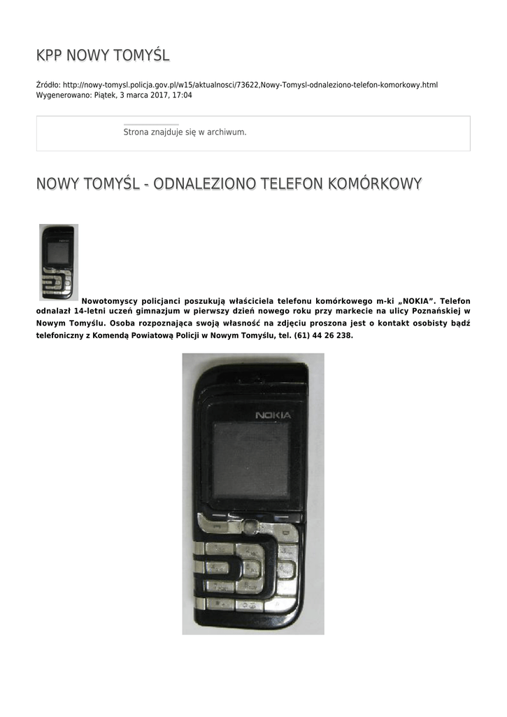 KPP NOWY TOMYŚL Źródło: http://nowy-tomysl.policja.gov.pl/w15/aktualnosci/73622,Nowy-Tomysl-odnaleziono-telefon-komorkowy.html Wygenerowano: Piątek, 3 marca 2017, 17:04 Strona znajduje się w archiwum. NOWY TOMYŚL - ODNALEZIONO TELEFON KOMÓRKOWY Nowotomyscy policjanci poszukują właściciela telefonu komórkowego m-ki „NOKIA”. Telefon odnalazł 14-letni uczeń gimnazjum w pierwszy dzień nowego roku przy markecie na ulicy Poznańskiej w Nowym Tomyślu. Osoba rozpoznająca swoją własność na zdjęciu proszona jest o kontakt osobisty bądź telefoniczny z Komendą Powiatową Policji w Nowym Tomyślu, tel. (61) 44 26 238. Ocena: 0/5 (0) Tweetnij