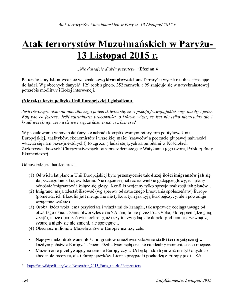 Atak terrorystów Muzułmańskich w Paryżu- 13 Listopad 2015 r. Atak terrorystów Muzułmańskich w Paryżu13 Listopad 2015 r. „Nie dawajcie diabłu przystępu ”Efezjan 4 Po raz kolejny Islam wdał się we znaki...zwykłym obywatelom. Terroryści wyszli na ulice strzelając do ludzi. Wg obecnych danych1, 129 osób zginęło, 352 rannych, a 99 znajduje się w natychmiastowej potrzebie modlitwy i Bożej interwencji. (Nie tak) ukryta polityka Unii Europejskiej i globalizmu. Jeśli otworzysz okno na noc, dlaczego potem dziwisz się, ze w pokoju fruwają jakieś ćmy, muchy i jeden Bóg wie co jeszcze. Jeśli zatrudniasz pracownika, o którym wiesz, ze jest nie tylko nierzetelny ale i kradł wcześniej, czemu dziwisz się, ze kasa znika ci z biznesu? W poszukiwaniu winnych daliśmy się nabrać skomplikowanym retorykom polityków, Unii Europejskiej, analityków, ekonomistów i wszelkiej maści 'znawców' a poczucie głupawej naiwności wtłacza się nam przez(niektórych!) (o zgrozo!) ludzi stojących za pulpitami w Kościołach Zielonoświątkowych/ Charyzmatycznych oraz przez demagoga z Watykanu i jego tworu, Polskiej Rady Ekumenicznej. Odpowiedz jest bardzo prosta. (1) Od wielu lat planem Unii Europejskiej było przemycenie tak dużej ilości imigrantów jak się da, szczególnie z krajów Islamu. Nie dajcie się nabrać na wielkie gadające głowy, ich plany odnośnie 'migrantów' i żalące się glosy...Konflikt wojenny tylko sprzyja realizacji ich planów... (2) Imigranci maja zdestabilizować (wg speców od sztucznego kreowania społeczeństw) Europe (ponieważ ich filozofia jest niezgodna nie tylko z tym jak żyją Europejczycy, ale i powoduje wzajemne waśnie). (3) Osoba, która wola: ćma przyleciała i wlazła mi do kanapki, tak naprawdę odciąga uwagę od otwartego okna. Czemu otworzyłeś okno? A tam, to nie przez to... Osoba, której pieniądze giną z sejfu, może obarczać wina ochronę, aż uszy im zwiędną, ale dopóki problem jest wewnątrz, sytuacja nigdy się nie zmieni, ale spotęguje... (4) Obecność milionów Muzułmanów w Europie ma trzy cele: • • Napływ niekontrolowanej ilości migrantów umożliwia założenie siatki terrorystycznej w każdym państwie Europy. 'Uśpieni' Dżihadyści będą czekać na idealny moment, czas i miejsce. Muzułmanie przebywający na terenie Europy czy USA będą indoktrynować nie tylko tych co chodzą do meczetu, ale i Europejczyków. Liczne przypadki pochodzą z Europy jak i USA. 1 https://en.wikipedia.org/wiki/November_2015_Paris_attacks#Perpetrators 1z4 AntyEkumenia, Listopad 2015. Atak terrorystów Muzułmańskich w Paryżu- 13 Listopad 2015 r. • Muzułmanie praktykują poligamie, stad rozmnażają się w zastraszającym tempie. Muzułmanie kupują zamknięte kościoły kościoła Anglii. W Wielkiej Brytanii zamknięto 2 między 2008-2013 324 budynki kościoła Anglii, 76 budynków baptystów, 813 budynków metodystów, 183 Prezbiterian, natomiast Zielonoświątkowcy otwarli aż 640 nowych zborów. Kościół Anglii ma tak małe uczęszczanie, ze rozważają otwieranie niektórych budynków tylko podczas tzw Bożego Narodzenia!3 Czyż nie są to Biblijne skutki apostazji i ekumenizmu z papiestwem? Zauważmy, ze część Islamistów, którzy zaatakowali paryżan, było z Europy, przynajmniej jeden przyjechał jako migrant do Grecji! Problemem jest fakt, iż Unia Europejska umożliwia operowanie tym terrorystom i dopóki Islam nie zostanie zniesiony z krajów Europy, dopóty terroryzm będzie miał miejsce i sytuacja, która wydarzyła się po raz kolejny we Francji, będzie miała miejsce również w innych państwach Europy! Jeśli więc usłyszysz o biegającym, może uśmiechniętym terroryście, który nagle strzela do przechodniów, wołającym coś po arabsku, to wiedz gdzie leży problem! Wyobraź sobie jaki zamęt wywoła sytuacja, gdy setki terrorystów otwierają ogień na przechodniów pewnego zwykłego dnia...w 20 krajach Europy! Masowa trauma, mająca wywołać PTSD(Zespół stresu pourazowego) i większa podatność pod nieracjonalne działanie Unii Europejskiej? Co zrobią głowy państw i politycy? To, ze ktoś się zaprzedał ideologii globalistycznej można poznać gdy przemowę po ataku zaczyna od: To nie jest Islam. Ogłupianie społeczeństw Europy kiedyś się skończy... Jeśli wydarzy się to w Polsce, to nie wdawaj się w rzewne wyjaśnienia z pulpitu...Swój palec skieruj do Aliansu Ewangelicznego...Zielonoświątkowcy, piszcie do biskupa KZ, Marka Kamińskiego a Kościół Boży w Chrystusie, do pana Nedzusiaka.... Widzicie demagoga z Watykanu, jak jest osowiały i pochmurny, oglądasz patriotyczne przyrzeczenia: to jest akt wojny! Obama kieruje wyrazy współczucia ofiarom...Wstań i zapytaj: A co z Islamem? Kiedy weźmiecie się za KORZEN tych krwiożerczych ataków! Jak zmieni się psychika ludzi z Europy, gdy będą oglądać rzez na ich znajomych, bliskich i sąsiadach...na ulicy? Efekt pana Hilarego...Sypianie z wrogiem... Jeśli chodzisz dookoła chwasta, jeśli budujesz mu altankę, jeśli słodko mówisz- tylko nie zasłaniaj mi roślinek na działce, dobrze(?) to oszukujesz samego siebie i szukasz urojonych przyczyn naokoło. Ubolewające rodziny we Francji muszą zobaczyć źródło chwastu, i go wyplenić. Nie da się zmienić natury chwasta. Nie można oddzielić Islamu od Koranu. Oni tak myślą, oni 2 http://www.eauk.org/church/research-and-statistics/how-many-churches-have-opened-or-closed-in-recent-years.cfm 3 http://www.theguardian.com/world/2015/oct/14/church-of-england-predicts-rise-part-time-churches-attendance-plummet 2z4 AntyEkumenia, Listopad 2015. Atak terrorystów Muzułmańskich w Paryżu- 13 Listopad 2015 r. tak są wychowywani, oni tak patrzą na ciebie. Islam był obecny w Europie już wcześniej. Poczytaj o Hiszpanii(Rekonkwista) oraz o Włoszech(Saraceni, Emirat Sycylii itd). Dziś Illuminacka Unia Europejska chce ich przemycić by wywołać kolejna wojnę. Un