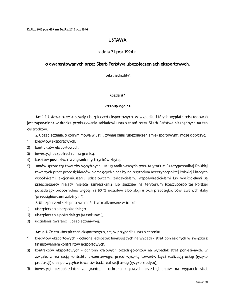 Dz.U. z 2015 poz. 489 zm. Dz.U. z 2015 poz. 1844 USTAWA z dnia 7 lipca 1994 r. o gwarantowanych przez Skarb Państwa ubezpieczeniach eksportowych. (tekst jednolity) Rozdział 1 Przepisy ogólne Art. 1. 1. Ustawa określa zasady ubezpieczeń eksportowych, w wypadku których wypłata odszkodowań jest zapewniona w drodze przekazywania zakładowi ubezpieczeń przez Skarb Państwa niezbędnych na ten cel środków. 2. Ubezpieczenie, o którym mowa w ust. 1, zwane dalej "ubezpieczeniem eksportowym", może dotyczyć: 1) kredytów eksportowych, 2) kontraktów eksportowych, 3) inwestycji bezpośrednich za granicą, 4) kosztów poszukiwania zagranicznych rynków zbytu, 5) umów sprzedaży towarów wysyłanych i usług realizowanych poza terytorium Rzeczypospolitej Polskiej zawartych przez przedsiębiorców niemających siedziby na terytorium Rzeczypospolitej Polskiej i których wspólnikami, akcjonariuszami, udziałowcami, założycielami, współwłaścicielami lub właścicielami są przedsiębiorcy mający miejsce zamieszkania lub siedzibę na terytorium Rzeczypospolitej Polskiej posiadający bezpośrednio więcej niż 50 % udziałów albo akcji u tych przedsiębiorców, zwanych dalej "przedsiębiorcami zależnymi". 3. Ubezpieczenie eksportowe może być realizowane w formie: 1) ubezpieczenia bezpośredniego, 2) ubezpieczenia pośredniego (reasekuracji), 3) udzielenia gwarancji ubezpieczeniowej. Art. 2. 1. Celem ubezpieczeń eksportowych jest, w przypadku ubezpieczenia: 1) kredytów eksportowych - ochrona jednostek finansujących na wypadek strat poniesionych w związku z finansowaniem kontraktów eksportowych, 2) kontraktów eksportowych - ochrona krajowych przedsiębiorców na wypadek strat poniesionych, w związku z realizacją kontraktu eksportowego, przed wysyłką towarów bądź realizacją usług (ryzyko produkcji) oraz po wysyłce towarów bądź realizacji usług (ryzyko kredytu), 3) inwestycji bezpośrednich za granicą - ochrona krajowych przedsiębiorców na wypadek strat Strona 1 z 11 poniesionych w związku z realizacją inwestycji bezpośredniej za granicą, 4) kosztów poszukiwania zagranicznych rynków zbytu - ochrona krajowych przedsiębiorców na wypadek uzasadnionych kosztów i wydatków poniesionych w związku z poszukiwaniem zagranicznych rynków zbytu, 5) umów sprzedaży zawartych przez przedsiębiorców zależnych - ochrona przedsiębiorców zależnych na wypadek strat poniesionych w związku ze sprzedażą poza terytorium Rzeczypospolitej Polskiej towarów i usług, które stanowiły towary lub usługi krajowe. 2. Celem gwarancji ubezpieczeniowej jest umożliwienie krajowym przedsiębiorcom zawarcia i realizacji kontraktów eksportowych. 3. Ochrona ubezpieczeniowa z tytułu ubezpieczeń eksportowych, o których mowa w ust. 1, nie obejmuje utraconych korzyści ani innych szkód pośrednich poniesionych przez ubezpieczającego, chyba że w umowie ubezpieczenia eksportowego postanowiono inaczej. 4. Ubezpieczenie kredytów eksportowych obejmuje szkody poniesione przez jednostkę finansującą, w związku z finansowaniem kontraktu eksportowego, jeżeli szkody te są następstwem zdarzeń określonych jako: 1) ryzyko handlowe, 2) ryzyko polityczne, 3) ryzyko nierynkowe. 5. Ubezpieczenie kontraktów eksportowych obejmuje szkody poniesione przez ubezpieczającego w wyniku niemożności wykonania kontraktu eksportowego bądź w wyniku niewykonania lub nienależytego wykonania kontraktu eksportowego przez kontrahenta zagranicznego, jeżeli szkody te są następstwem zdarzeń określonych jako: 1) ryzyko handlowe, 2) ryzyko polityczne, 3) ryzyko nierynkowe. 6. Ubezpieczenie inwestycji bezpośrednich za granicą obejmuje szkody poniesione przez ubezpieczającego w wyniku realizacji inwestycji bezpośredniej za granicą, jeżeli szkody te są następstwem zdarzeń określonych jako ryzyko polityczne. 7. Ubezpieczenie kosztów poszukiwania zagranicznych rynków zbytu obejmuje uzasadnione koszty i wydatki poniesione w związku z poszukiwaniem zagranicznych rynków zbytu na wypadek niezawarcia z kontrahentem zagranicznym na danym rynku zamierzonego kontraktu eksportowego z przyczyn niezależnych od przedsiębiorcy krajowego. 8. Ubezpieczenie umów sprzedaży zawartych przez przedsiębiorców zależnych obejmuje szkody poniesione przez ubezpieczającego wynikające z niemożności wykonania umowy sprzedaży bądź z niewykonania lub nienależytego wykonania umowy przez kontrahenta, pod warunkiem że szkody te są następstwem zdarzeń określonych jako: 1) ryzyko handlowe, 2) ryzyko polityczne, 3) ryzyko nierynkowe. 9. Minister właściwy do spraw finansów publicznych określa, w drodze rozporządzenia, definicje ryzyka Strona 2 z 11 handlowego, politycznego i nierynkowego, mając na uwadze konieczność uwzględnienia rodzaju i zakresu ryzyka w umowach objętych ubezpieczeniem eksportowym. Art. 3. 1. Ubezpieczenie eksportowe dotyczy ryzyka handlowego i politycznego, jeżeli kontrakt został zawarty na okres kredytu dwóch lub więcej lat. 2. Ubezpieczenie eksportowe dotyczy ryzyka nierynkowego, jeżeli kontrakt został zawarty na okres kredytu poniżej dwóch lat. 3. Ubezpieczenie eksportowe może dotyczyć ryzyka związanego ze zmianami kursów walutowych. Art. 4. W sytuacjach uzasadnionych ważnym interesem gospodarczym Rada Ministrów, w drodze rozporządzenia, może wyrazić zgodę na ubezpieczenia kontraktów eksportowych od innego ryzyka niż wymienione w art. 2 i 3. Rozdział 2 Przepisy szczegółowe Art. 5. 1. Prowadzenie działalności w zakresie ubezpieczeń eksportowych, na warunkach określonych ustawą, powierza się Korporacji Ubezpieczeń Kredytów Eksportowych Spółka Akcyjna, zwanej dalej "Korporacją". 2. Korporacja prowadzi działalność, o której mowa w ust. 1, i udziela gwarancji ubezpieczeniowych w imieniu własnym. 3. Członków Zarządu Korporacji powołuje i odwołuje Walne Zgromadzenie Akcjonariuszy Korporacji. 4. Do umów zawieranych w zakresie uregulo