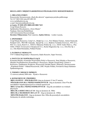 REGULAMIN I MIĘDZYNARODOWEGO PÓŁMARATONU RZESZOWSKIEGO 1. ORGANIZATORZY: Rzeszowskie Stowarzyszenie „Ruch dla zdrowia” organizacja pożytku publicznego Tel. 017 860 4140, kom.695 608 103 www.ruchdlazdrowia.org e-mail: [email protected] nr konta: 39 1020 4391 0000 6102 0002 7623 Urząd Miasta Rzeszów Spółdzielnia Mieszkaniowa „Nowe Miasto” Fundacja Aktywnej Rehabilitacji AZS Uniwersytetu Rzeszowskiego Dyrektor Półmaratonu: Piotr Latawiec, Sędzia Główny – Lesław Lassota, 2. SPONSORZY Urząd Miasta Rzeszowa, Comp S.A., Budpol sp. z o.o., New Balance/Tarmax, Antoni NiemczakProSport USA, PKO BP, Gatorade, Specjał Sp. z o.o., Buderus-Technika Grzewcza , PZU S.A., PZU S.A. Życie, Ruch S.A., TESCO, Makarony Polskie Sp. z o.o., NZOZ Andro-Med s.c., Plus GSM, UNIQA Towarzystwo Ubezpieczeń S.A., Roche Diagnostics Sp. z o.o., Orto-Res Sp. z o.o., Otto Back/Ortomedica, Polfam Poznań. 3. PATRONAT MEDIALNY TVP 3 Oddział Regionalny w Rzeszowie, Radio Rzeszów, Super Nowości, 4. INSTYTUCJE WSPÓŁPRACUJĄCE Komenda Miejska i Komenda Wojewódzka Policji w Rzeszowie, Straż Miejska w Rzeszowie, Miejskie Przedsiębiorstwo Komunikacji w Rzeszowie, Miejski Zarząd Dróg i Zieleni w Rzeszowie, Żandarmeria Wojskowa, Rzeszowski Ośrodek Sportu i Rekreacji, Stowarzyszenie „Wspólnota Polska”- Oddział Rzeszowski, ZHP, Wojsko Polskie, Powiatowa Stacja SanitarnoEpidemiologiczna, 5. TERMIN I MIEJSCE IMPREZY 12 czerwca (sobota) 2004 roku – Rynek w Rzeszowie 6. KONKURENCJE I PRZEBIEG BIEG GŁOWNY - PÓŁMARATON -bieg na dystansie 21 km 97 metrów PÓŁMARATON DLA NIEPEŁNOSPRAWNYCH - bieg na dystansie 21km 97m dla zawodników niepełnosprawnych na wózkach sportowych BIEG 3,5 km DLA NIEPEŁNOSPRAWNYCH – bieg dla zawodników na wózkach aktywnych BIEG DLA DZIECI DO LAT 10 - bieg na dystansie ok. 500m BIEG DLA MŁODZIEŻY DO LAT 15 – bieg na dystansie ok. 1500m MINI PÓŁMARATON - bieg na dystansie 2km 100m dla pozostałych zawodników. Zachęcamy do udziału rodzinnego. START i META na Rynku obok Ratusza. Trasa płaska, asfaltowa po ulicach Rzeszowa. Start: - 8:45 - Półmaraton dla niepełnosprawnych, - limit czasu 3 godz. 30 min - 9:00 - Bieg główny (Półmaraton), - limit czasu 3 godz. - 9:10 - Bieg dla dzieci do lat 10 (500m), - limit czasu 15 min - 9:30 - Bieg dla młodzieży do lat 15 (1500m) - limit czasu 30min - 9:45 - Bieg 3,5km dla zawodników na wózkach aktywnych - limit czasu 1 godzina - 10:00- Minipółmaraton(2100m) - limit czasu 1 godzina UWAGA: zawodnicy biegu głównego którzy nie ukończą fragmentu trasy dwupasmowej (skrzyżowanie Al.Powst.W-wy i ul. Podwisłocze – przed zaporą) po 2 godzinach od startu zostaną zdjęci z trasy przez organizatora. Po tym czasie organizator nie ponosi żadnej odpowiedzialności za zawodników pozostających na trasie, którzy zobowiązani są ( w razie odmowy zejścia z trasy) do przestrzegania wszelkich prawideł ruchu ulicznego. 7. BIURO ZAWODÓW w Domu Polonii ul. Rynek 19 na parterze, będzie czynne dla uczestników: - 11.06.04 (piątek) od 15 do 21.00 i 12.06.04 (sobota) od 6.30 do 8.00 8. UCZESTNICTWO W I-szym Międzynarodowym Półmaratonie Rzeszowskim zgodnie z kategoriami biegowymi . W biegu głównym mogą uczestniczyć osoby pełnoletnie, które dokonają zgłoszenia w biurze zawodów, dokonają opłaty startowej oraz okażą podczas weryfikacji zaświadczenie o stanie zdrowia. Za osobę pełnoletnią uważa się osobę, która ukończy 18 lat do dnia 11.06.2004. UWAGA: Warunkiem dopuszczenia do biegu jest posiadanie numeru startowego, przypiętego z przodu na wysokości klatki piersiowej. 9. ZGŁOSZENIE DO BIEGU - elektronicznie: formularz na stronie : www.ruchdlazdrowia.org - telefonicznie: 86-04-140, (695) 608-103 do godz. 13.00 w piątek (11.06.04) - listownie na adres organizatora: Krystyna Kret, „Ruch dla Zdrowia” ul. Zamkowa 8, 35-032 Rzeszów Zgłoszenie powinno zawierać: - imię i nazwisko - datę urodzenia - narodowość - adres do korespondencji - ulica, nr, nr domu, kod pocztowy, miejscowość - E-mail (koniecznie!) 10. OPŁATA STARTOWA - w półmaratonie wynosi: 20 złotych - dla osób, zgłaszających się i dokonujących wpłaty przelewem bankowym do 04.06.2004 r. Po tym terminie oraz w dniu imprezy opłata wyniesie 30 złotych. Wpłat należy dokonywać na konto: PKO BP 39102043910000610200027623, lub gotówką w dniach 11.06 i 12.06 w biurze zawodów podczas weryfikacji. Opłata startowa nie podlega zwrotowi bez względu na okoliczności. Niepełnosprawni i osoby po 65 roku życia (za okazaniem dowodu tożsamości) są zwolnieni z opłaty startowej. Udział w pozostałych biegach bezpłatnie dla wszystkich!!! 11. PAKIET UCZESTNIKA Uczestnicy półmaratonu (również niepełnosprawni) otrzymają: - medal pamiątkowy i dyplom ukończenia - numer startowy i agrafki - worek na odzież do przechowalni - koszulkę - możliwość skorzystania z bezpłatnego noclegu w Hali na Podpromiu (zawodnik powinien posiadać własną karimatę i śpiwór) - wolny wstęp na odkrytą pływalnię miejską (prysznice, baseny) w dniu biegu Uczestnicy pozostałych biegów otrzymają koszulki, i upominki 12. CHIPY Pobierana będzie kaucja 50 zł za wydanie chipa. Kaucja będzie zwracana natychmiast po biegu po oddaniu chipa. 13. KLASYFIKACJA W I-szym Rzeszowskim Międzynarodowym Półmaratonie, prowadzona będzie następująca klasyfikacja: I. Półmaraton dla niepełnosprawnych a. klasyfikacja generalna II. Półmaraton – bieg główny a. generalna dla kobiet b. generalna dla mężczyzn c. w kategoriach wiekowych: M20, K20, M30, K30, M40, K40, M50, K50 i powyżej M60, M70 i powyżej 14. NAGRODY NAGRODA GŁÓWNA: pobyt w ośrodku przygotowań olimpijskich: The Center for High Altitude Training w USA i udział w pół/maratonie w Las Vegas w 2005r. – zostanie wylosowana wśród uczestników, którzy ukończą bieg główny w regulaminowym czasie. Nagrodzona osoba musi być zgłosić się osobiście po potwierdzen