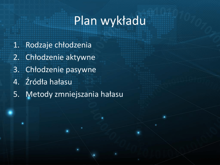 Plan wykładu 1. 2. 3. 4. 5. Rodzaje chłodzenia Chłodzenie aktywne Chłodzenie pasywne Źródła hałasu Metody zmniejszania hałasu Rodzaje chłodzenia Współczesne komputery wydzielają duże ilości ciepła, dlatego wymagają intensywnego chłodzenia. Zatrzymanie pracy chłodzenia lub jego brak w układach, w których były przewidziane, może spowodować ich uszkodzenie na skutek przegrzania. Rodzaje chłodzenia: chłodzenie pasywne - radiatory - heat pipe chłodzenie aktywne - wentylatory - chłodzenie wodne Chłodzenie pasywne Chłodzenie pasywne nie jest często spotykane, gdyż użycie go w komputerach jest bardzo problematyczne, ze względu na jego stosunkowo niską wydajność. Coraz częściej zdarzają się jednak konstrukcje, umożliwiające pasywne chłodzenie niektórych komponentów komputera. Chłodzenie pasywne radiatorem Radiator jest elementem o dużej powierzchni wykonanym z materiału dobrze przewodzącego ciepło. Dzięki swoim właściwościom może łatwo odbierać ciepło między innymi z procesora i łatwo je oddawać do otaczającego powietrza. Chłodzenie pasywne płynem Heat Pipe - jest rurką pozbawioną powietrza i wypełnioną niewielką ilością płynu. Płyn przy nieznacznym podgrzaniu absorbuje ciepło, zmienia się w parę i unosi do drugiego końca rurki, dzięki czemu doskonale odprowadza ciepło. Ciepłowody są stosowane zazwyczaj w systemach chłodzenia kart graficznych. Chłodzenie aktywne wentylatorem Wentylator wymusza ruch powietrza w pobliżu powierzchni, na której jest zamontowany, zwiększając odprowadzanie z niego ciepła. W starszych układach płyt głównych wentylator ma stałą prędkość obrotową, a w nowszych może być regulowany lub włączać się po osiągnięciu przez układ określonej temperatury i jego obroty zależą od temperatury układu Chłodzenie aktywne wodą Chłodzenie wodne polega na chłodzeniu elementów mechanicznych lub elektronicznych przy użyciu układów, w których medium transportującym ciepło jest specjalny płyn chłodniczy. System chłodzenia wodnego, niezależnie od miejsca zastosowania składa się zawsze z następujących elementów: Bloków chłodzących - wymienników ciepła Chłodnicy, która również jest wymiennikiem ciepła Pompy, która wymusza kontrolowany obieg płynu Zbiornika wyrównującego Układu rur, które łączą ze sobą pompę, bloki chłodzące, chłodnicę, zbiornik wyrównawczy Źródła hałasu Głównymi źródłami hałasu w zestawie komputerowym są: wentylator radiatora aktywnego montowanego na mikroprocesorze, wentylator zasilacza, wentylator radiatora aktywnego karty graficznej, dodatkowy wentylator montowany na obudowie, wentylator aktywnego radiatora chipsetu (rzadko spotykany, częściej są to radiatory pasywne), działające napędy typu twardy dysk i napędy optyczne, wpadające w rezonans elementy obudowy komputerowej. Metody zmniejszania hałasu Do najprostszych metod zmniejszania hałasu emitowanego przez zestawy chłodzące można zaliczyć: zastosowanie mat wygłuszających wewnątrz obudowy komputerowej, zastosowanie gumowych elementów mocowania napędów, które zmniejszają przenoszenie wibracji. Metody zmniejszania hałasu cd. Bardziej wyrafinowanych metod zmniejszania emisji hałasu: wyeliminowanie tam, gdzie to możliwe, radiatorów aktywnych z wentylatorami i zastąpienie ich radiatorami pasywnymi, o większej powierzchni czynnej (zasilacze, mikroprocesory, chipsety); zamiana małych wentylatorów wysokoobrotowych dużymi wentylatorami niskoobrotowymi emitującymi mniejszy hałas (zasilacze); zastosowanie jednego dużego radiatora obejmującego swoją powierzchnią większość nadmiernie nagrzewających się układów i chłodzenie ich za pomocą jednego wentylatora (karty graficzne, płyty w formacie BTX); chłodzenie cieczą: • chłodzenie wodne (mikroprocesory, układy graficzne), • heat pipe (mikroprocesory, układy graficzne, chipsety).